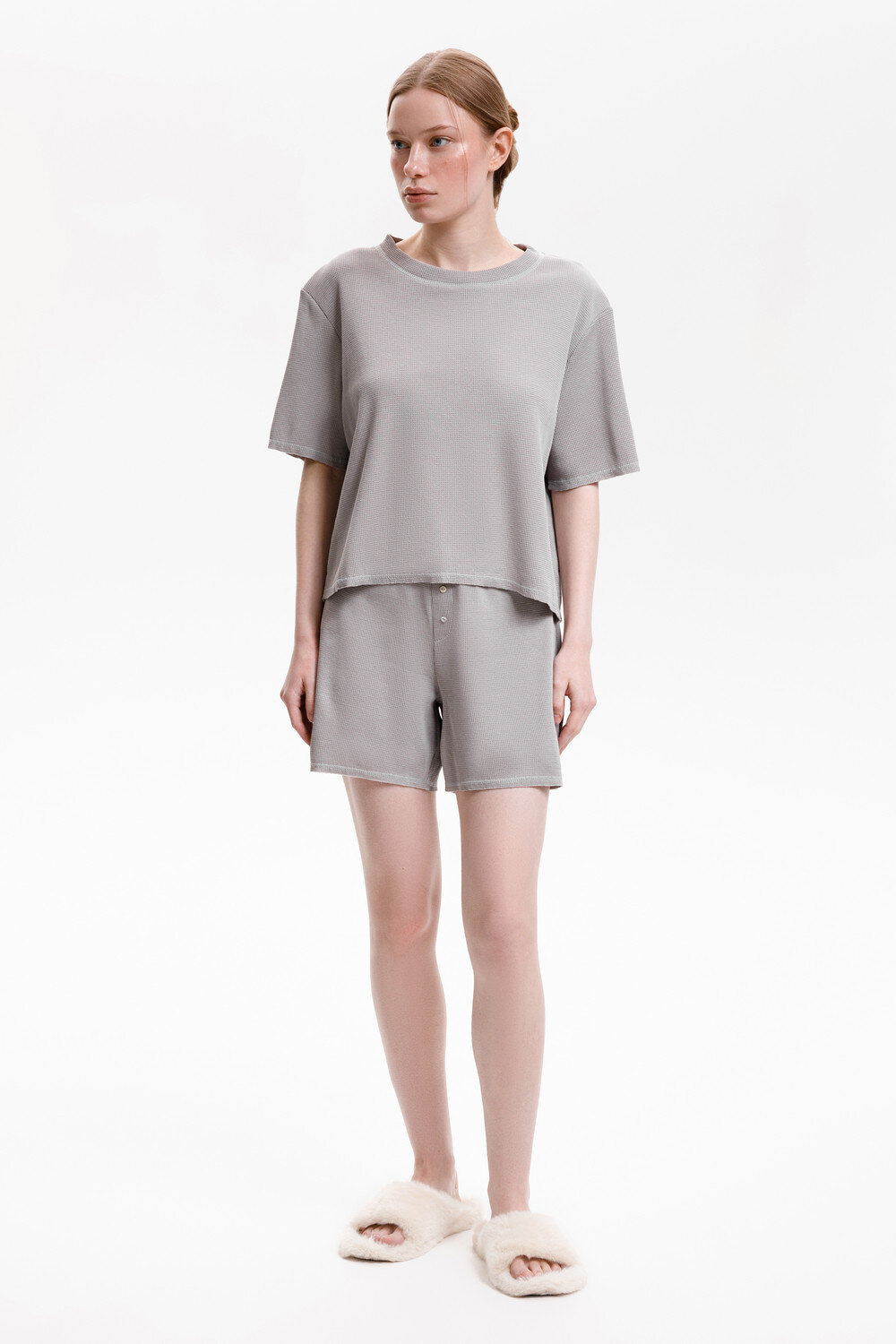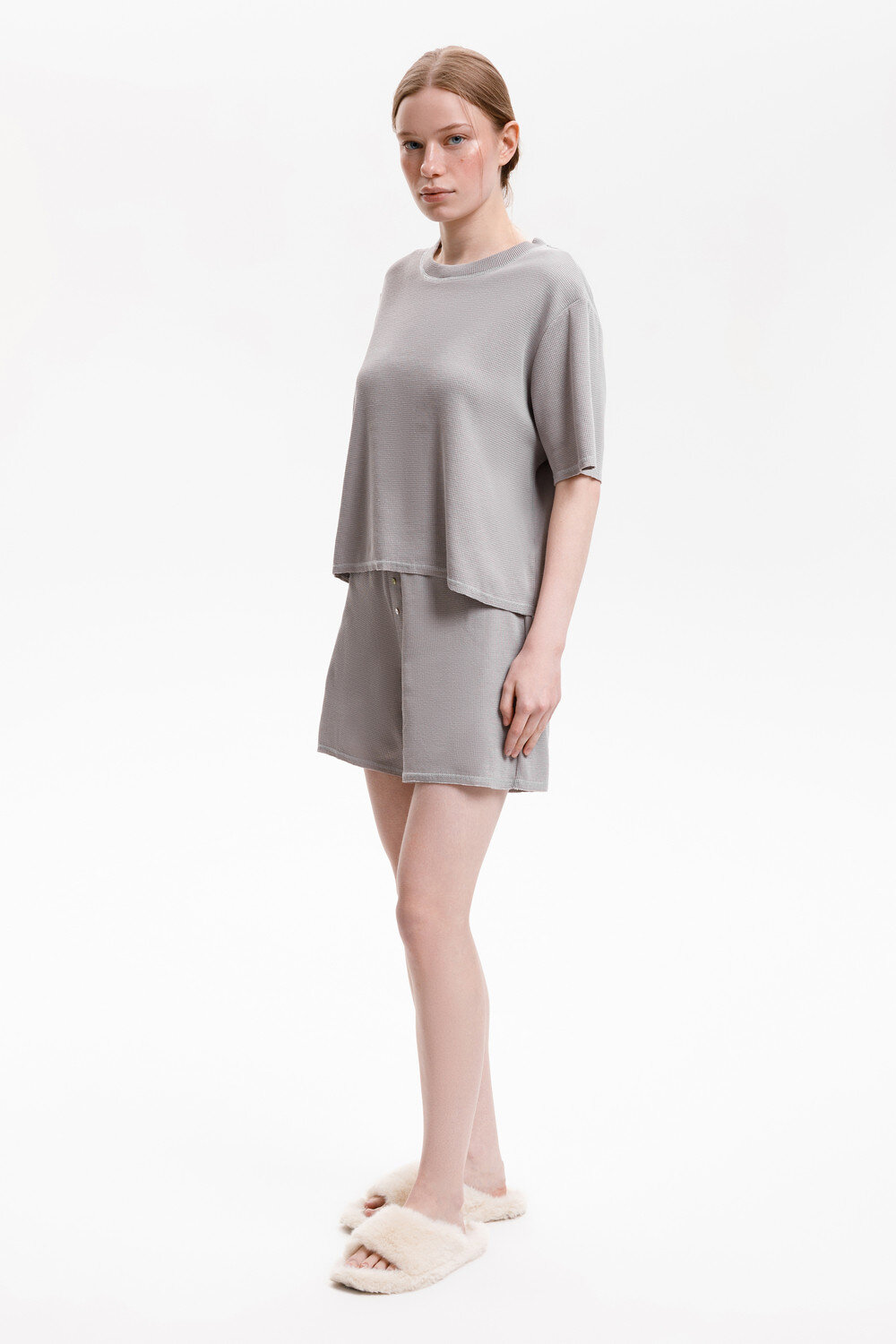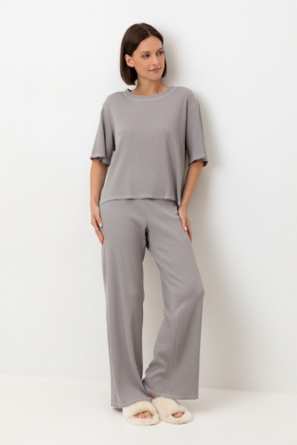 Комплект из объемного трикотажа с добавлением эластичных волокон. Свободный силуэт и мягкий пояс обеспечат комфорт во время сна и отдыха.