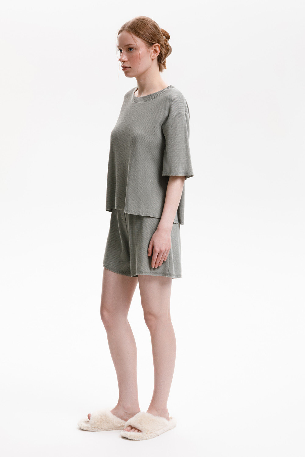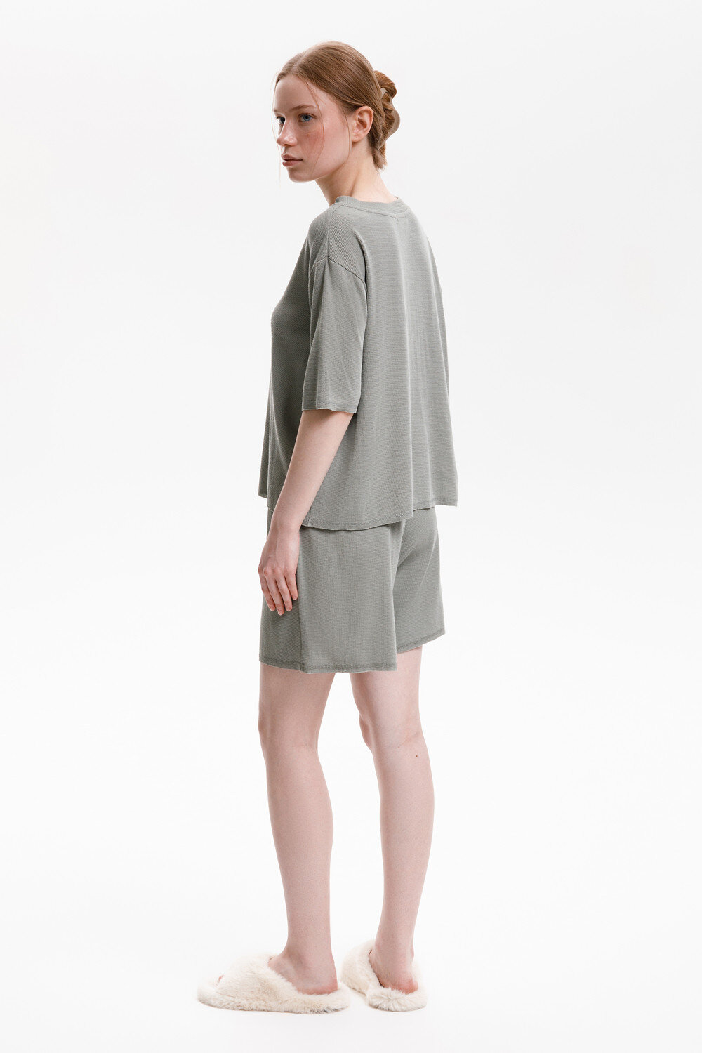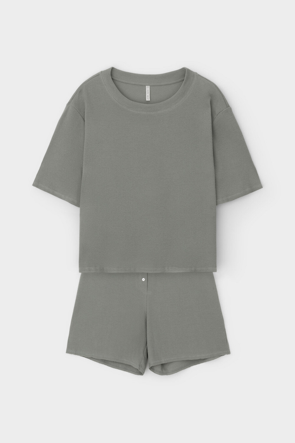 Комплект из объемного трикотажа с добавлением эластичных волокон. Свободный силуэт и мягкий пояс обеспечат комфорт во время сна и отдыха.
