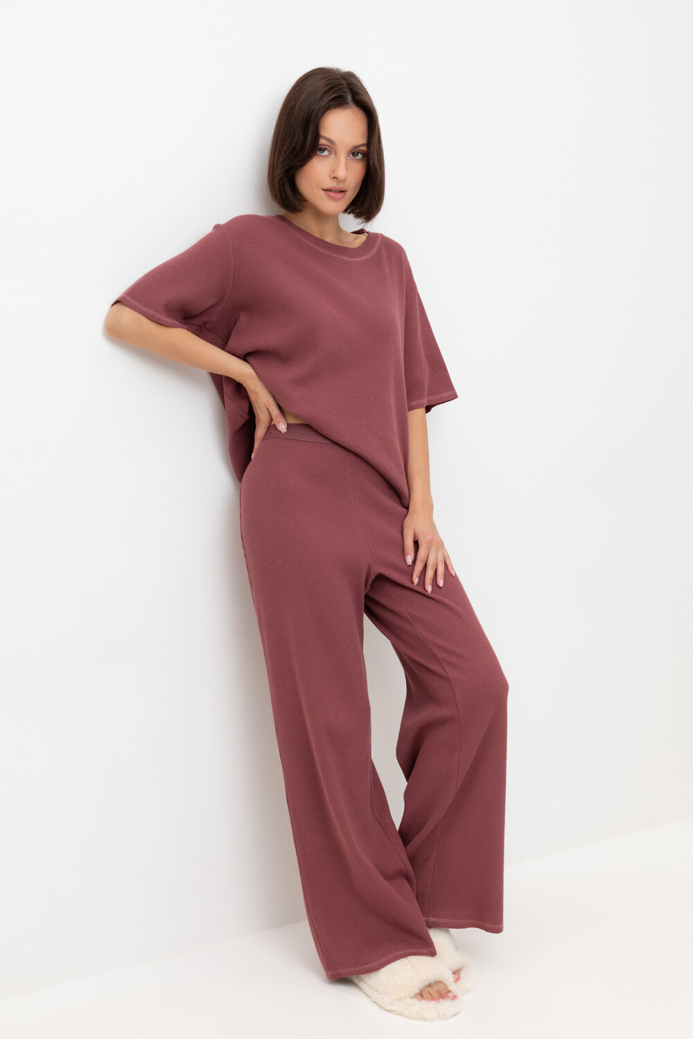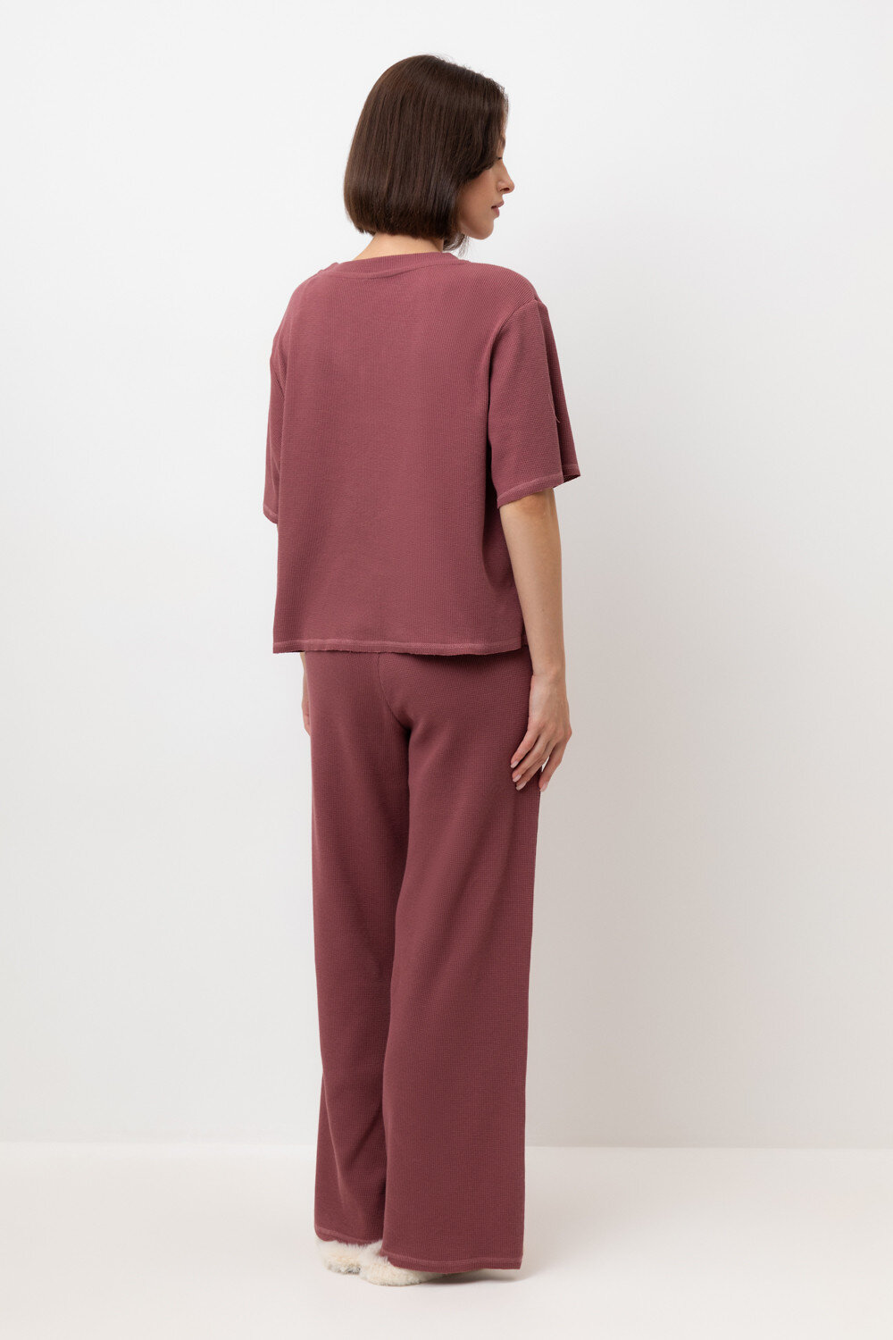 Комплект из объемного трикотажа с добавлением эластичных волокон. Свободный силуэт, мягкий пояс и отсутствие боковых швов на брюках обеспечат комфорт во время сна и отдыха.