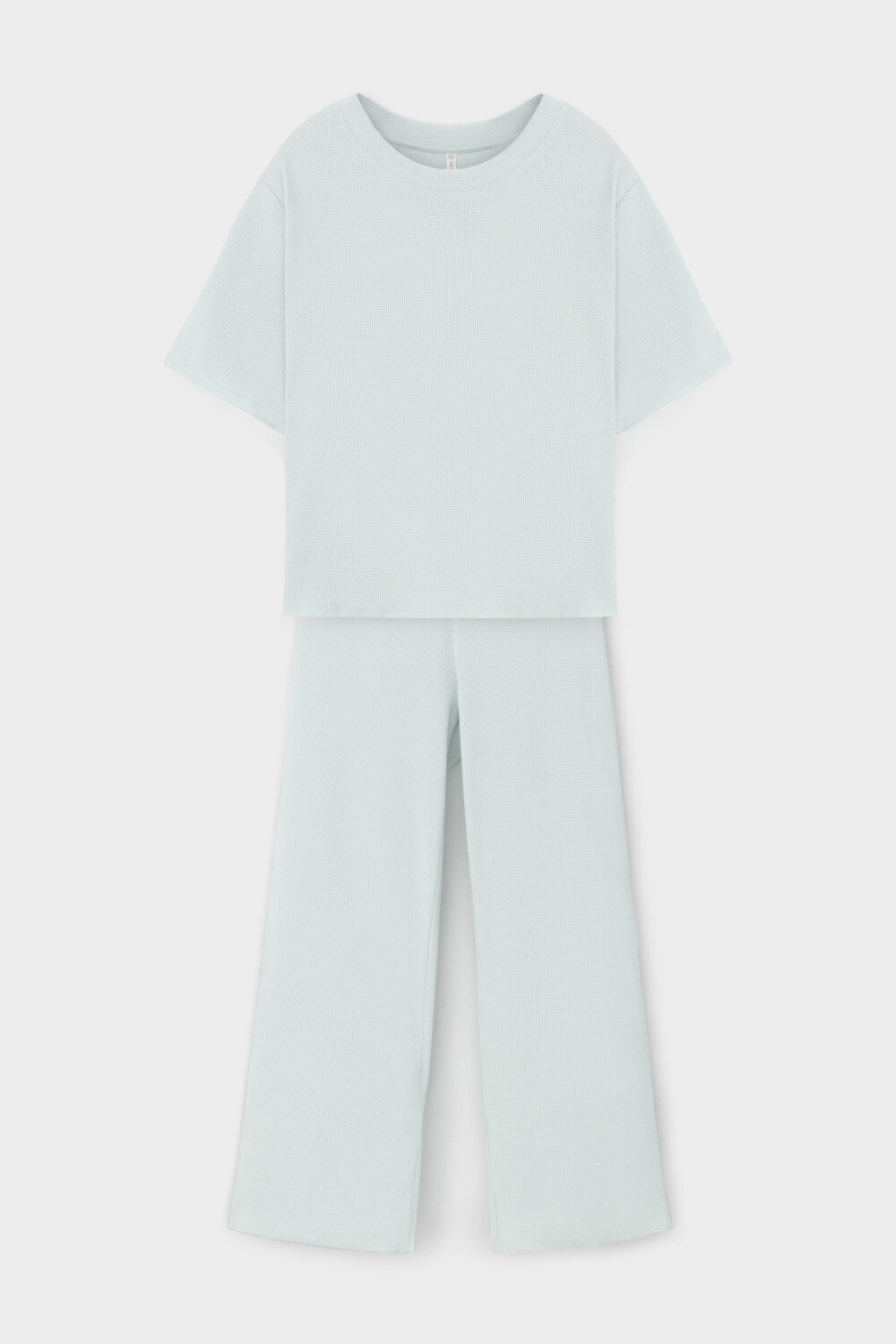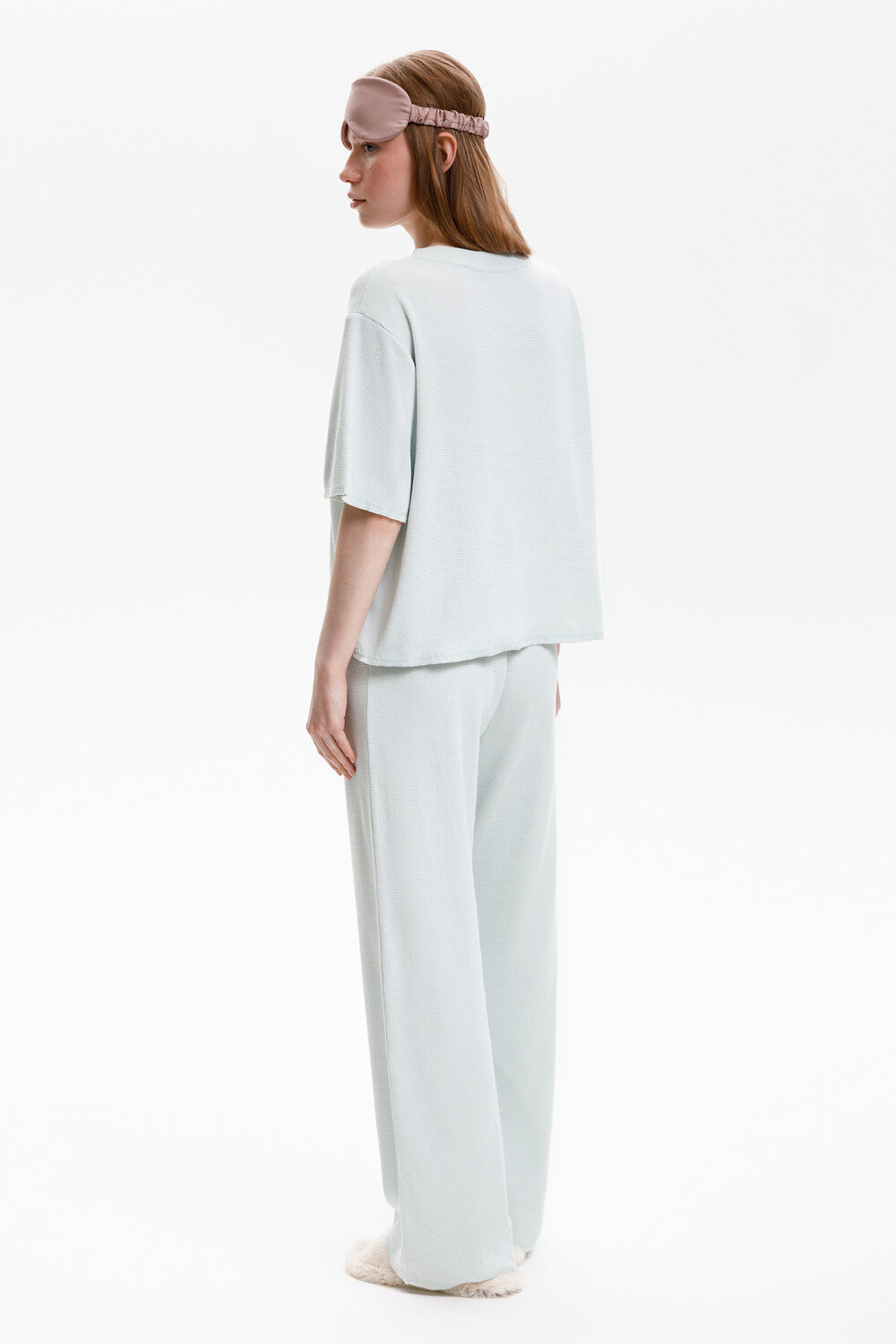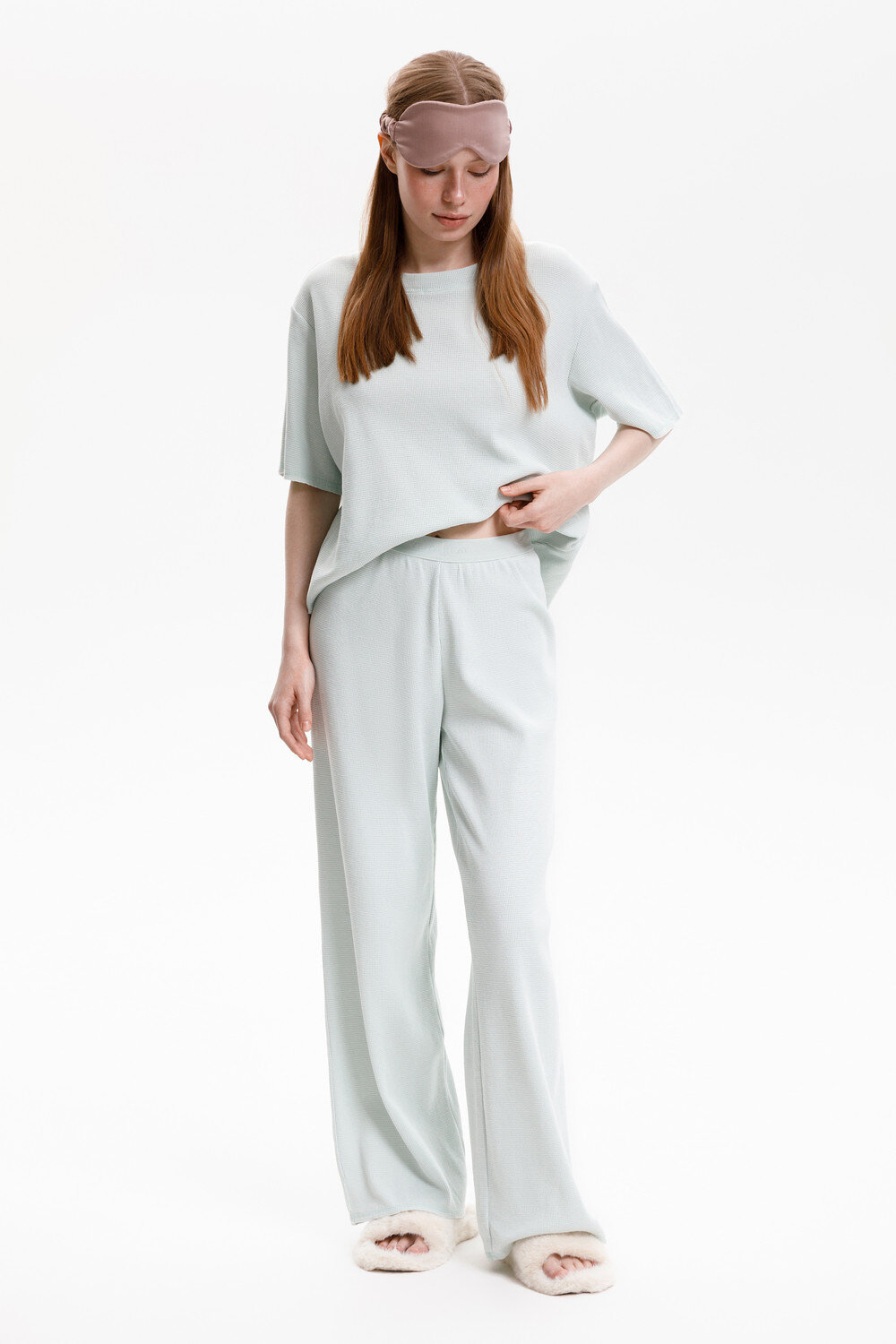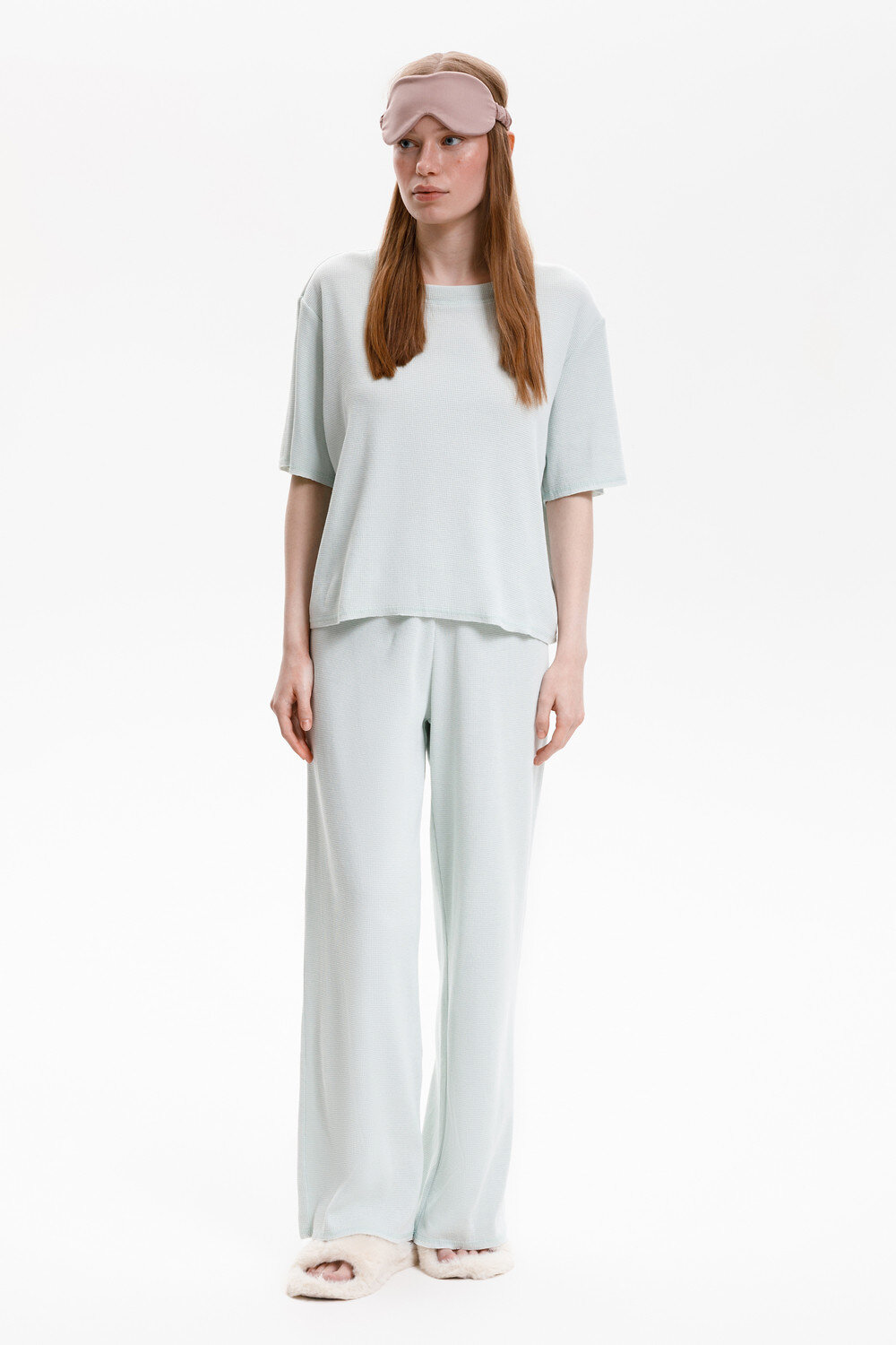Комплект из объемного трикотажа с добавлением эластичных волокон. Свободный силуэт, мягкий пояс и отсутствие боковых швов на брюках обеспечат комфорт во время сна и отдыха.