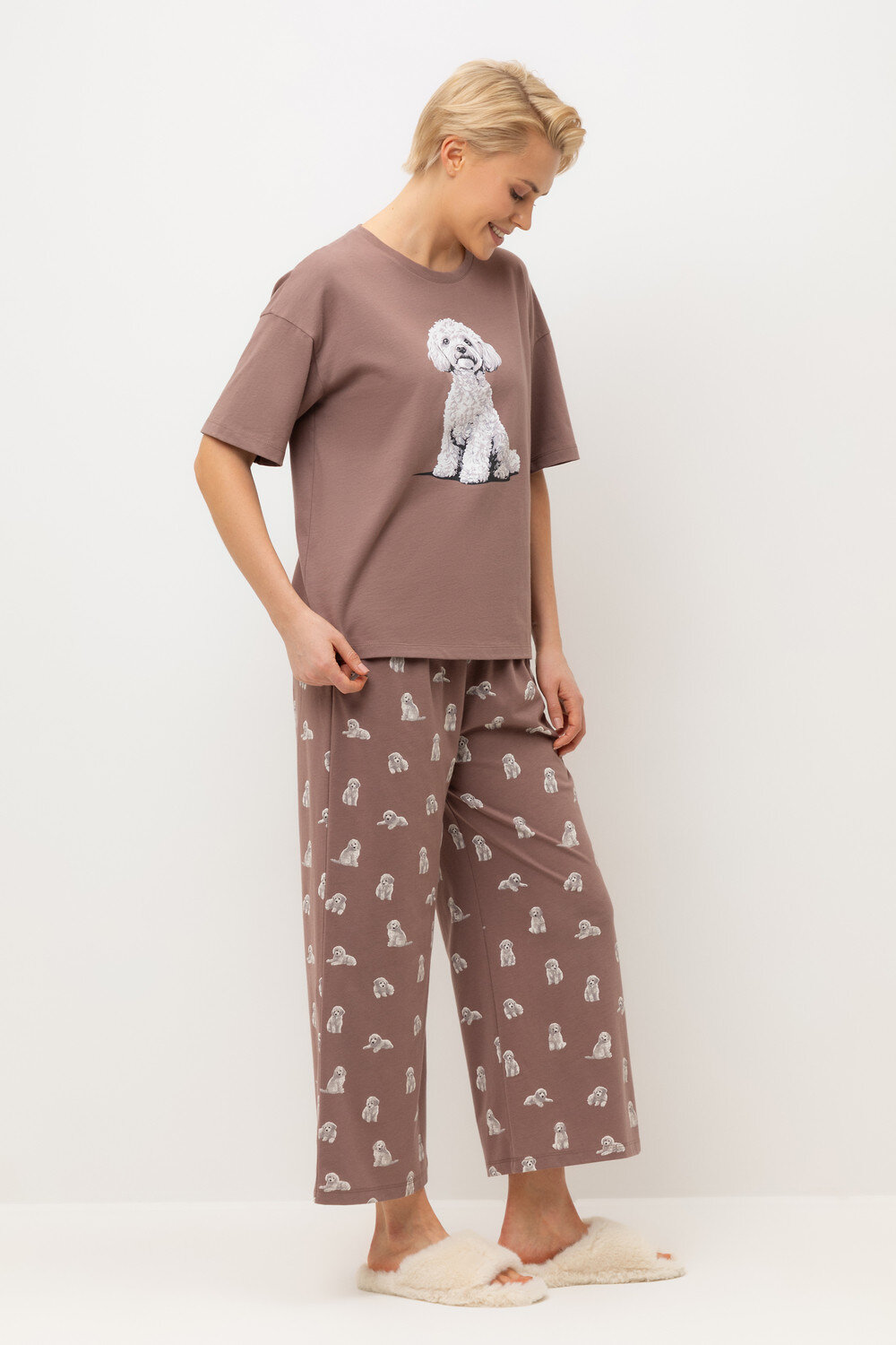 Комплект из высококачественного гребенного хлопка. Мягкий на ощупь принт на футболке выполнен на основе водных красок, что обеспечивает устойчивость к многократным стиркам. Комплект дополняют укороченные брюки с удобным поясом на резинке и практичными карманами.