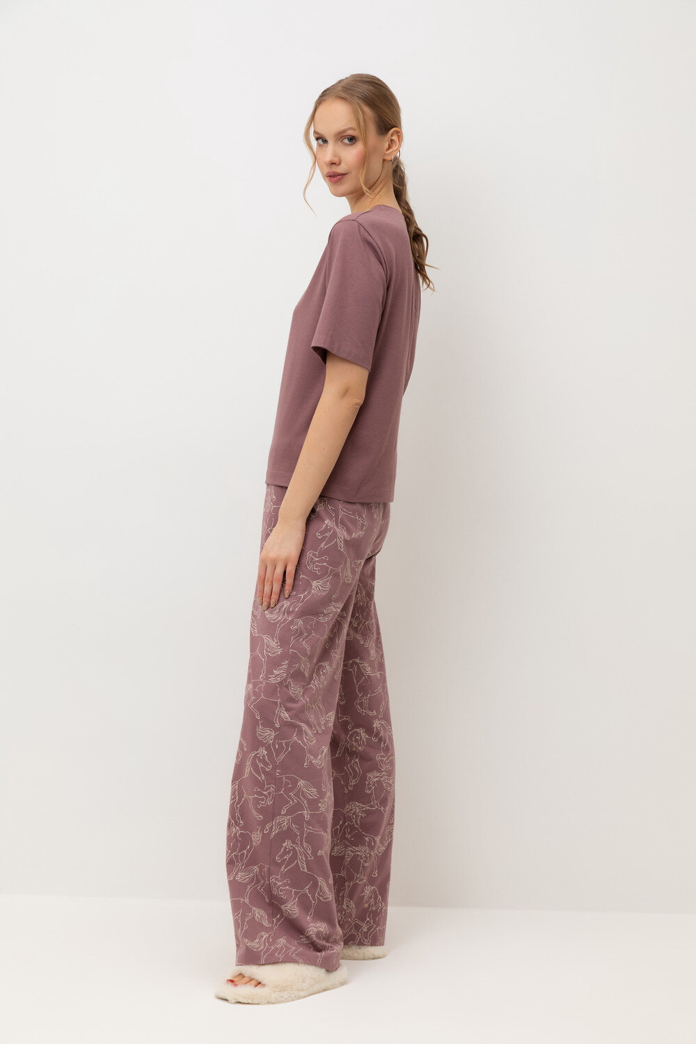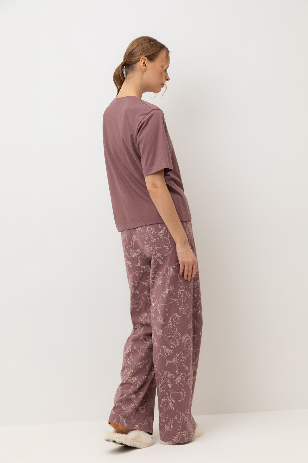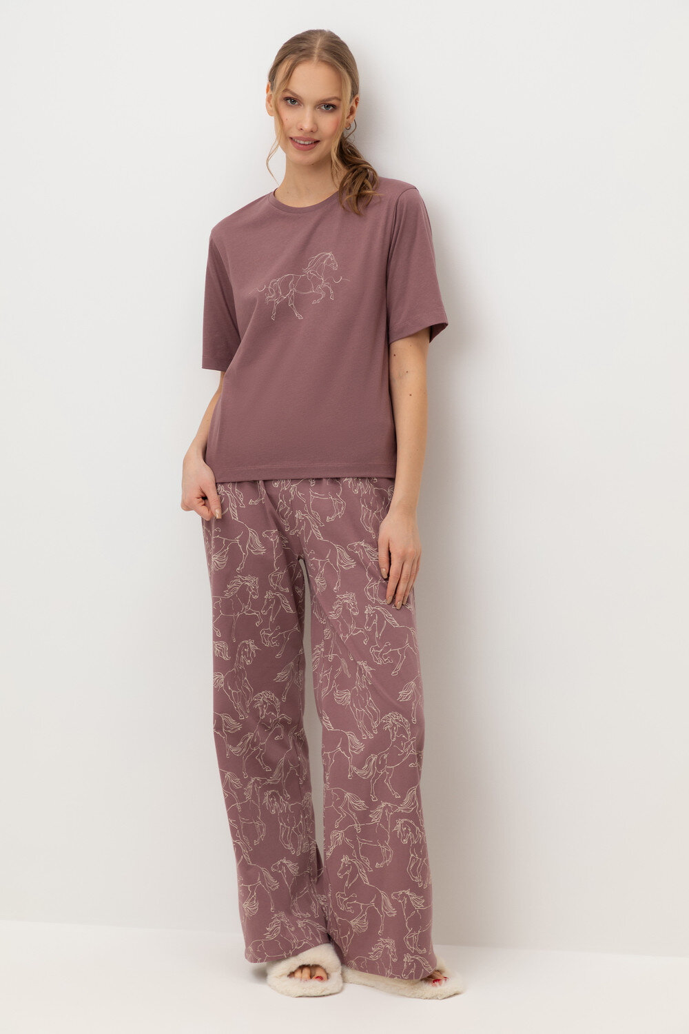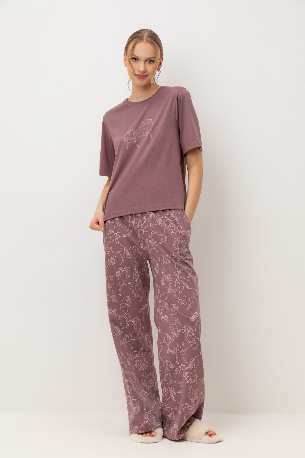 Комплект приглушенного оттенка выполнен из хлопка с нежнейшим модалом. Свободный крой футболки и мягкий пояс брюк обеспечивают легкость и свободу движений.