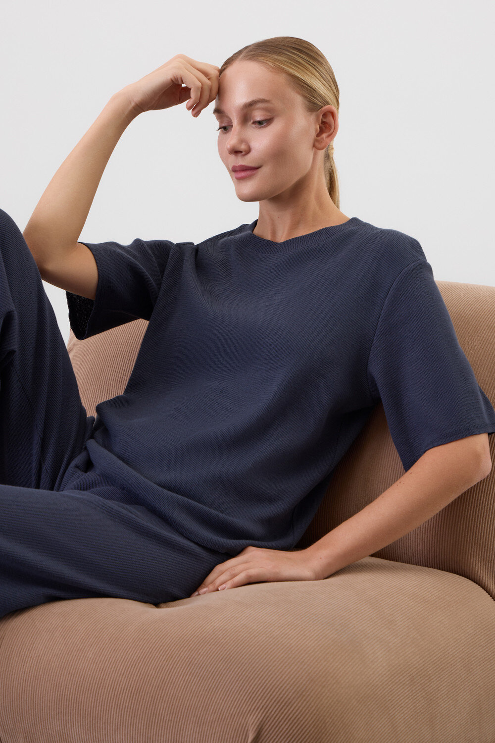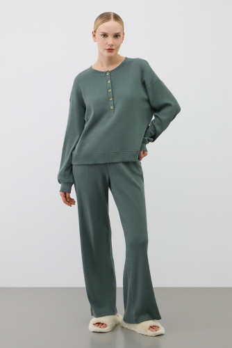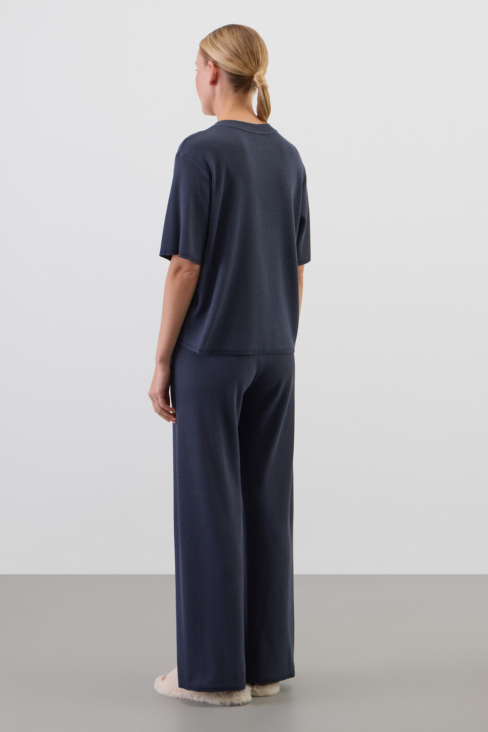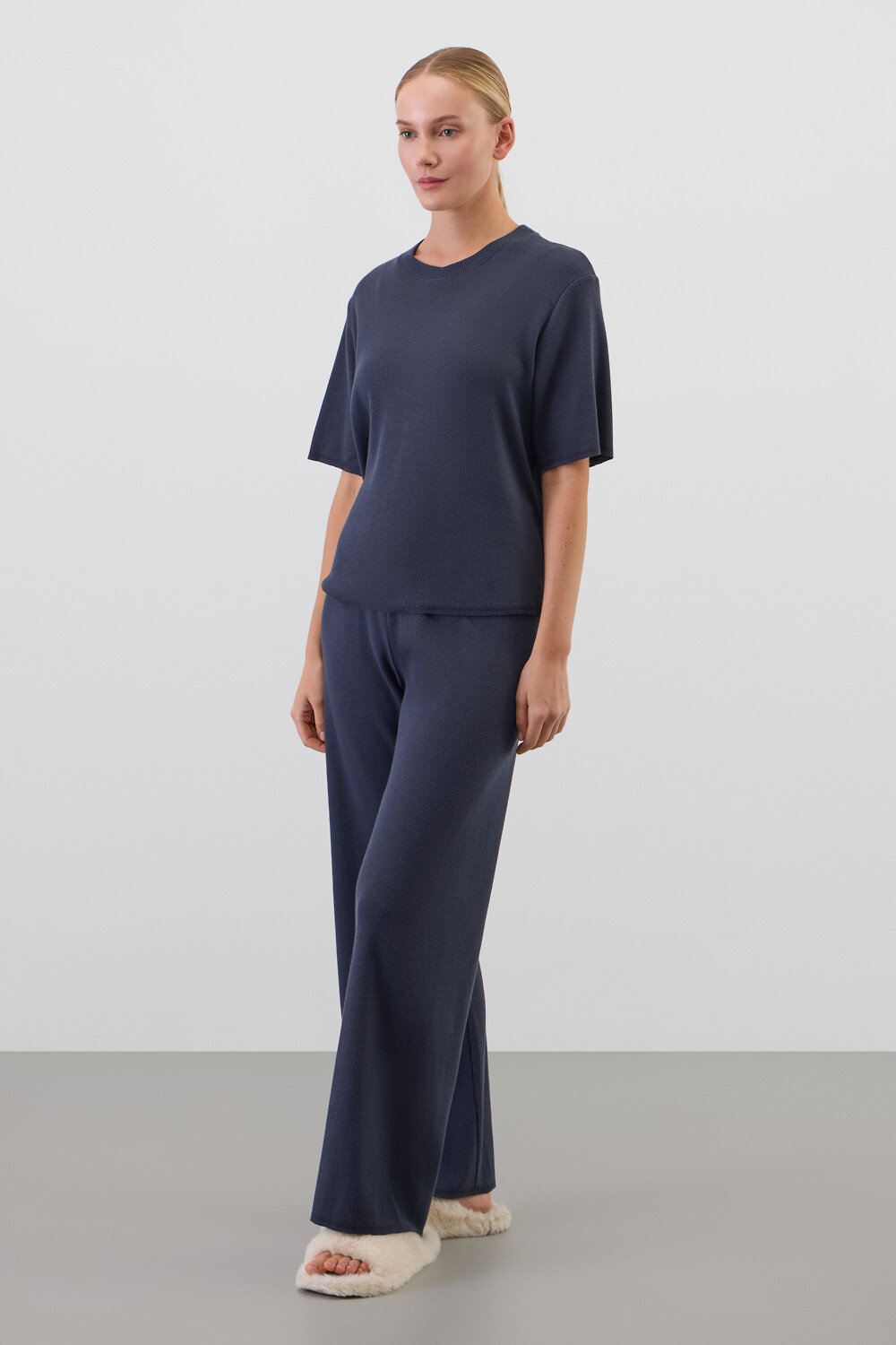 Комплект из объемного трикотажа с добавлением эластичных волокон. Свободный силуэт и мягкий пояс брюк обеспечат комфорт во время сна и отдыха.