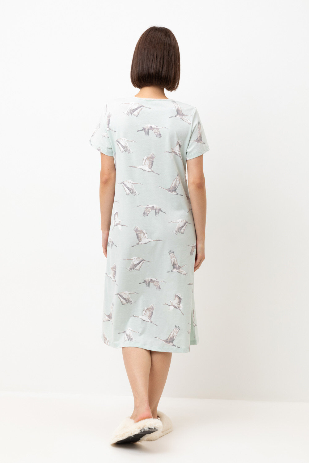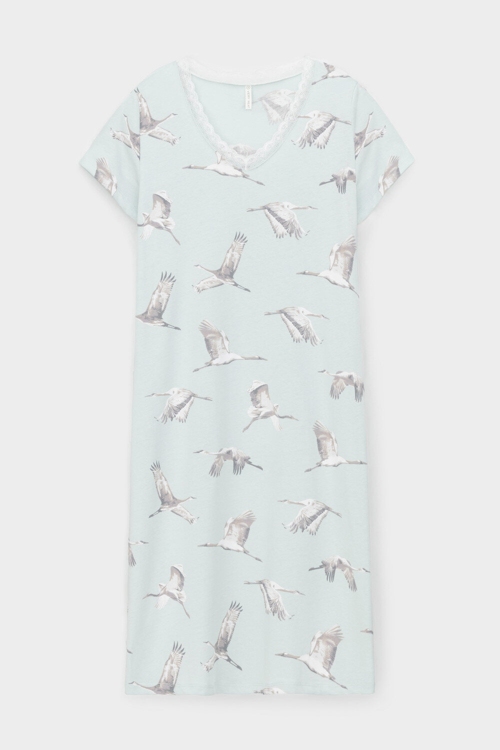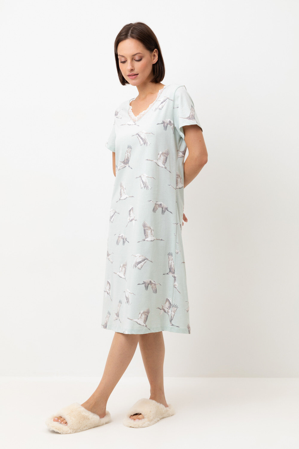 Комфортная сорочка с коротким рукавом выполнена из высококачественного гребенного хлопка. Эластичное кружево нежно обрамляет зону декольте, а свободный крой добавляет комфорта во время сна.