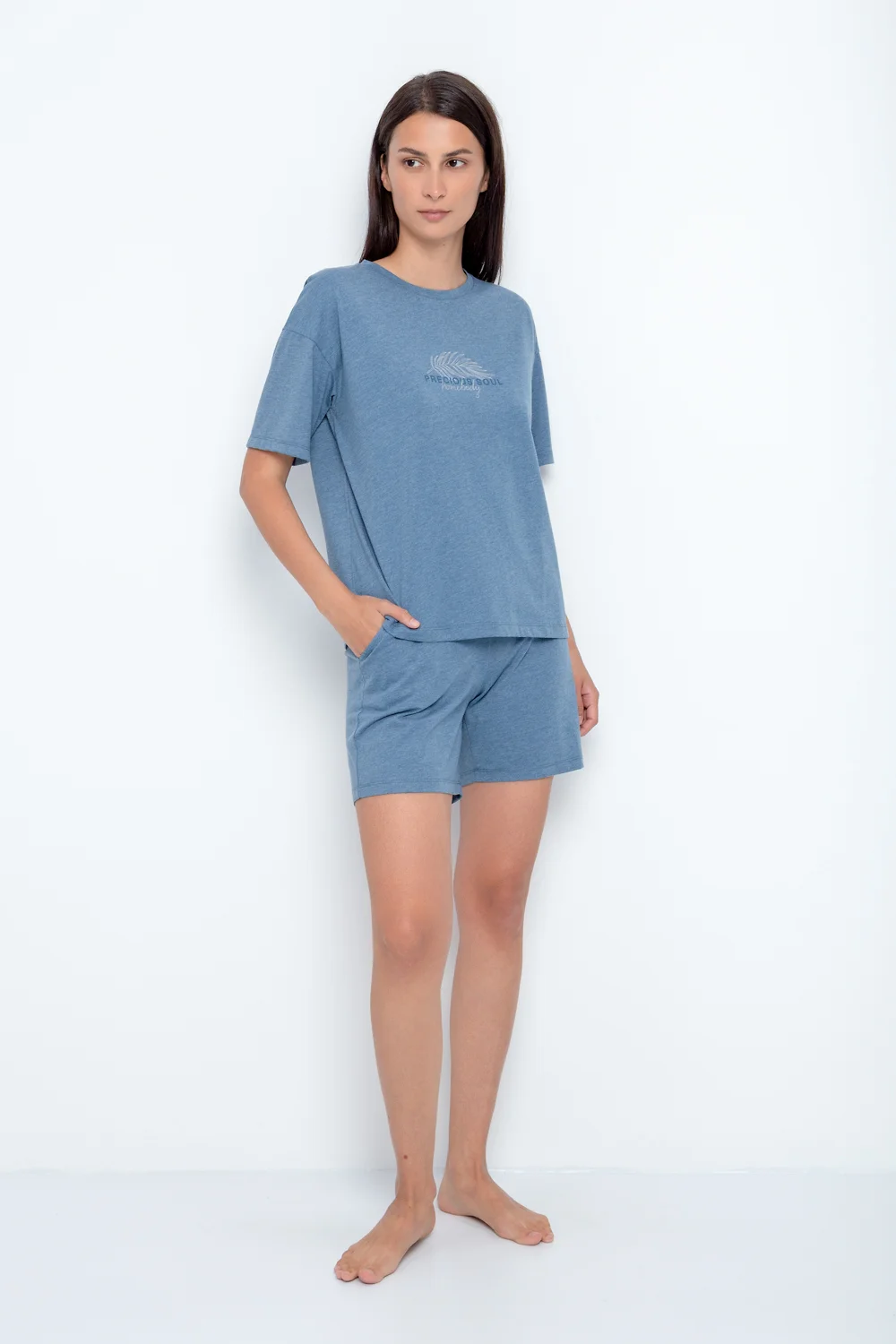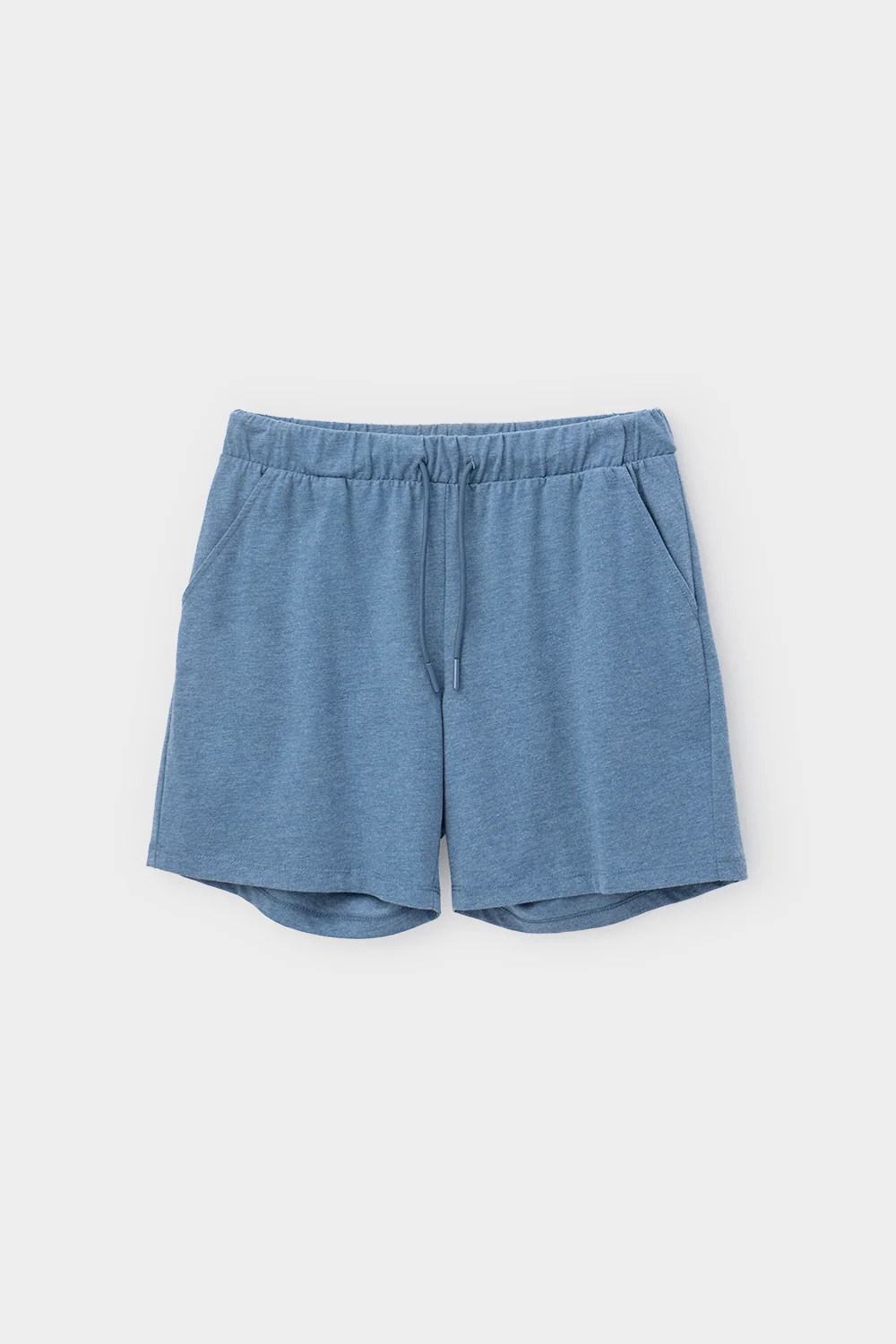 Комфортные шорты с карманами по бокам из меланжевого хлопка. Мягкий пояс на резинке регулируется с помощью шнурка.