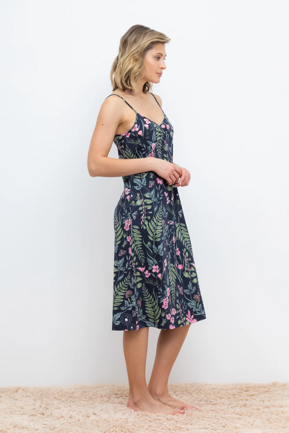 Элегантная сорочка на бретелях из 100% натурального хлопка для комфортного сна. Модель из трикотажного полотна супрем с набивным нежным рисунком с регулируемыми бретелями. На груди сборка. Гладкий материал приятен к телу и позволяет коже дышать.