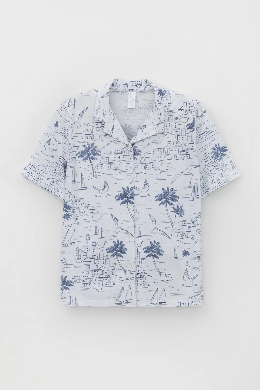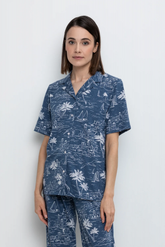 Легкая рубашка с короткими рукавами на пуговицах из набивного трикотажа. Гладкий материал приятен к телу и позволяет коже дышать.