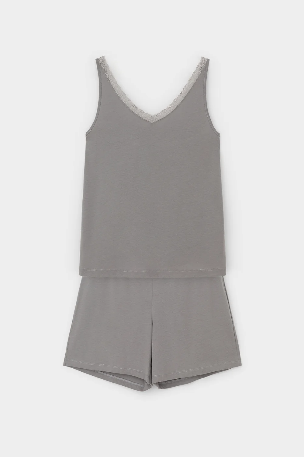 Легкий комплект приглушенного зеленого оттенка выполнен из хлопка с нежнейшим модалом. Свободный крой топа декорированный эластичным кружевом и мягкий пояс шорт обеспечивают легкость и свободу движений.