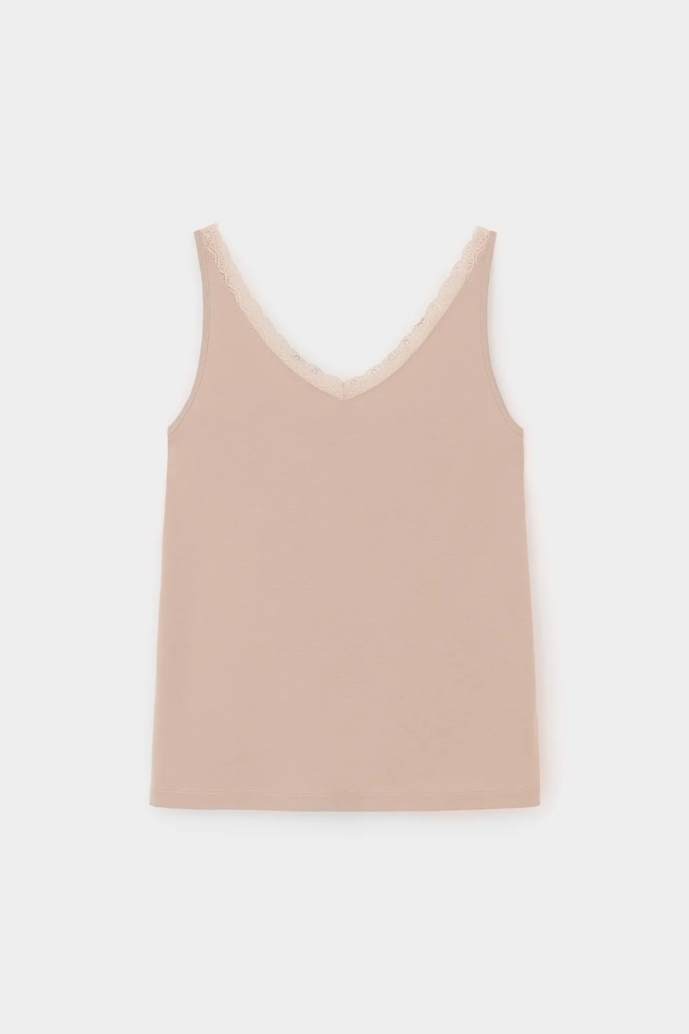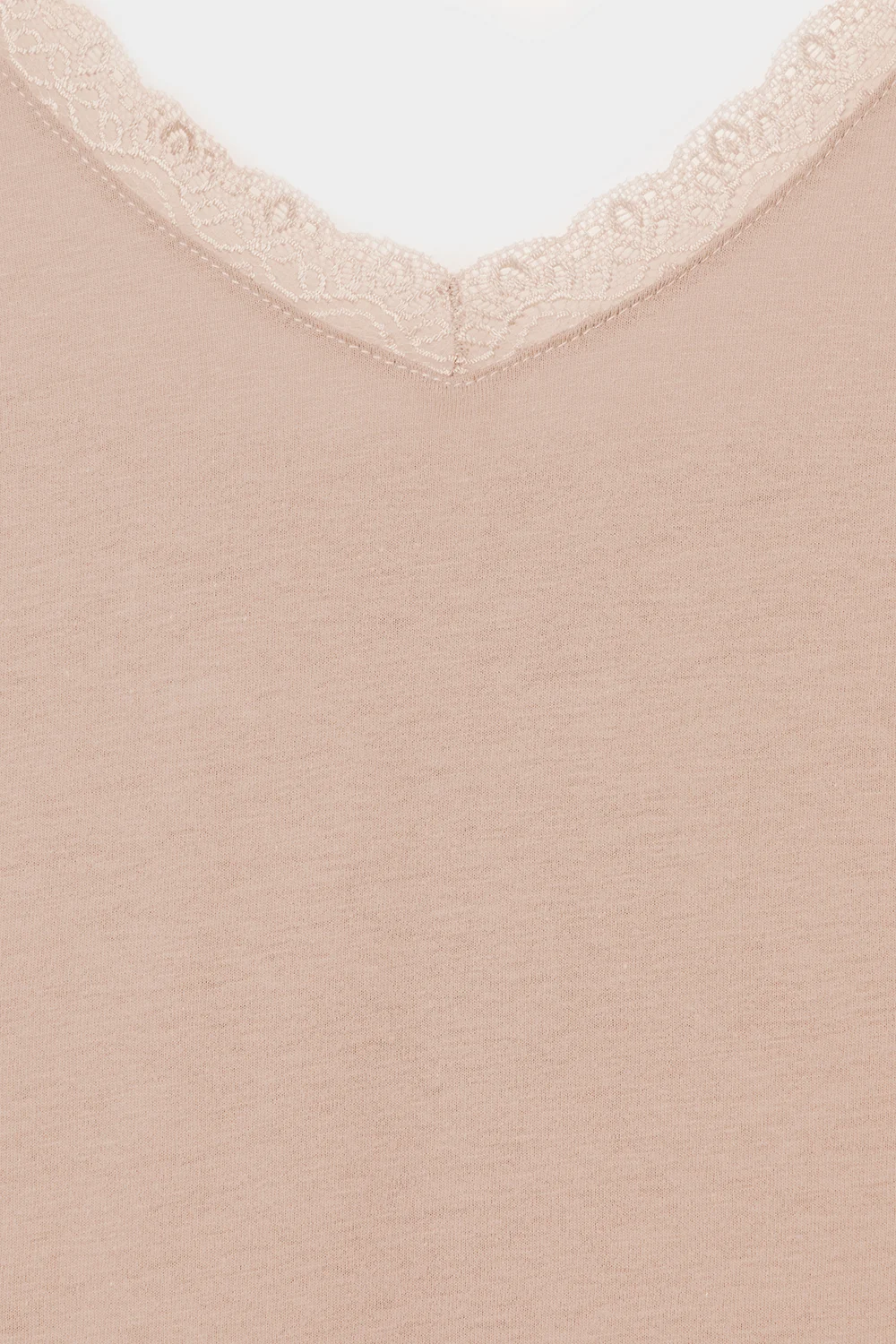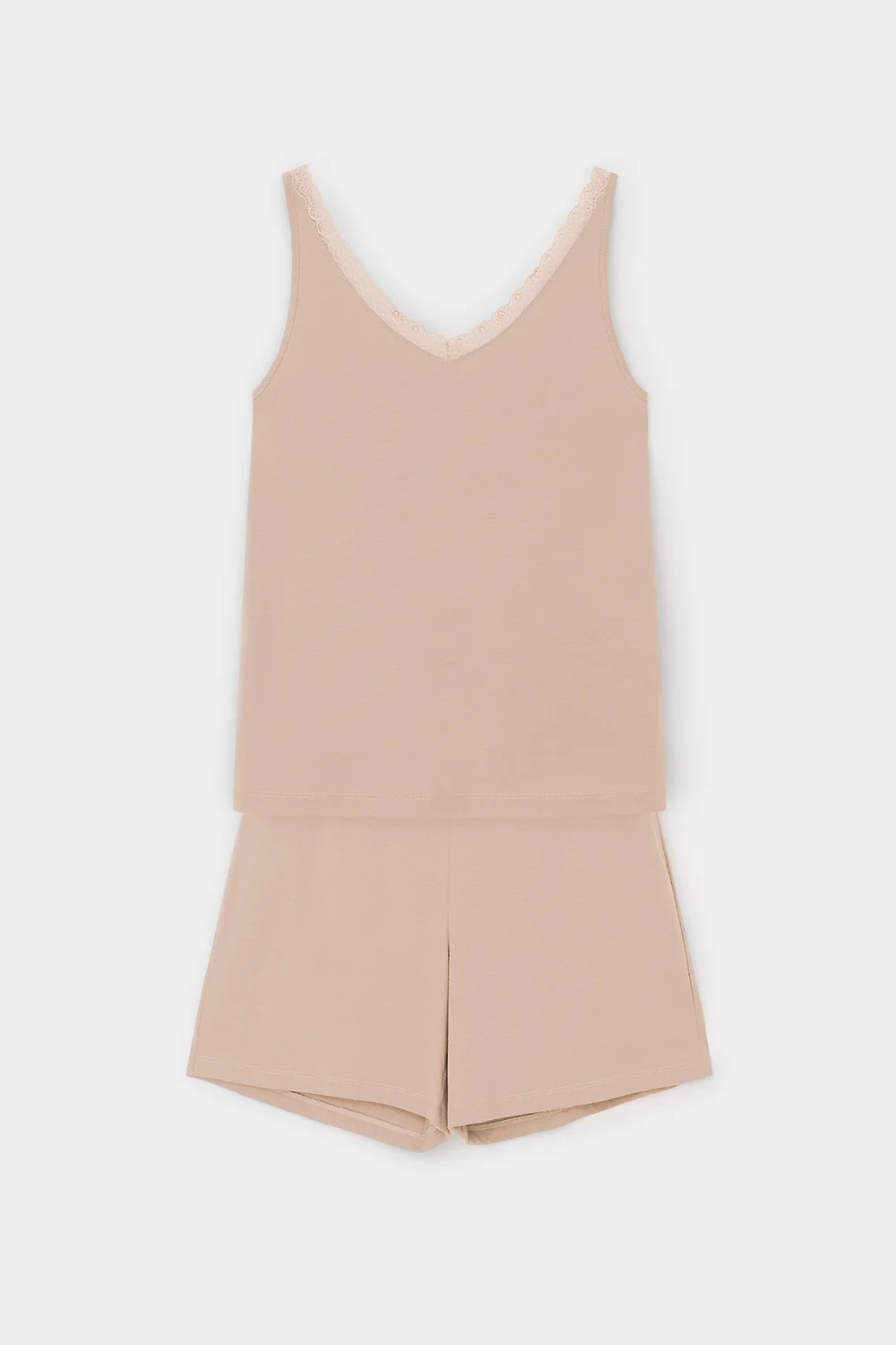 Легкий комплект нюдово-бежевого оттенка выполнен из хлопка с нежнейшим модалом. Свободный крой топа декорированный эластичным кружевом и мягкий пояс шорт обеспечивают легкость и свободу движений.