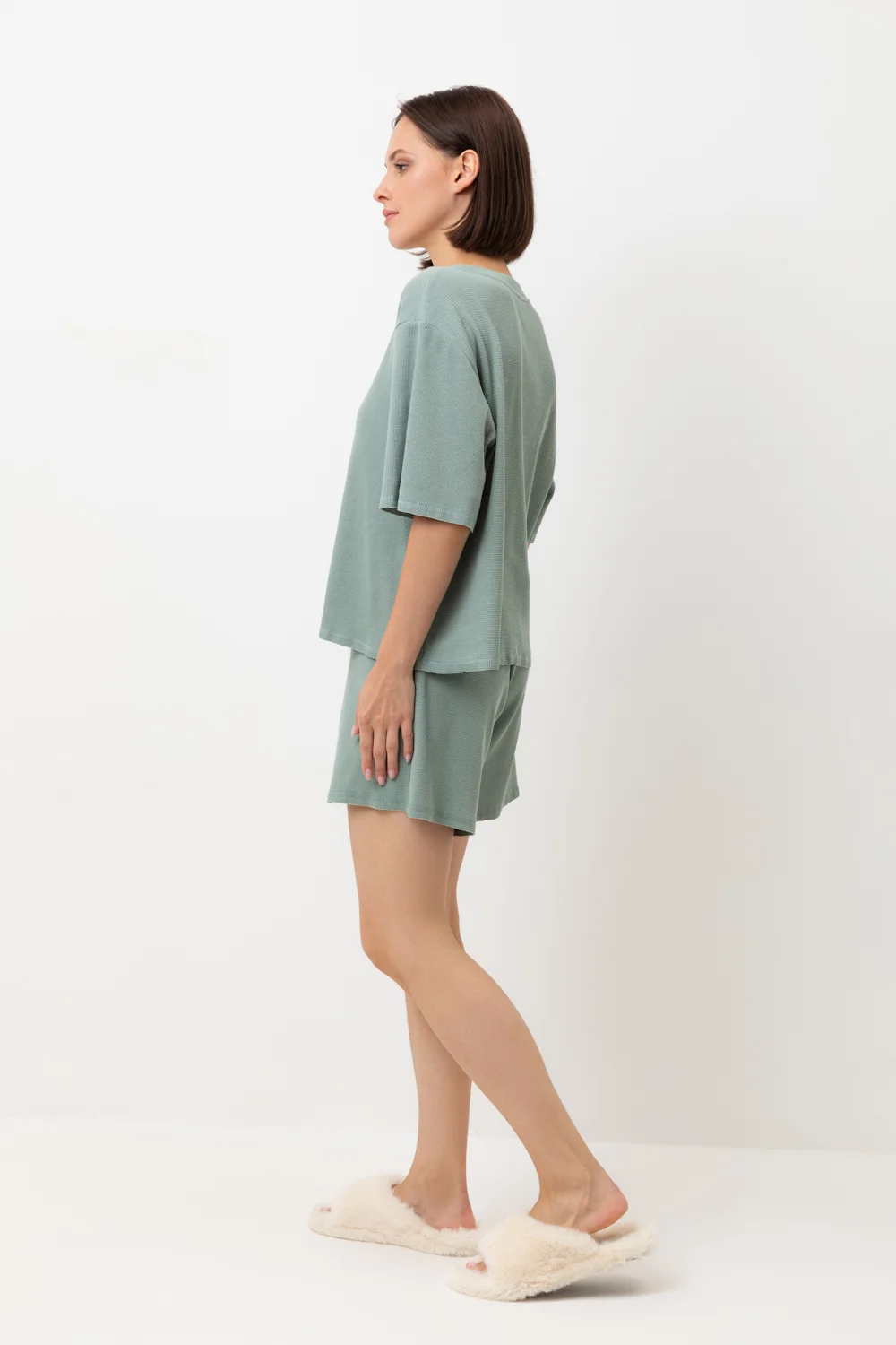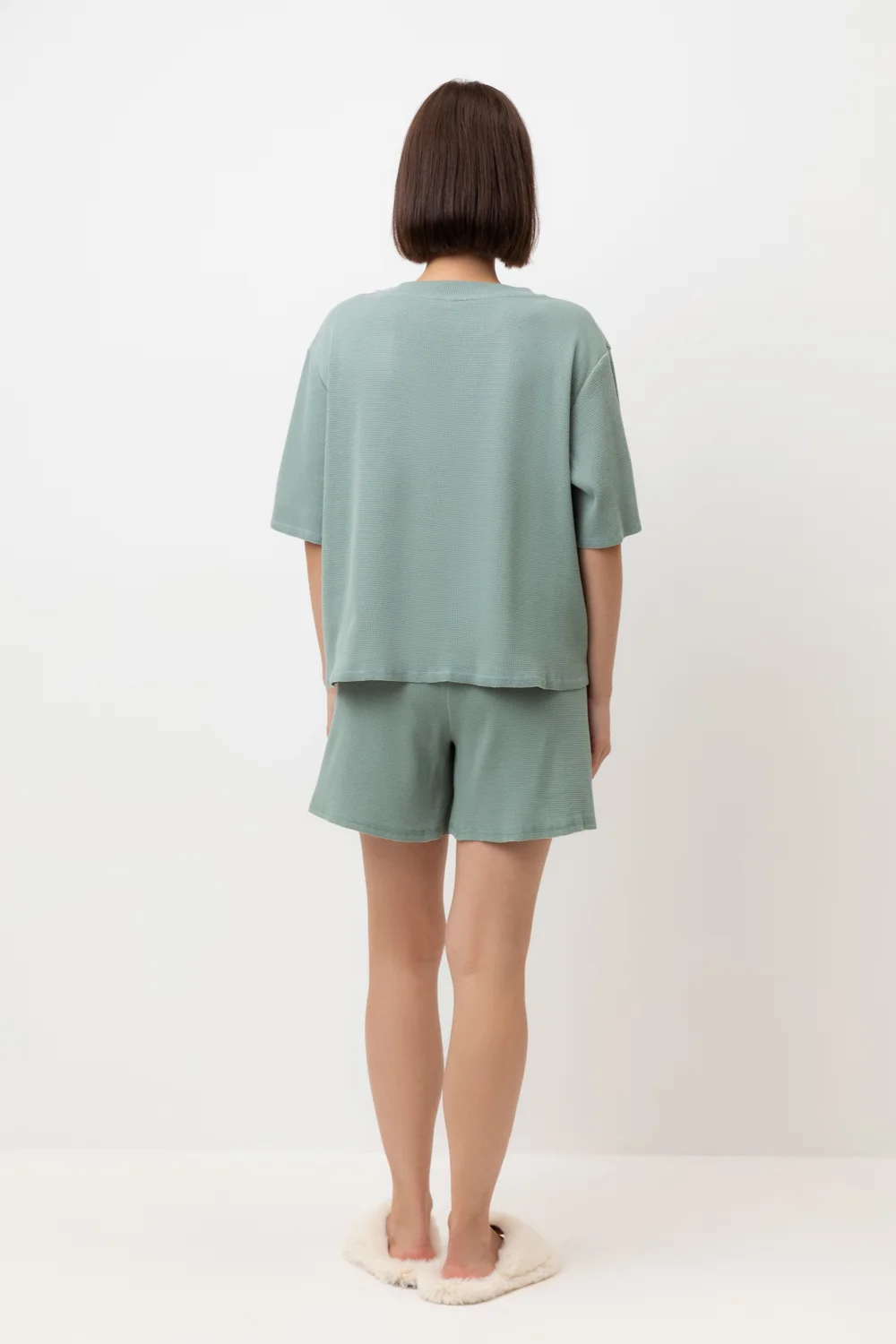 Комплект из объемного трикотажа с добавлением эластичных волокон. Свободный силуэт и мягкий пояс обеспечат комфорт во время сна и отдыха.