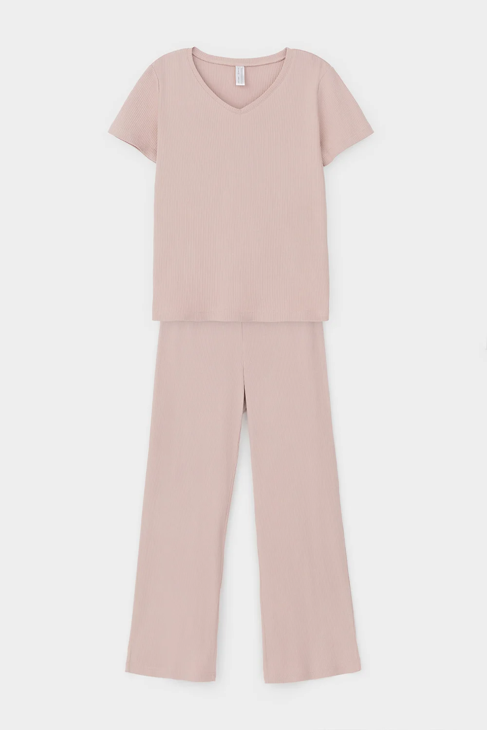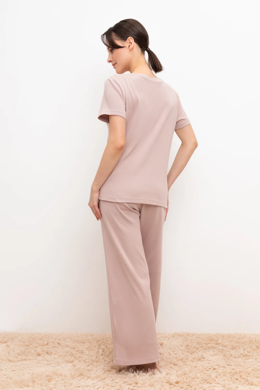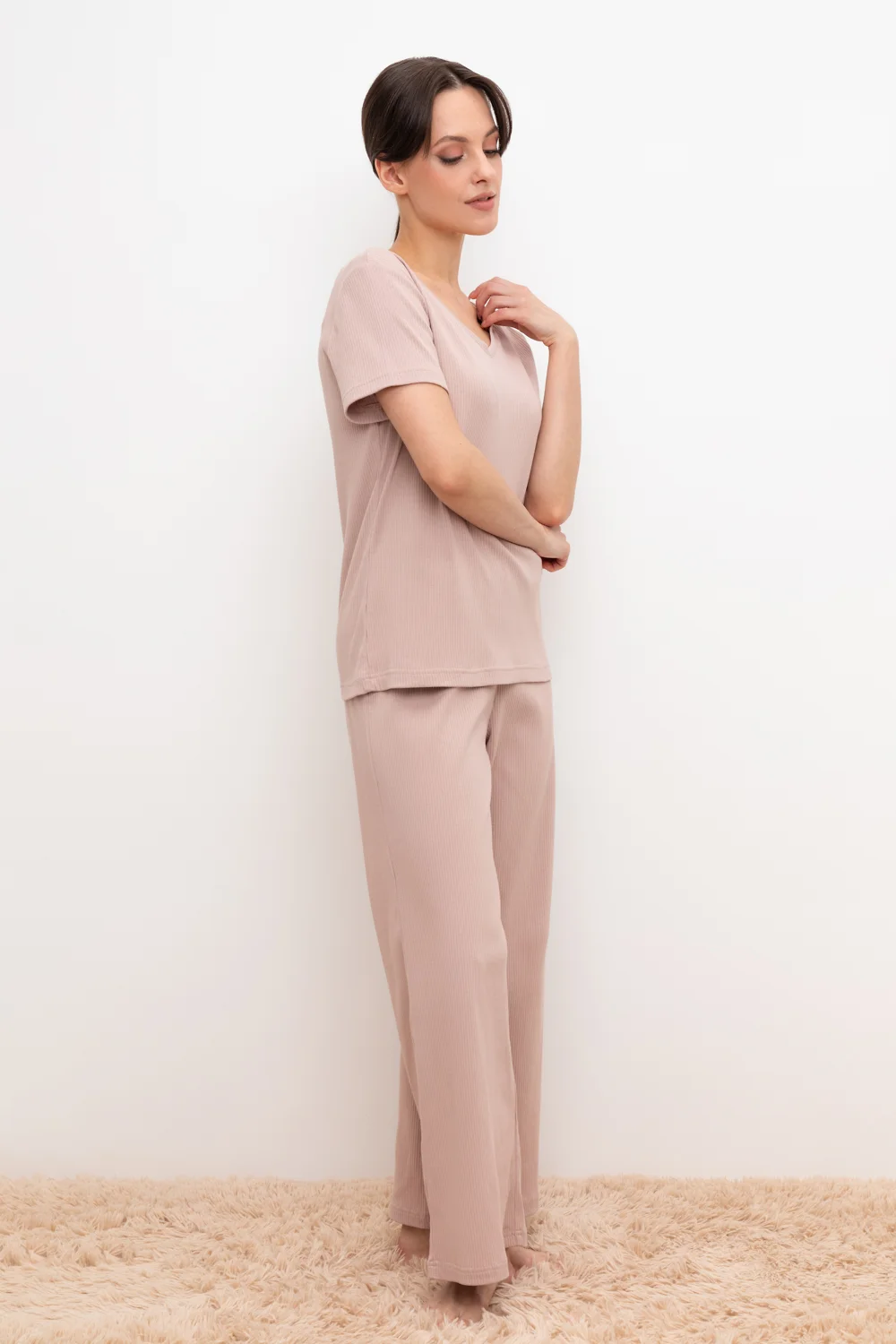 Комплект для комфортного сна и отдыха из трикотажного полотна в рубчик. Свободная футболка с V-образным вырезом. Брюки с мягким поясом на резинке удобно садятся по фигуре.