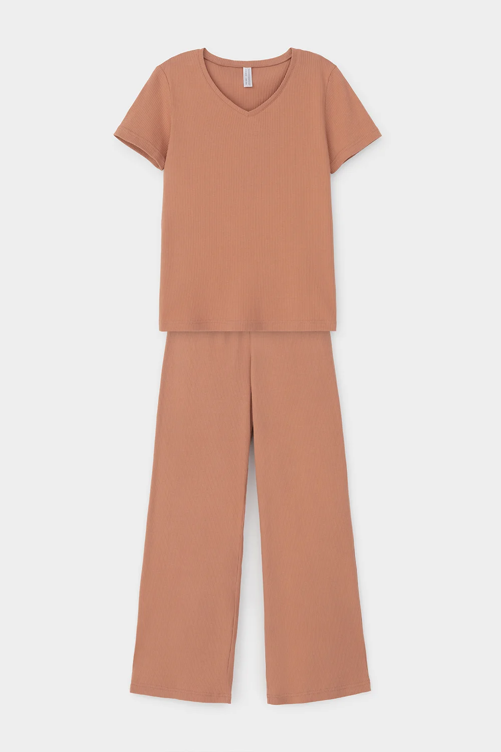 Комплект для комфортного сна и отдыха из трикотажного полотна в рубчик. Свободная футболка с V-образным вырезом. Брюки с мягким поясом на резинке удобно садятся по фигуре.