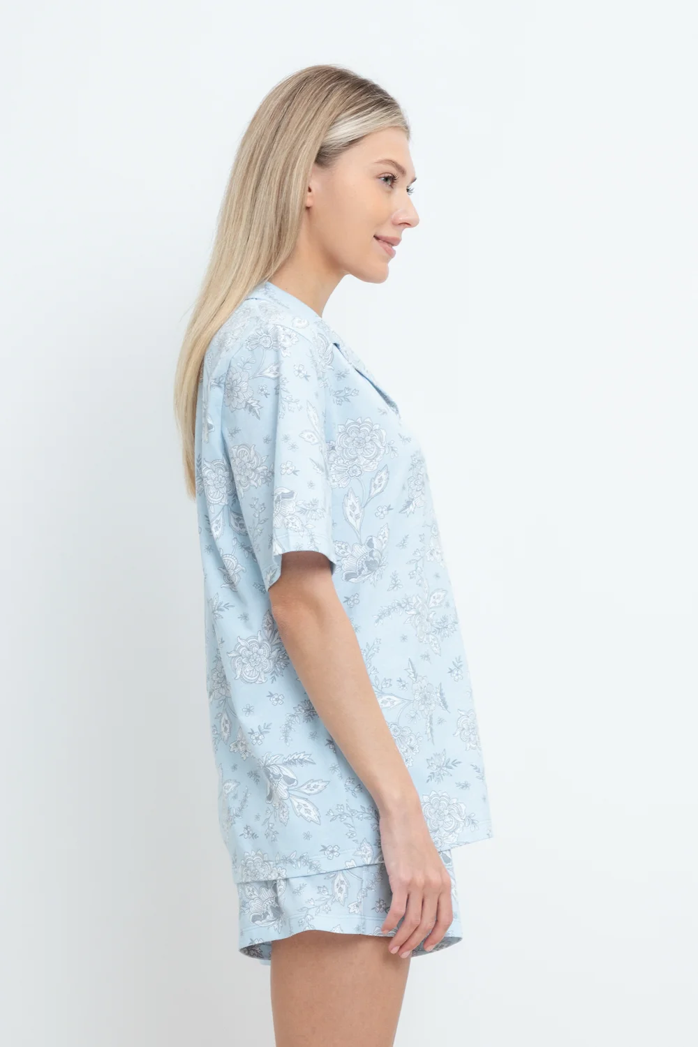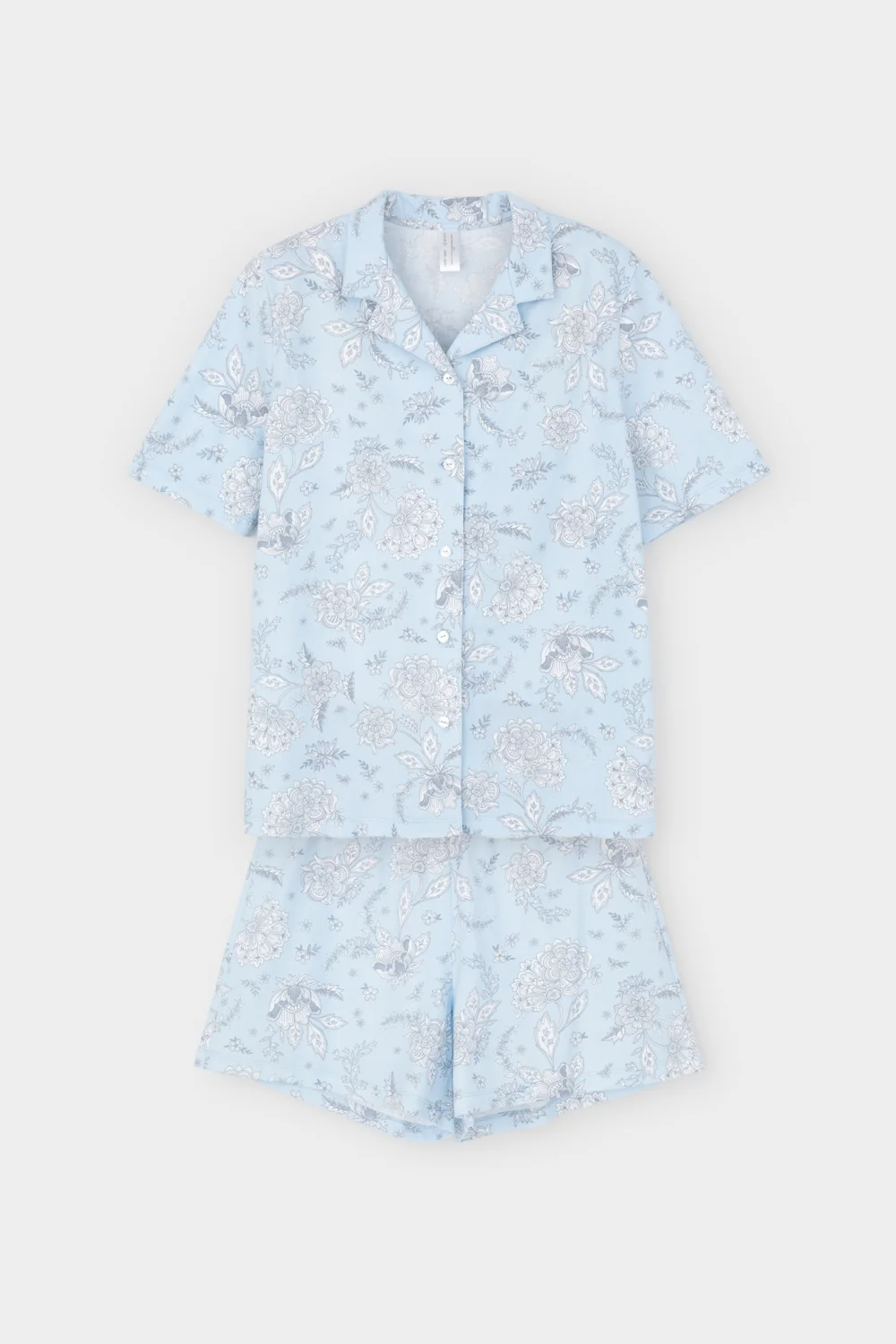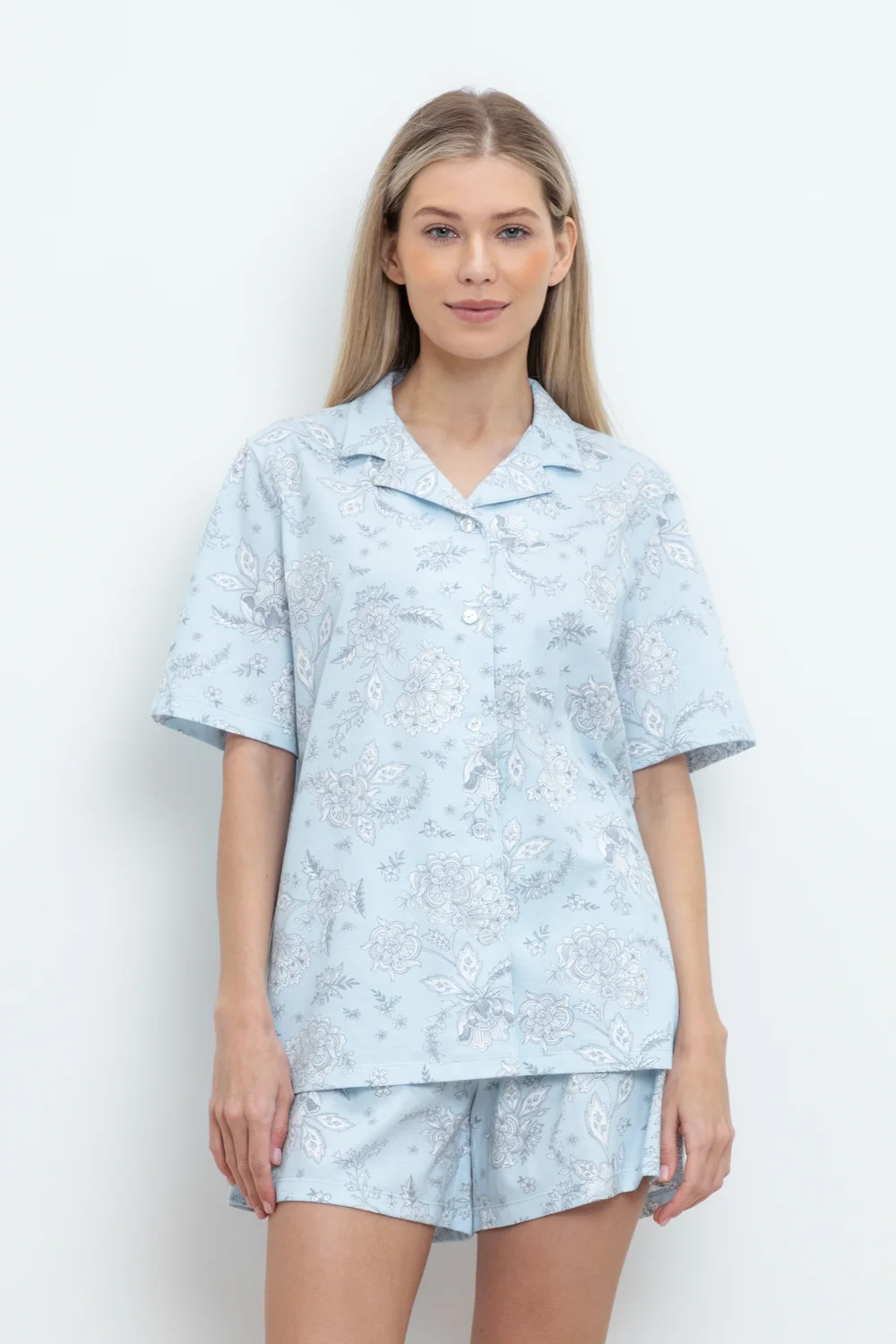 Комплект для комфортного сна из набивного трикотажа с нежным рисунком из 100% натурального хлопка. Рубашка с короткими рукавами на пуговицах. Шорты с мягким поясом на резинке. Гладкий материал приятен к телу, не теряет форму и позволяет коже дышать.