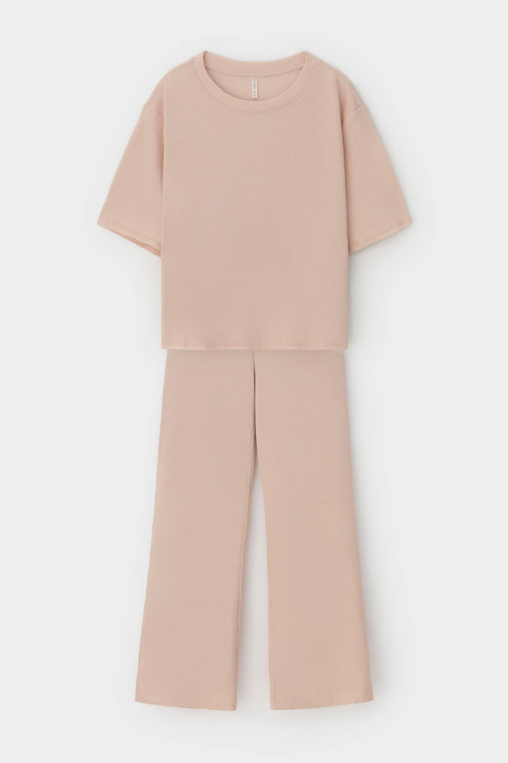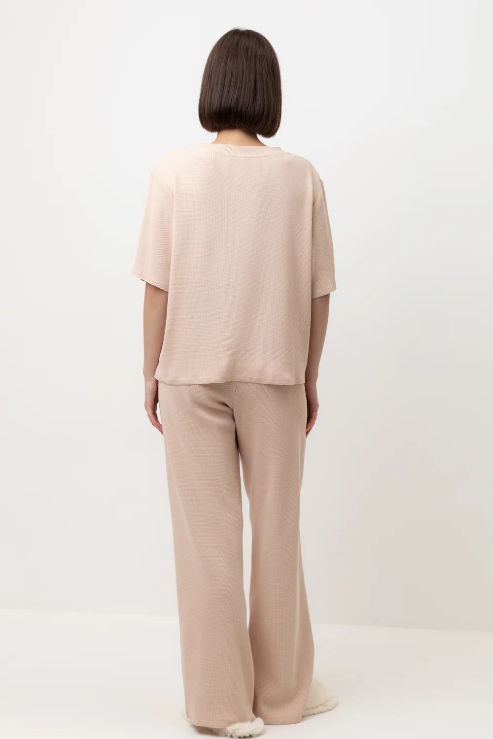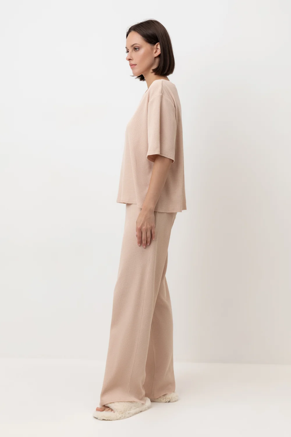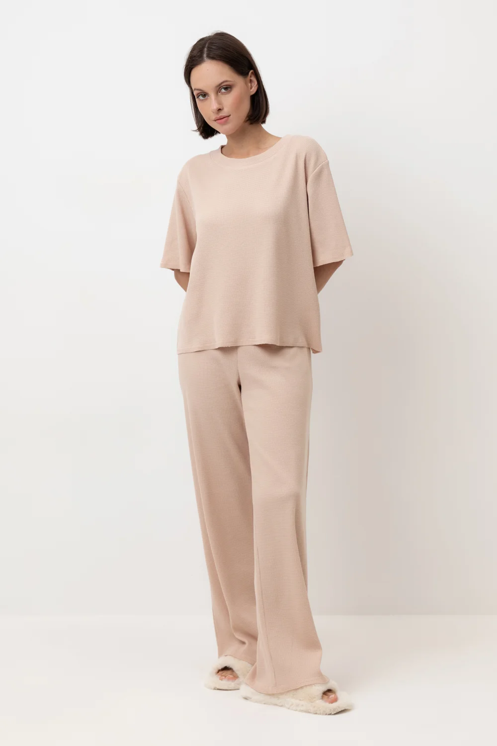 Комплект из объемного трикотажа с добавлением эластичных волокон. Свободный силуэт, мягкий пояс и отсутствие боковых швов на брюках обеспечат комфорт во время сна и отдыха.