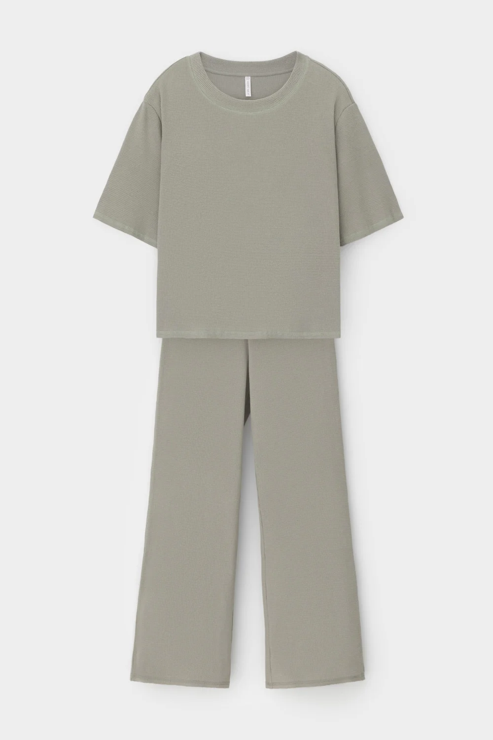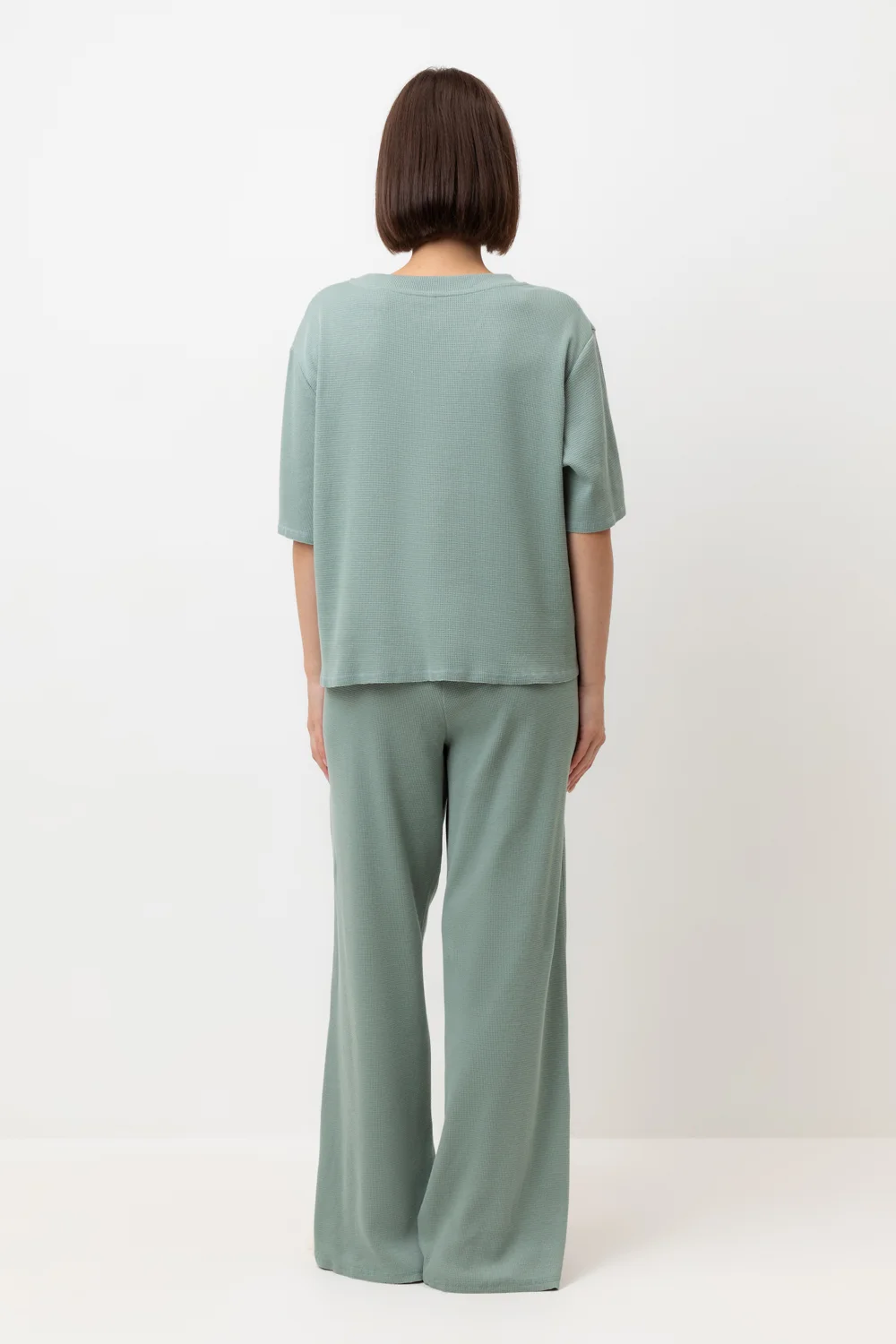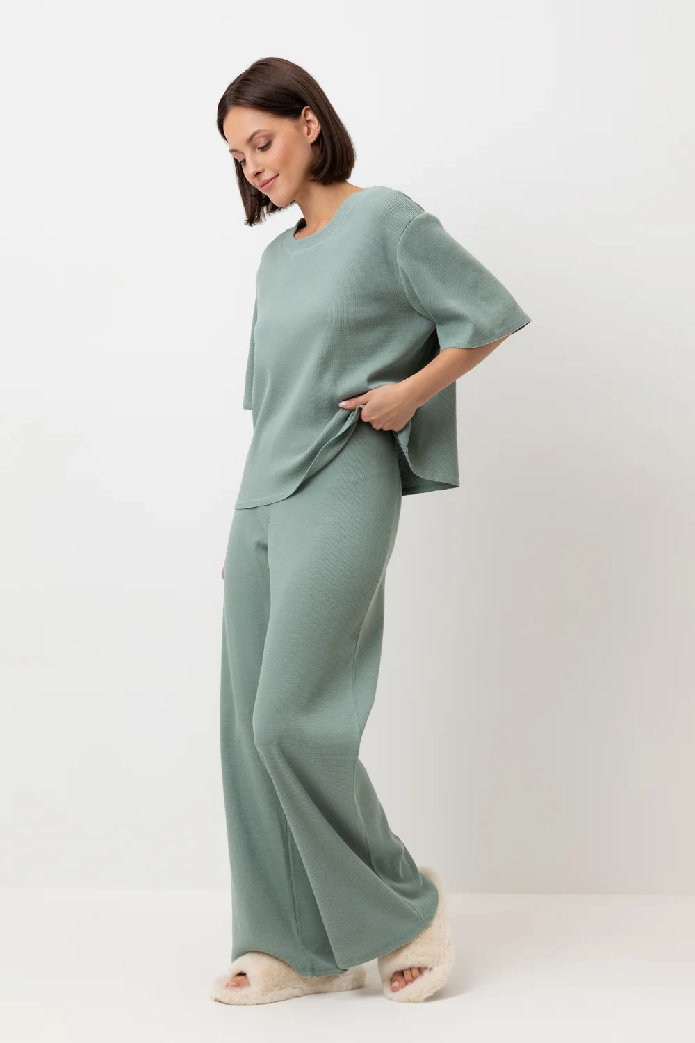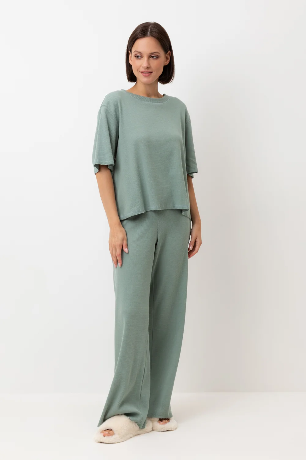 Комплект из объемного трикотажа с добавлением эластичных волокон. Свободный силуэт, мягкий пояс и отсутствие боковых швов на брюках обеспечат комфорт во время сна и отдыха.