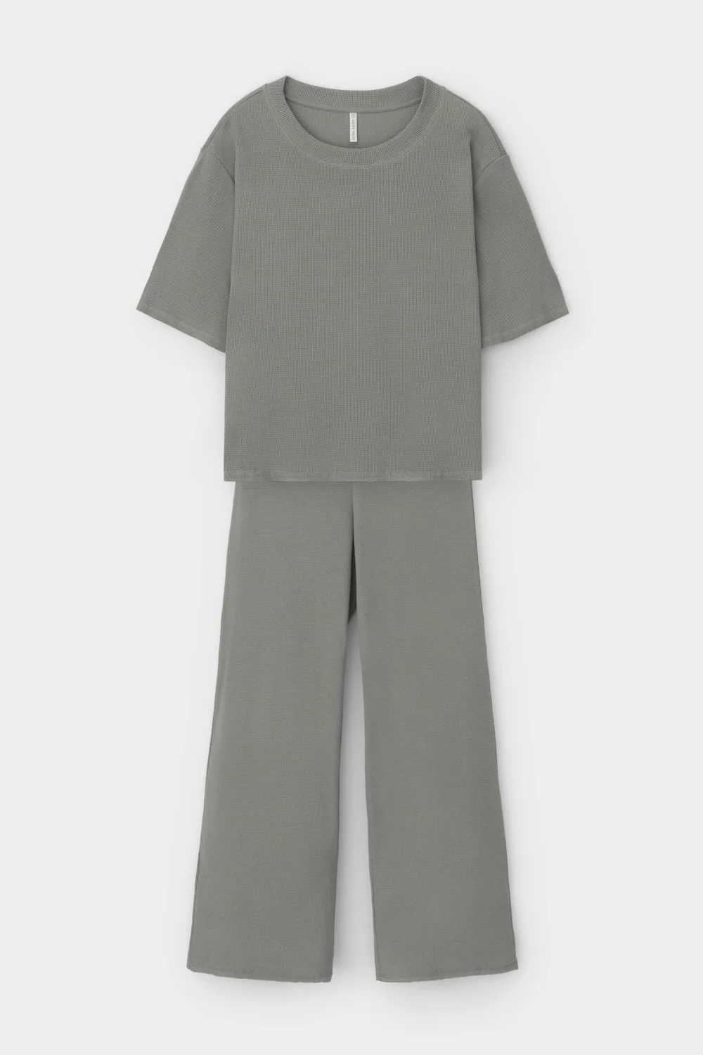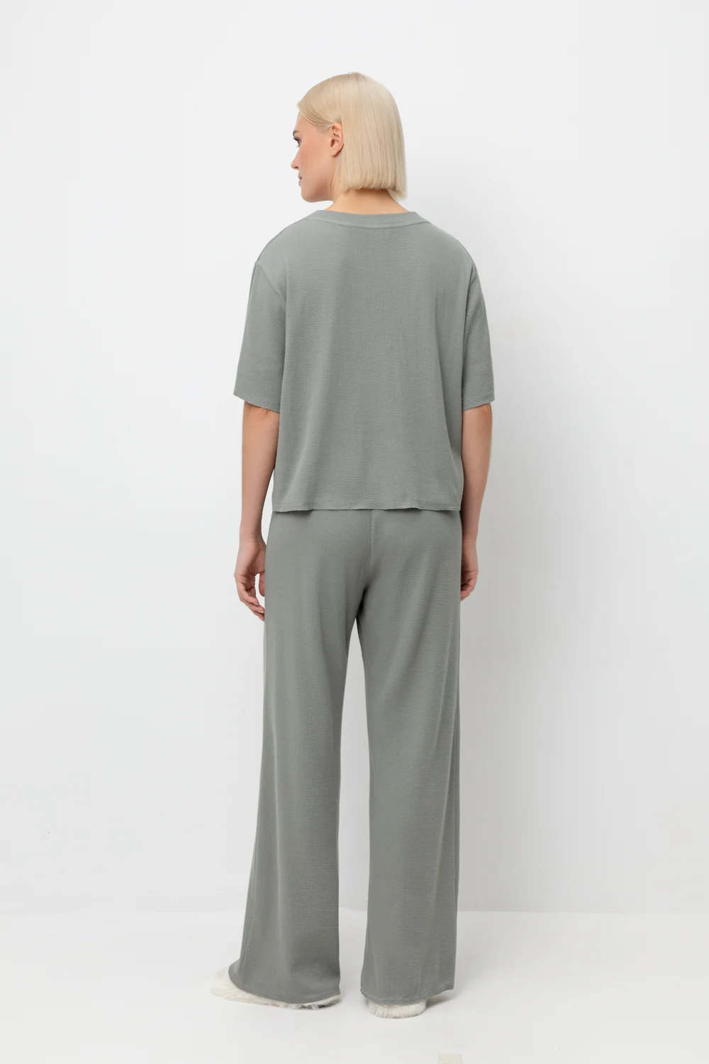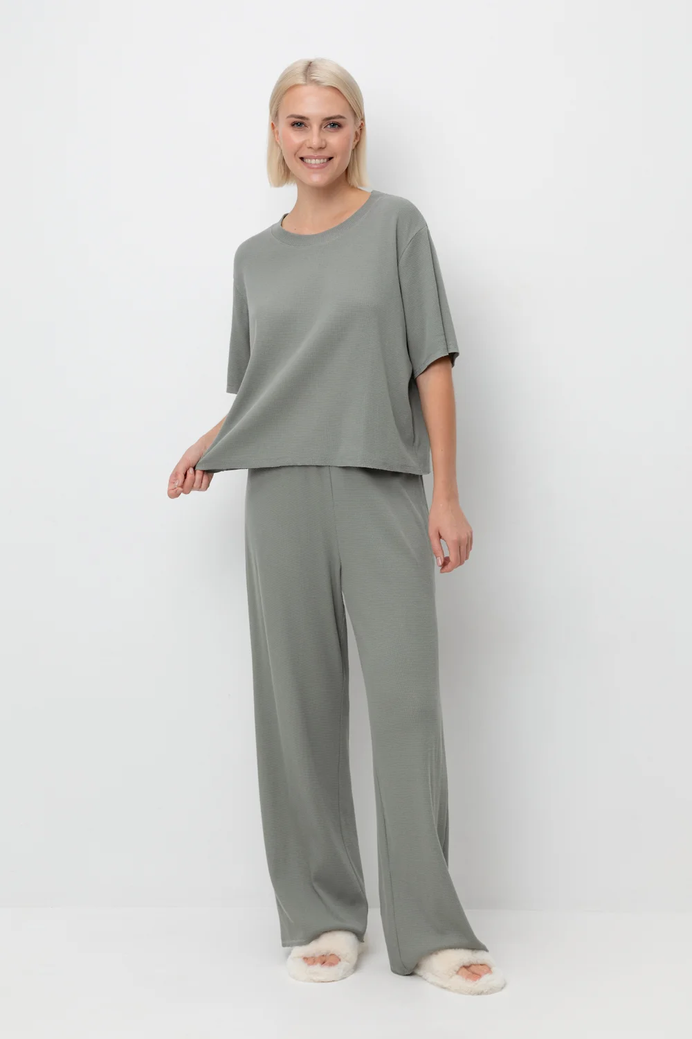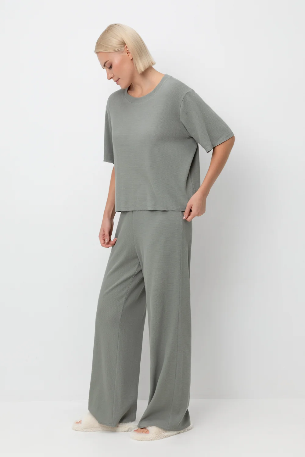 Комплект из объемного трикотажа с добавлением эластичных волокон. Свободный силуэт, мягкий пояс и отсутствие боковых швов на брюках обеспечат комфорт во время сна и отдыха.
