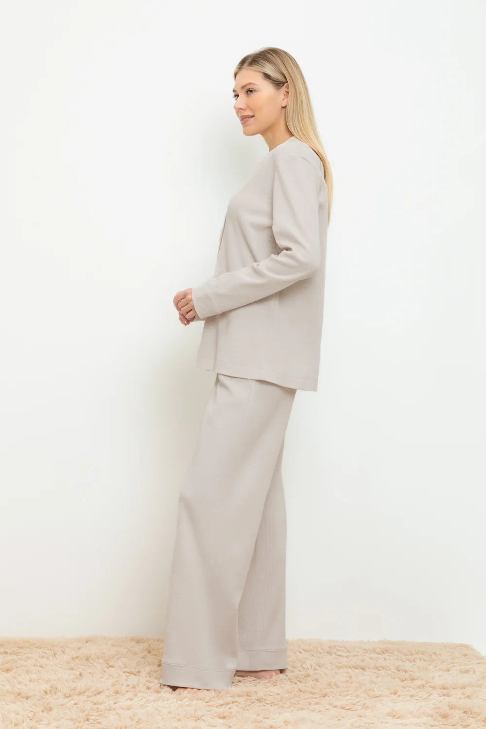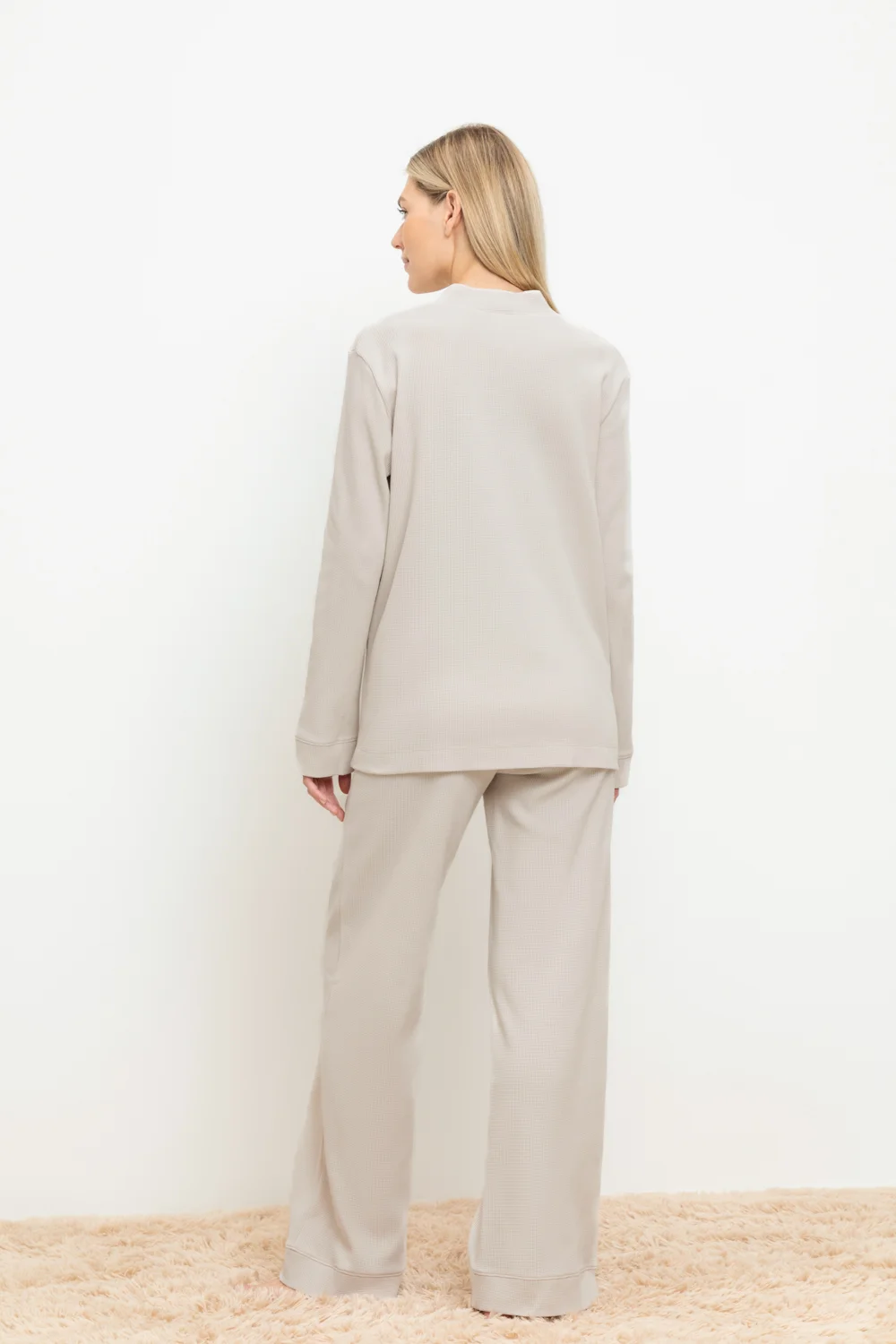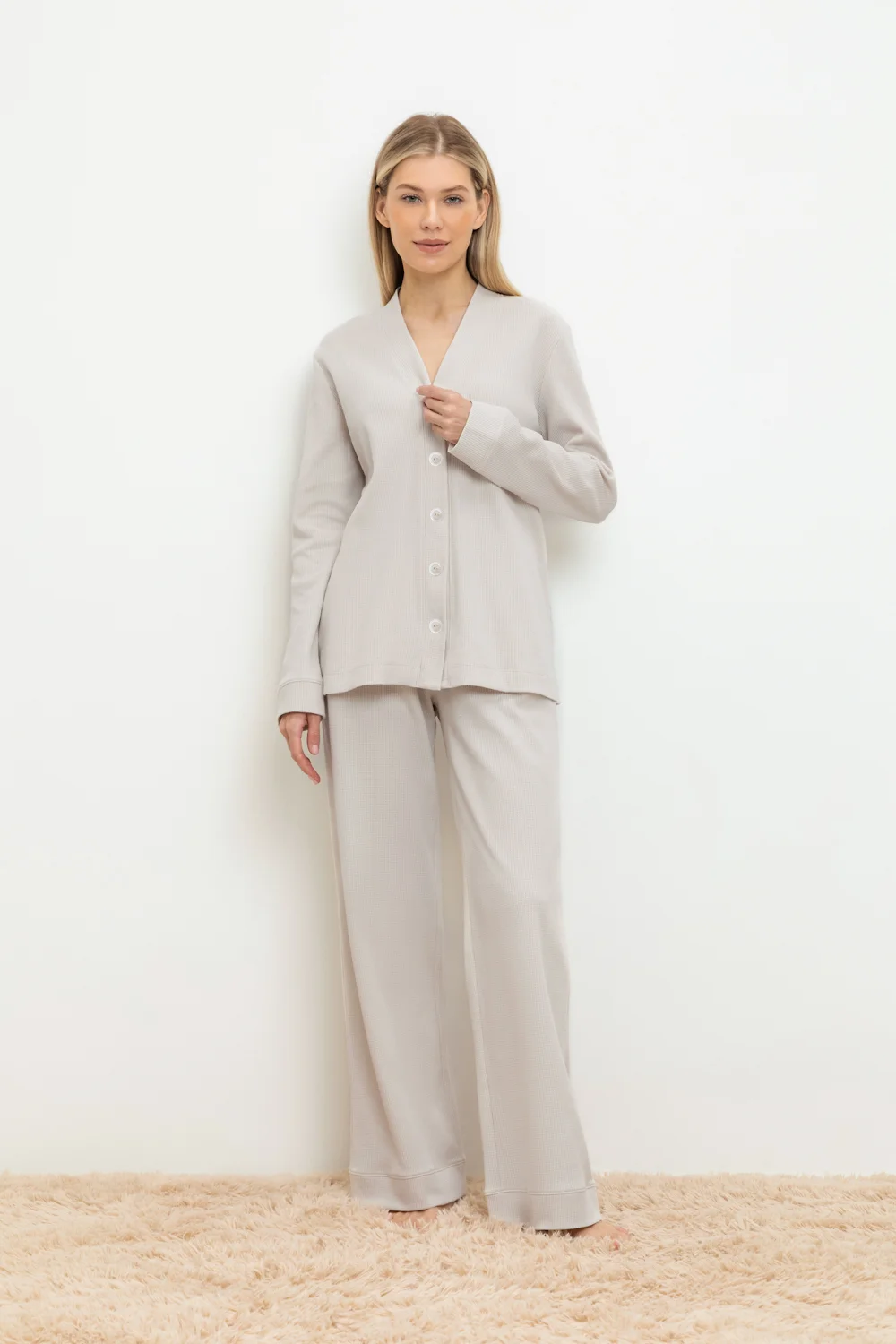 Комплект для комфортного сна и отдыха из вафельного полотна из 100% натурального хлопка. Рубашка с длинными рукавами и манжетами на пуговицах. Брюки с карманами и мягким поясом на резинке. Материал приятен к телу, не теряет форму и позволяет коже дышать.