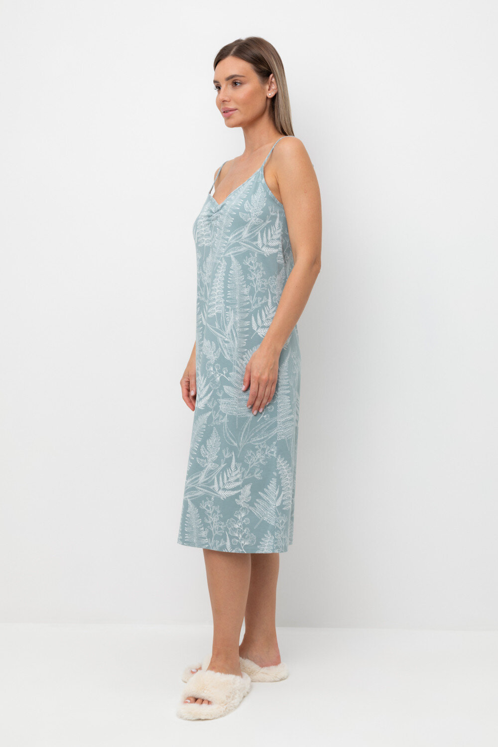 Элегантная женская сорочка с регулируемыми бретелями для комфортного сна. На груди декоративная сборка. Гладкий материал приятен к телу и позволяет коже дышать.