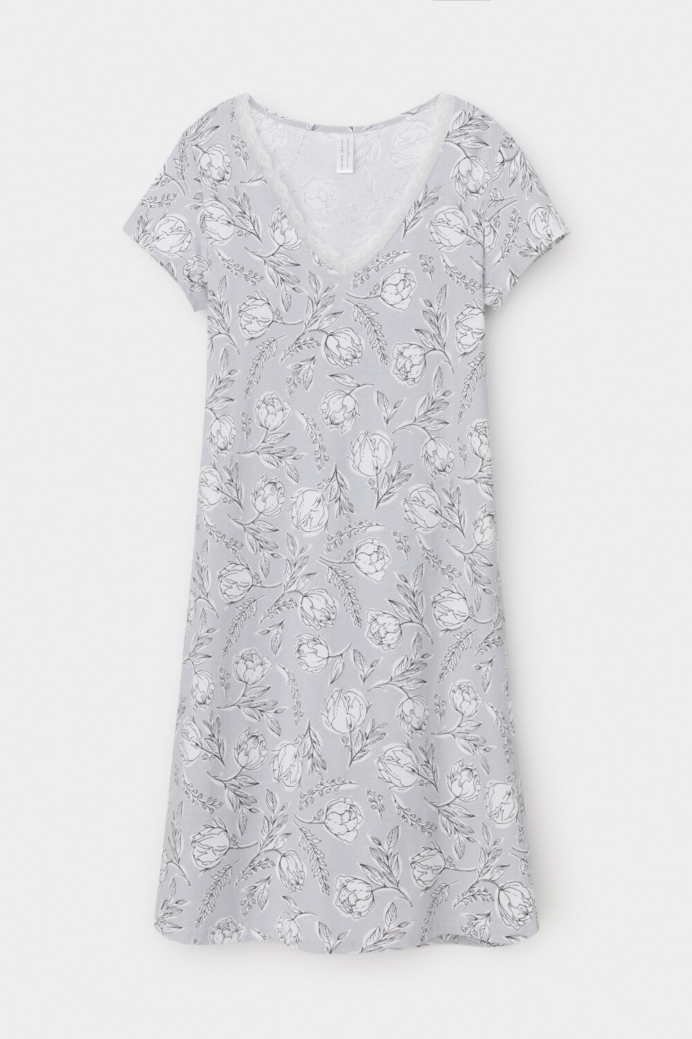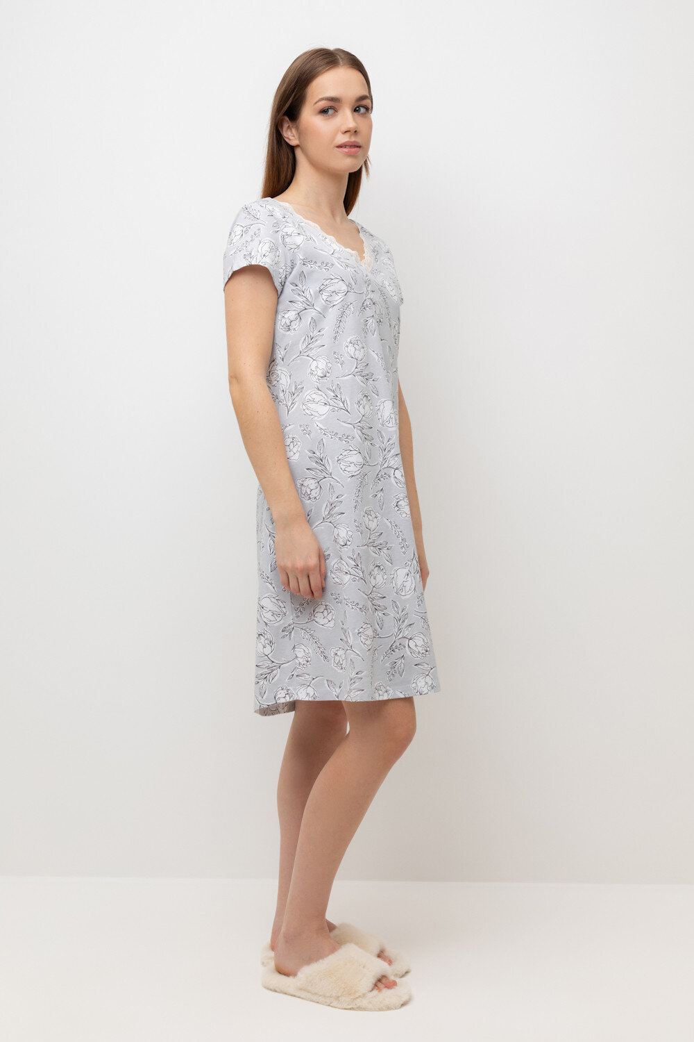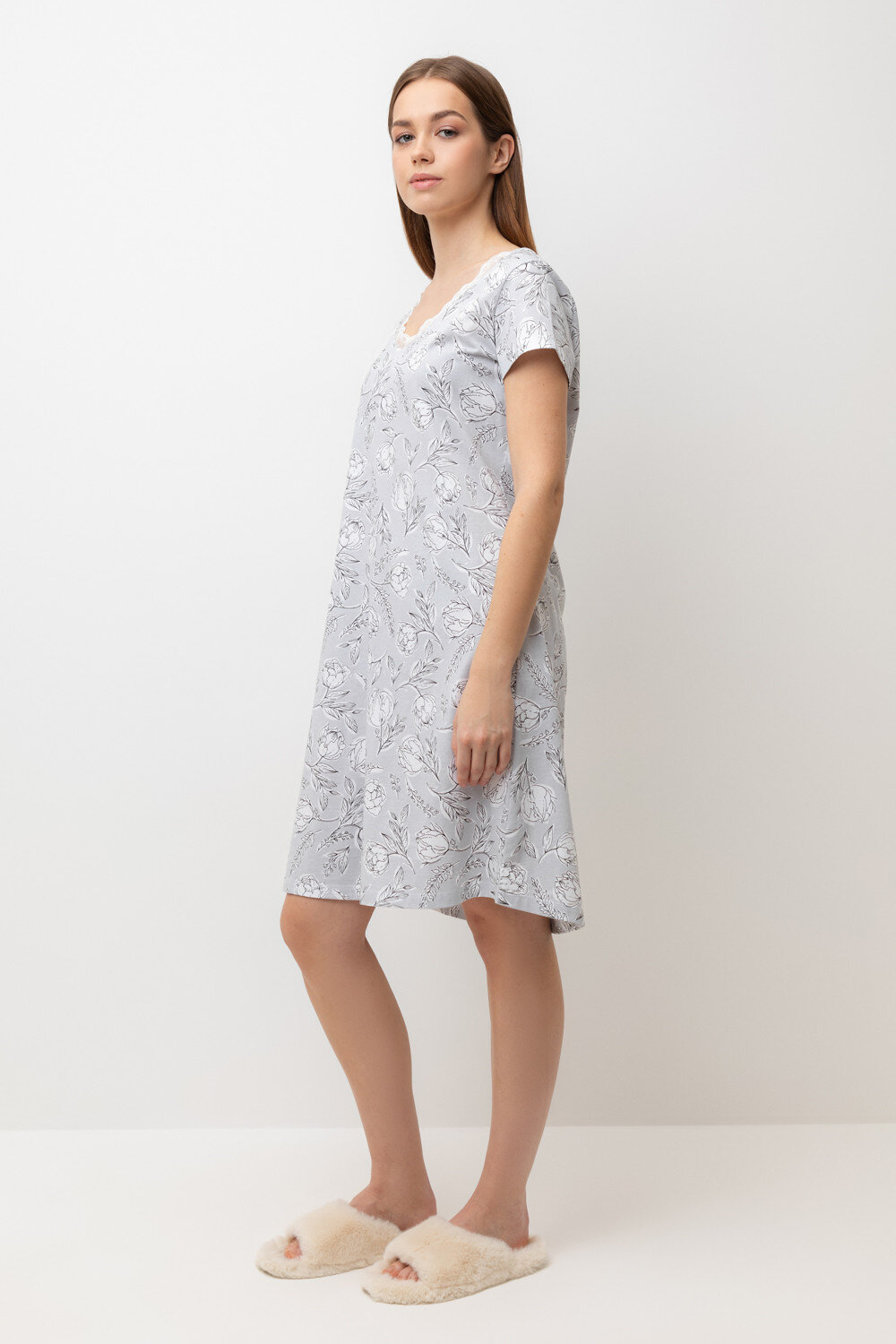 Уютная удлиненная сорочка с короткими рукавами из 100% натурального хлопка. Горловина украшена эластичным кружевом. Выполнена из набивного трикотажа супрем с нежным рисунком.