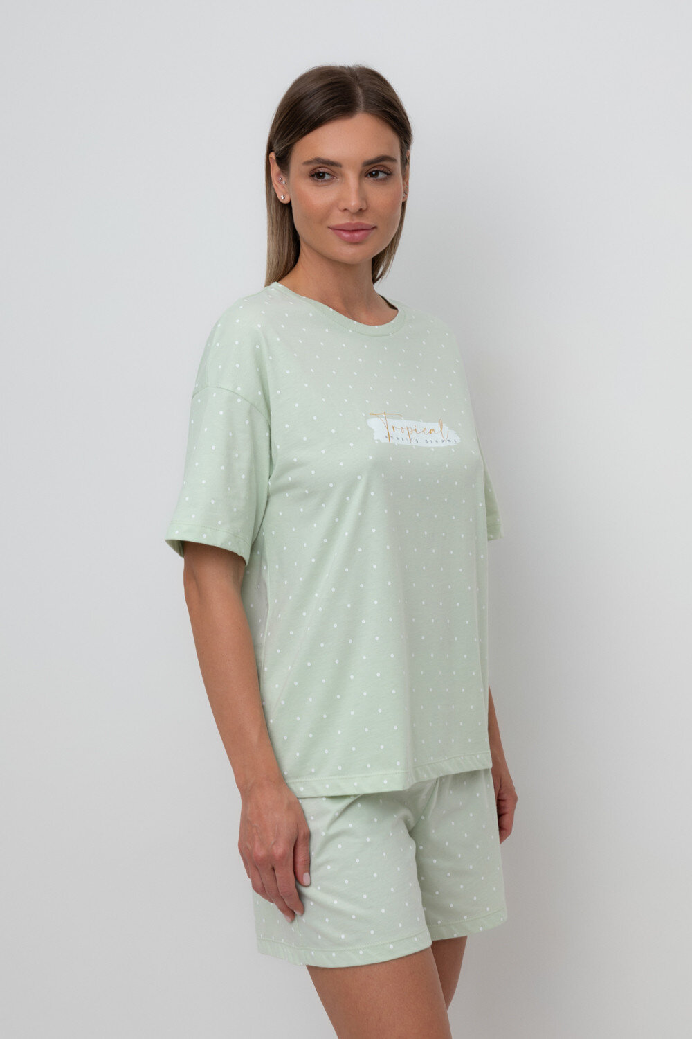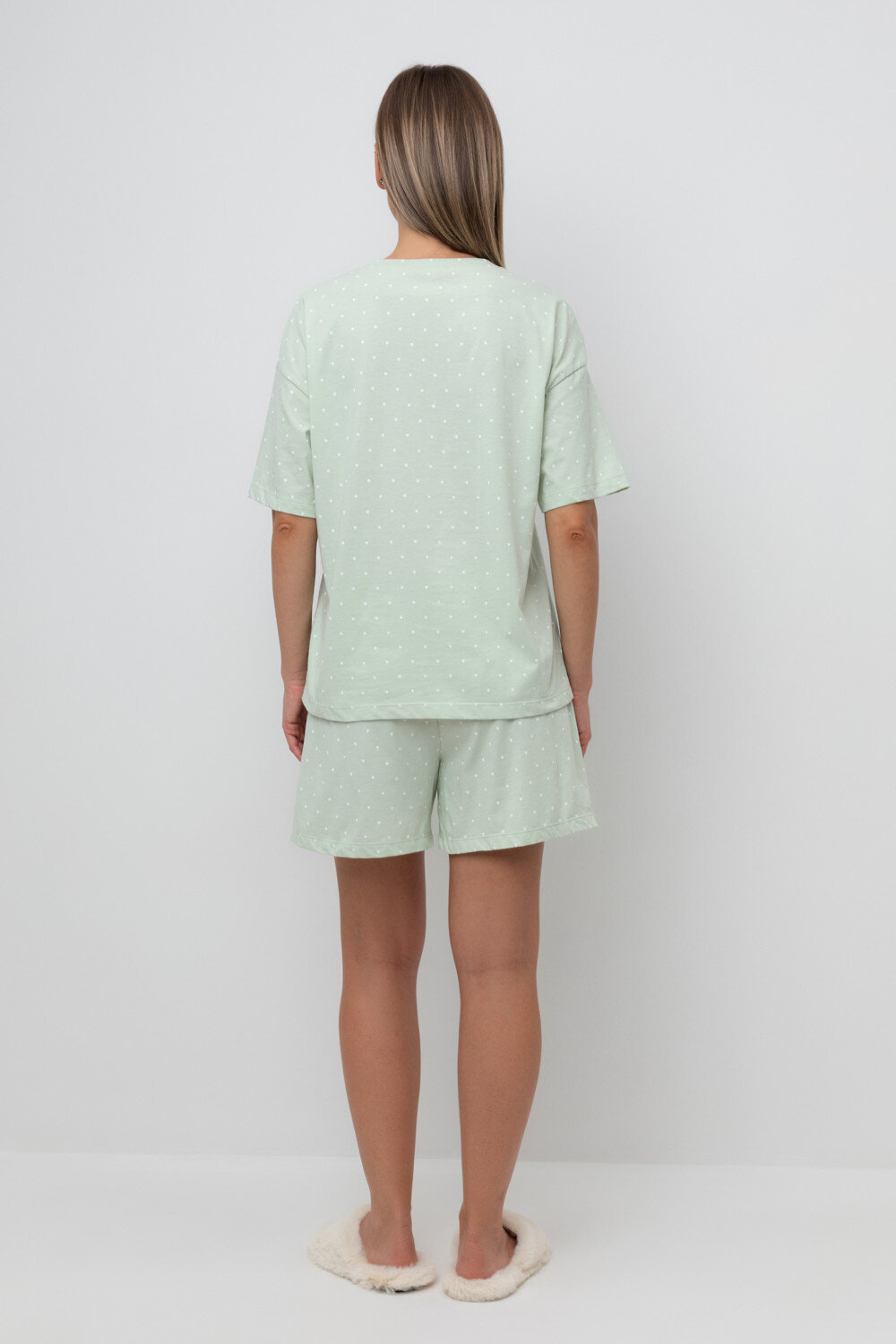 Комплект для комфортного сна и отдыха из трикотажа с нежным рисунком из 100% натурального хлопка. Футболка с короткими рукавами и спущенной линией плеча комфортно садится по фигуре. Шорты с мягким поясом на резинке. В поясе шорт атласная лента. Свободный силуэт не сковывает движения.