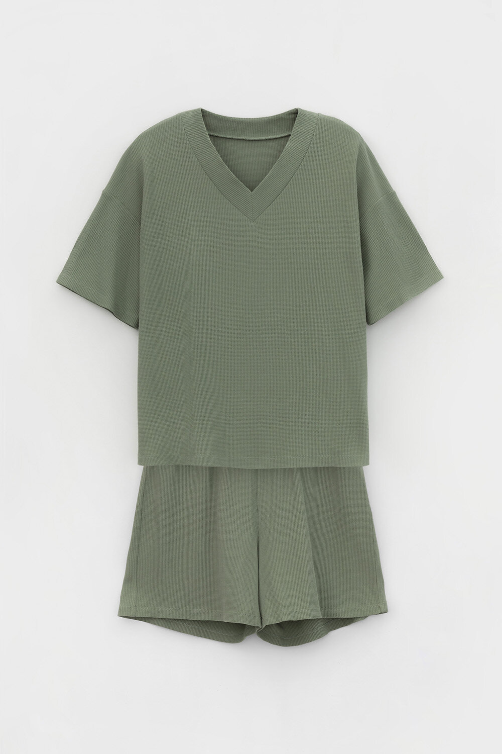 Комплект для комфортного отдыха из вафельного полотна. Укороченная футболка с короткими рукавами и спущенной линией плеча комфортно садится по фигуре. Шорты с мягким поясом на резинке и имитацией гульфика с пуговицами. Свободный силуэт не сковывает движения.