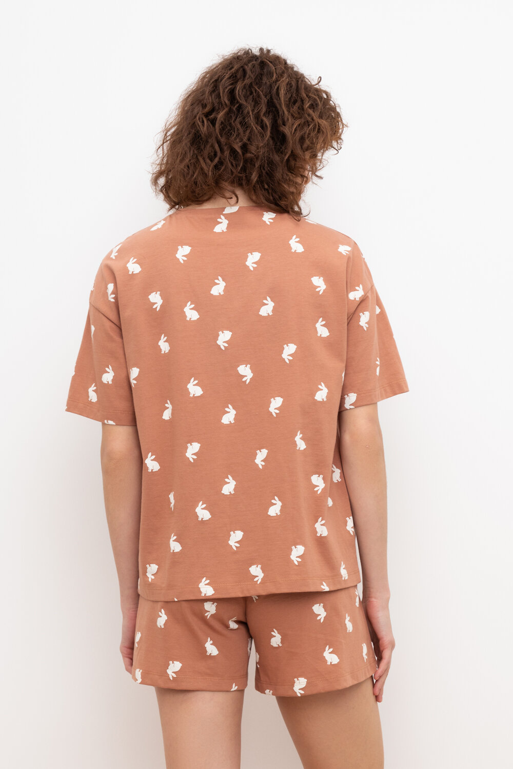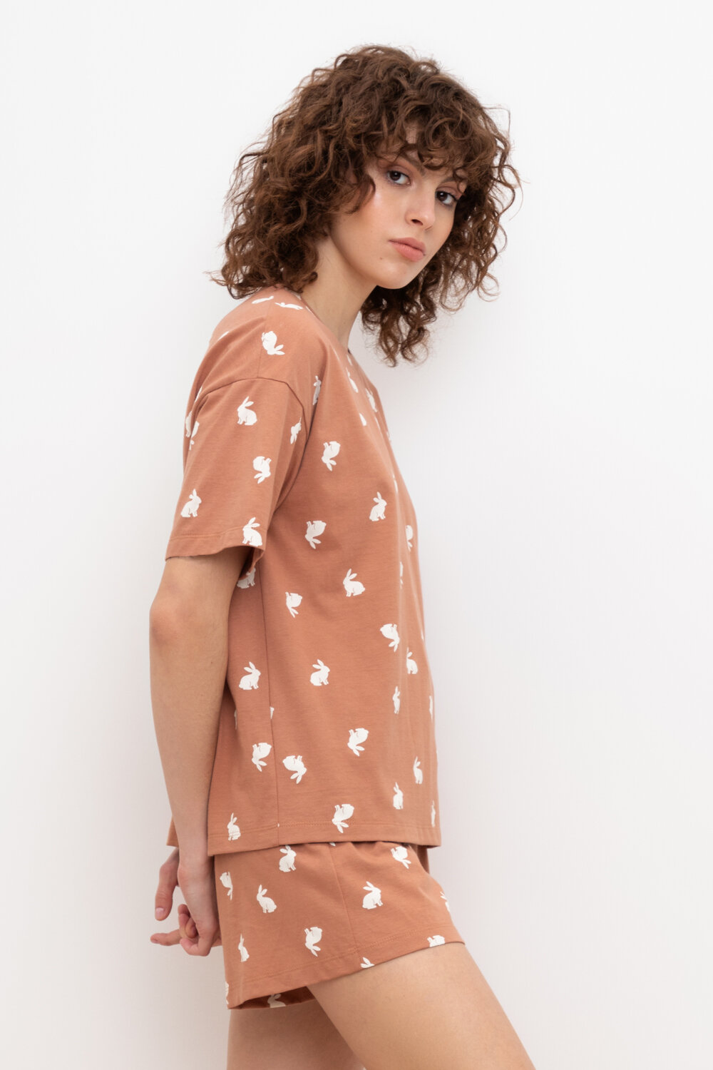 Комплект для комфортного отдыха из набивного трикотажа с нежным рисунком. Футболка с короткими рукавами и спущенной линией плеча комфортно садится по фигуре. Шорты с мягким поясом на резинке. Свободный силуэт не сковывает движения.