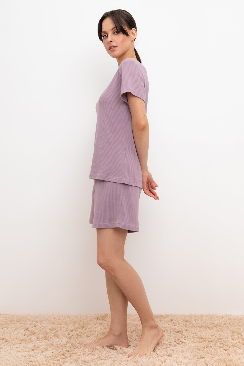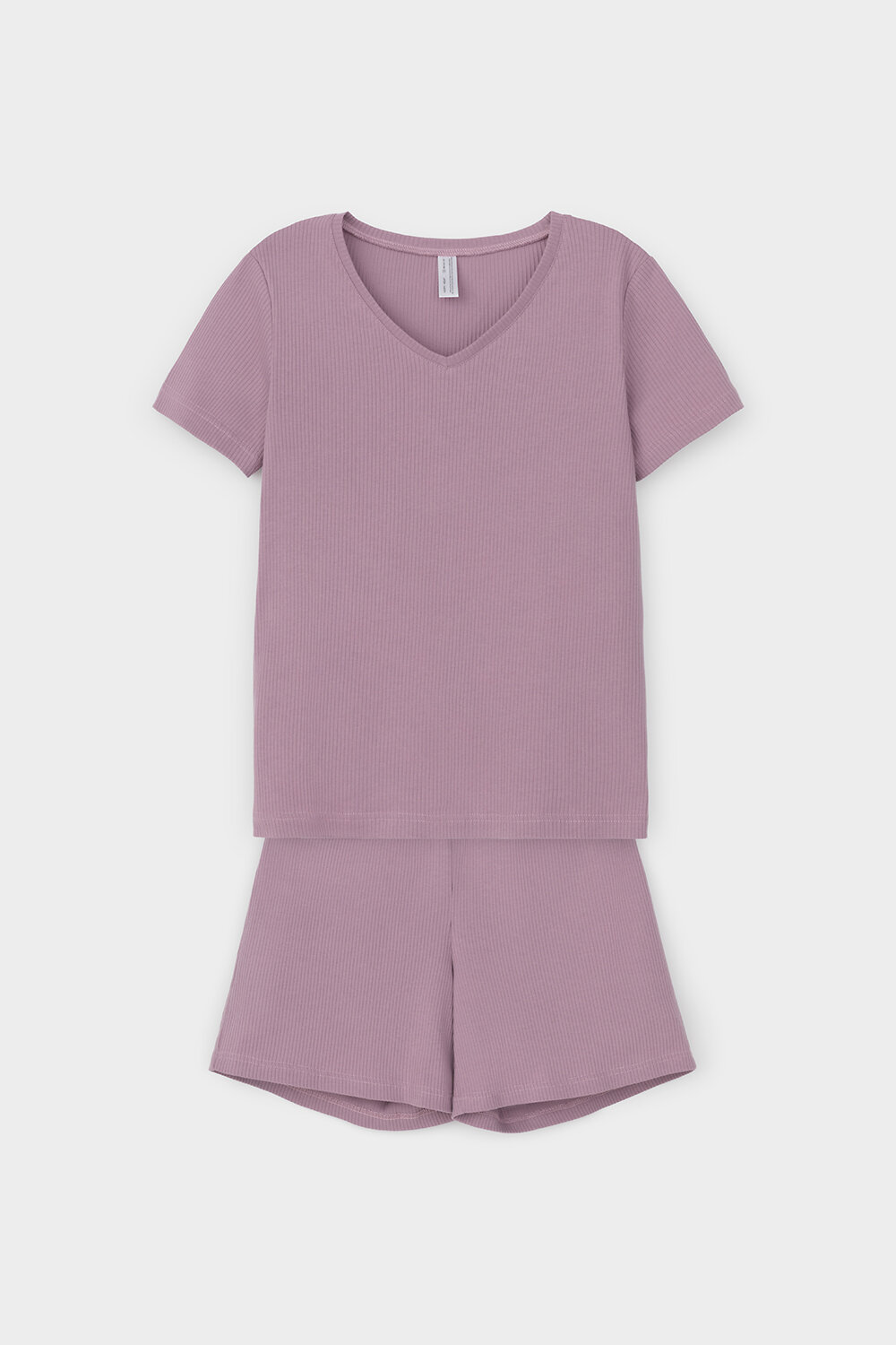 Комплект для комфортного сна и отдыха из трикотажного полотна в рубчик. Свободная футболка с V- образным вырезом. Шорты с мягким поясом на резинке удобно садятся по фигуре.