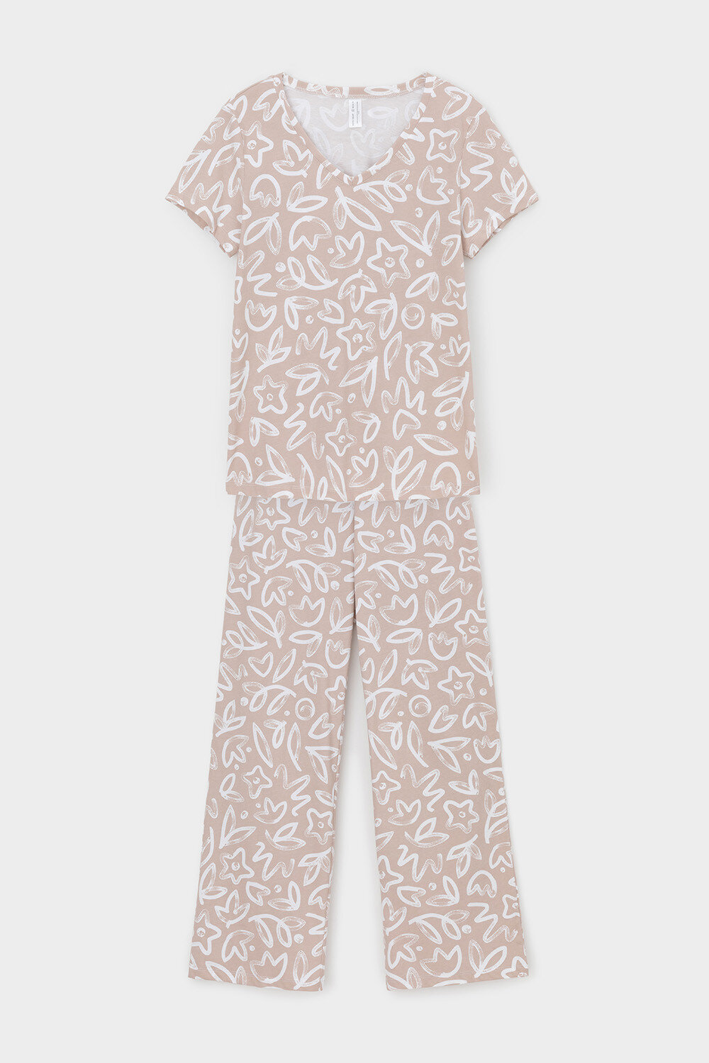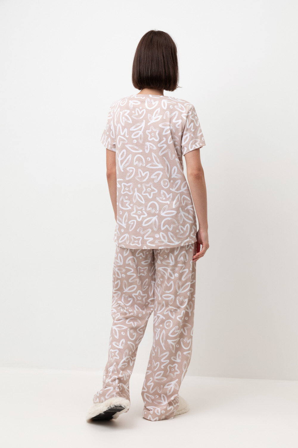 Легкий комплект для комфортного сна и отдыха из натурального хлопка. Футболка с V-образным вырезом комфортно садится по фигуре. Брюки с поясом на резинке выполнены из набивного трикотажа. Гладкий материал приятен к телу и позволяет коже дышать.
