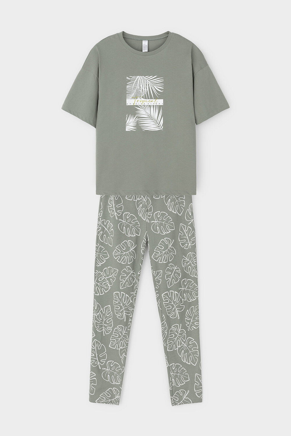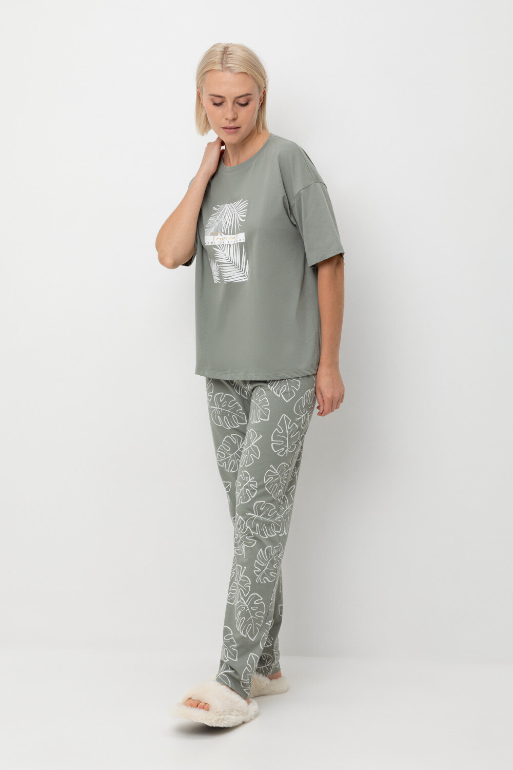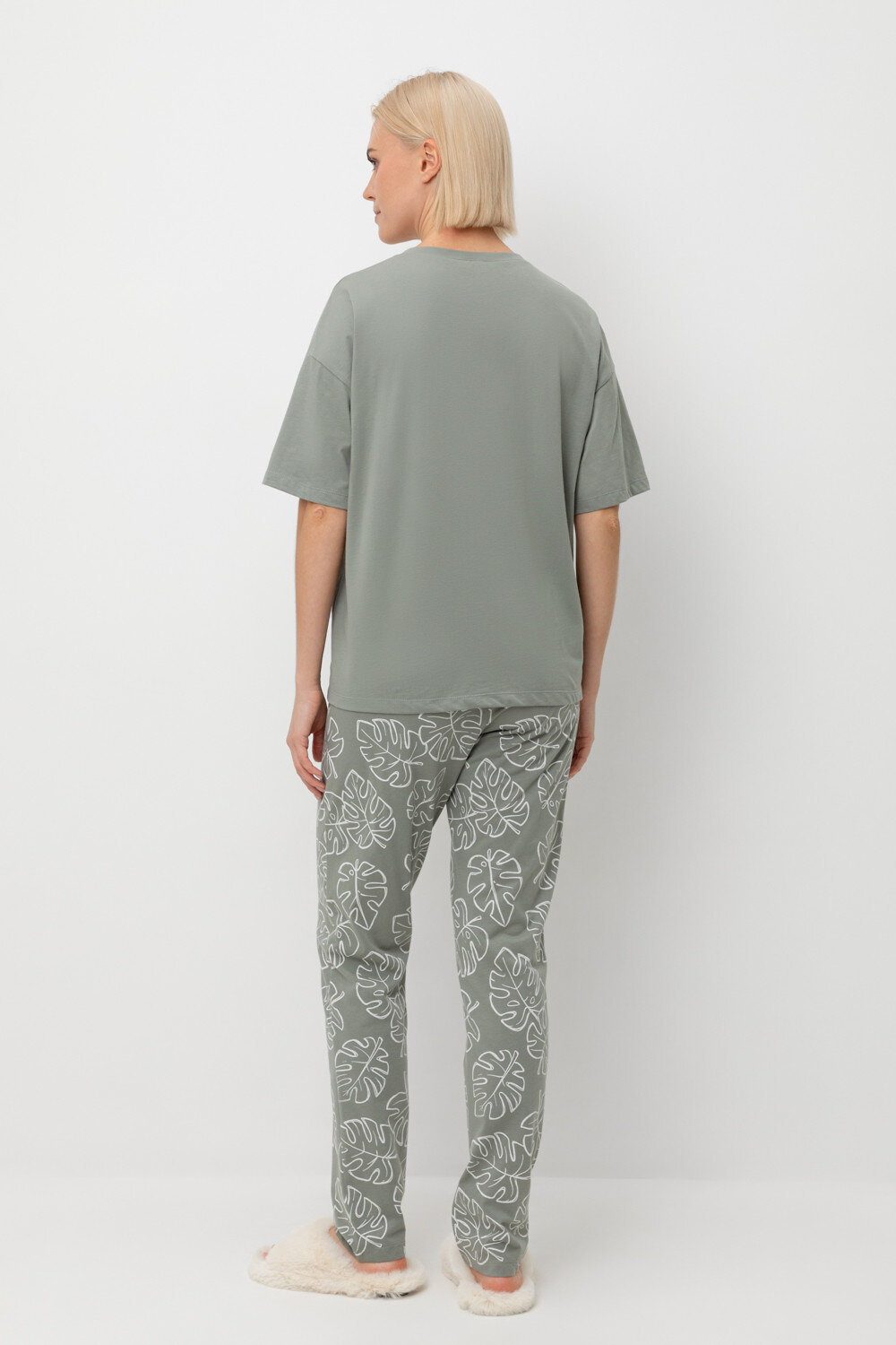 Легкий комплект для комфортного сна и отдыха из натурального хлопка. Футболка с карманом и спущенной линией плеча комфортно садится по фигуре. Брюки с поясом на резинке выполнены из набивного трикотажа. Гладкий материал приятен к телу и позволяет коже дышать.