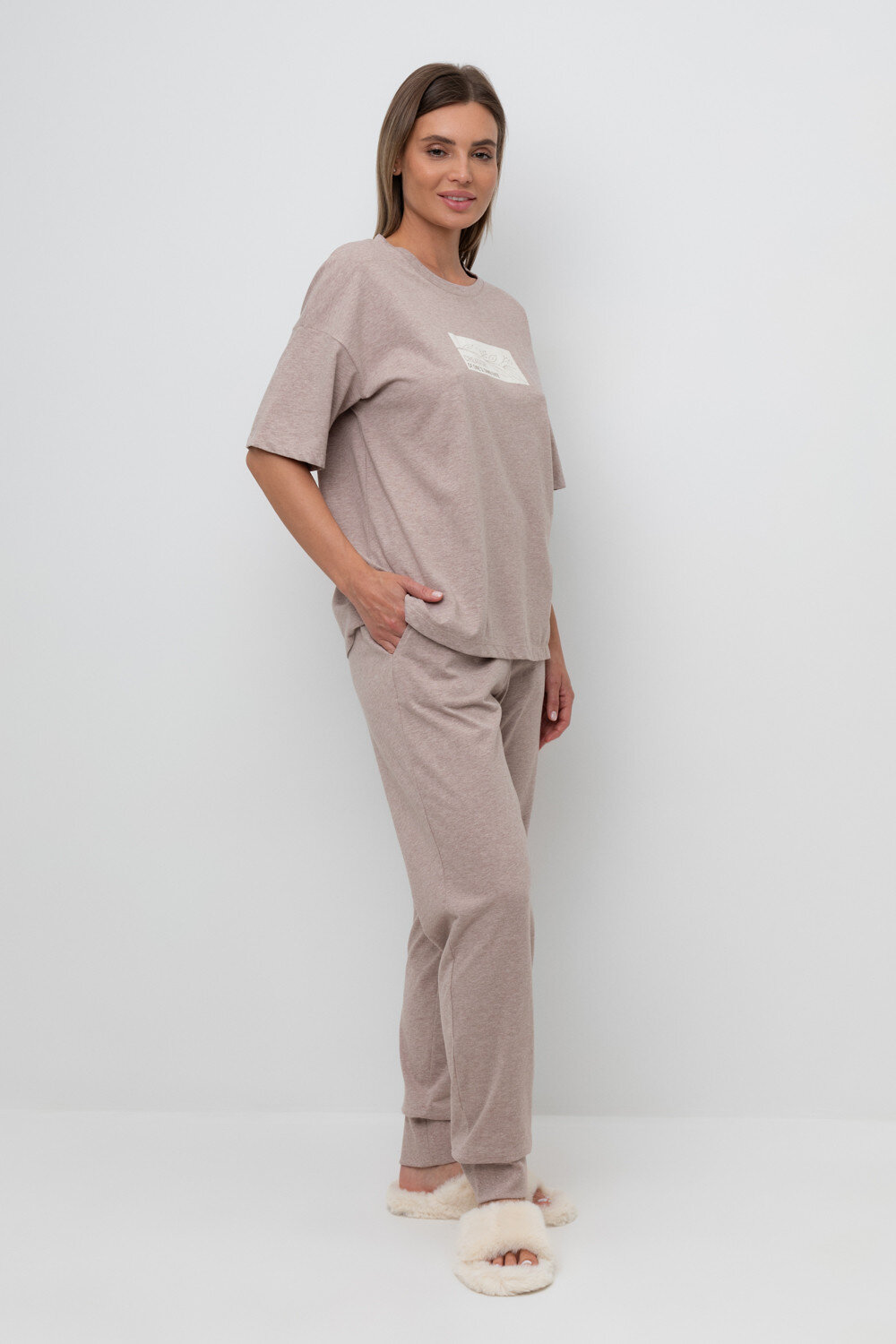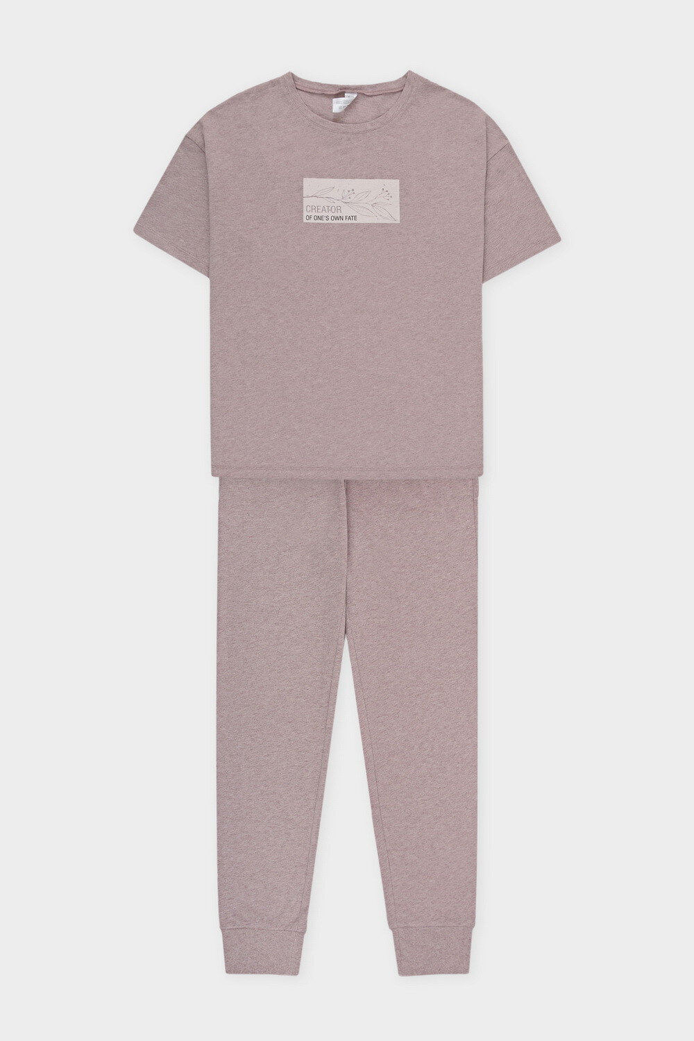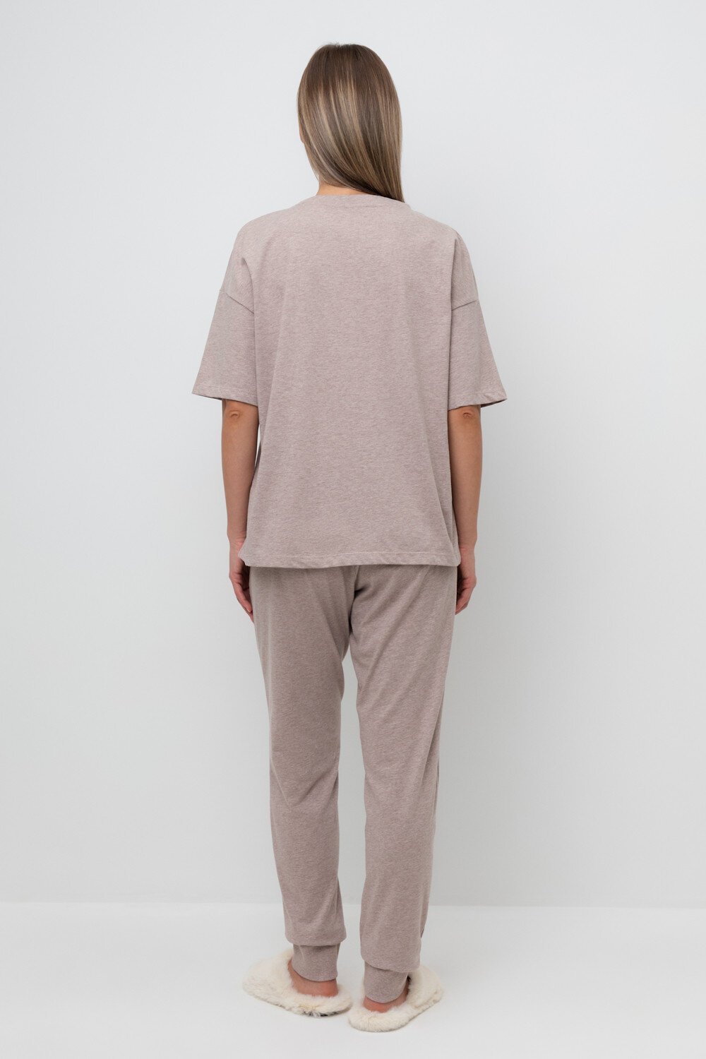 Легкий комплект для комфортного сна и отдыха из меланжевого трикотажа. Футболка с принтом и спущенной линией плеча комфортно садится по фигуре. Брюки с эластичными манжетами с боковыми карманами. Круглый шнур позволяет регулировать посадку. Гладкий материал приятен к телу и позволяет коже дышать.