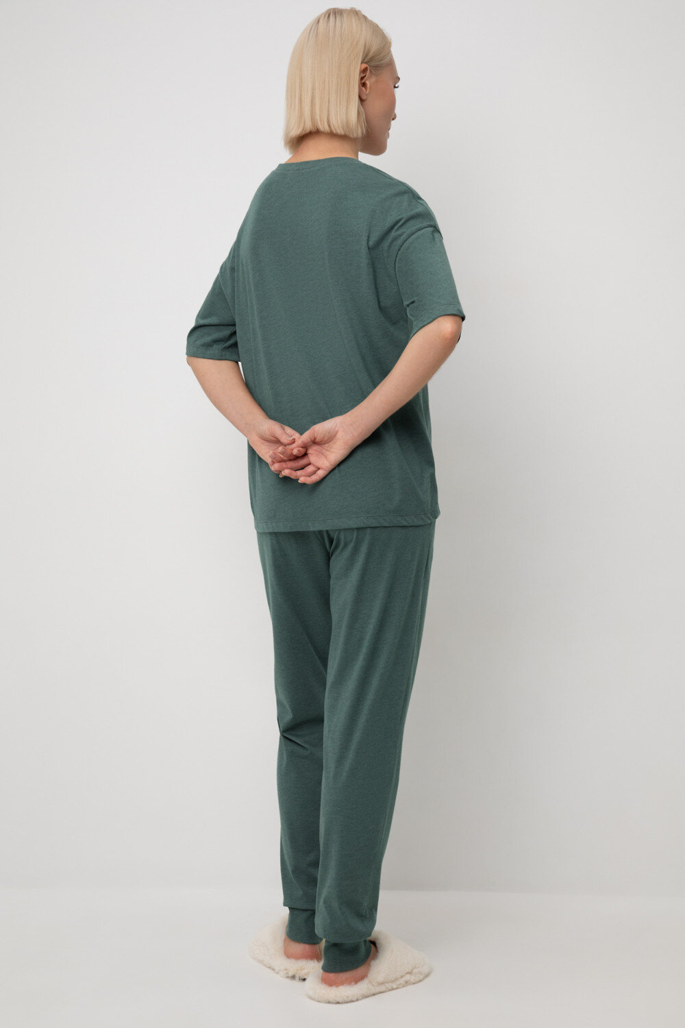 Легкий комплект для комфортного сна и отдыха из трикотажного полотна с эффектом меланжа. Футболка с принтом и спущенной линией плеча комфортно садится по фигуре. Брюки с эластичными манжетами с боковыми карманами. Круглый шнур позволяет регулировать посадку. Гладкий материал приятен к телу и позволяет коже дышать.