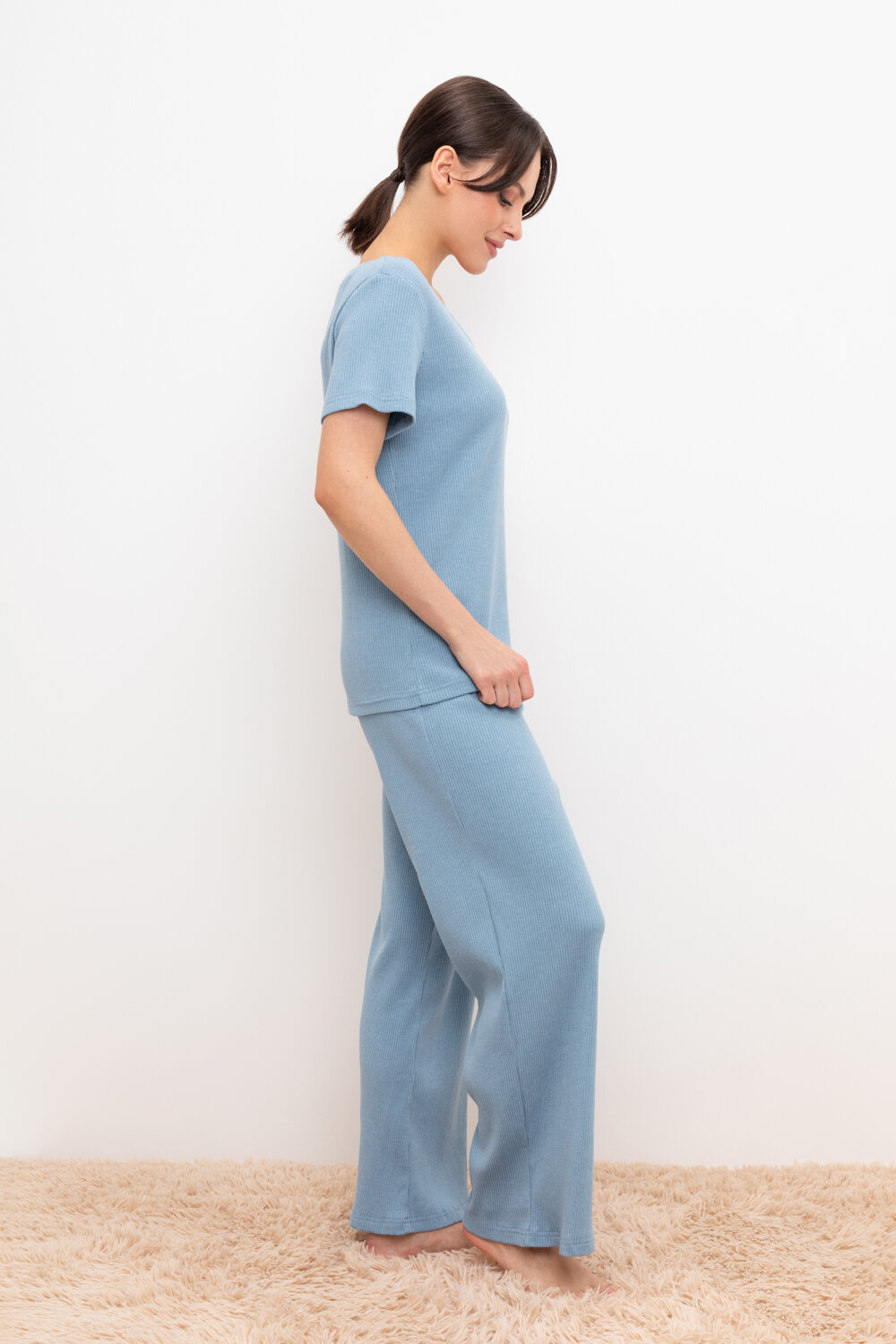 Комплект для комфортного сна и отдыха из трикотажного полотна в рубчик. Свободная футболка с V- образным вырезом. Брюки с мягким поясом на резинке удобно садятся по фигуре.