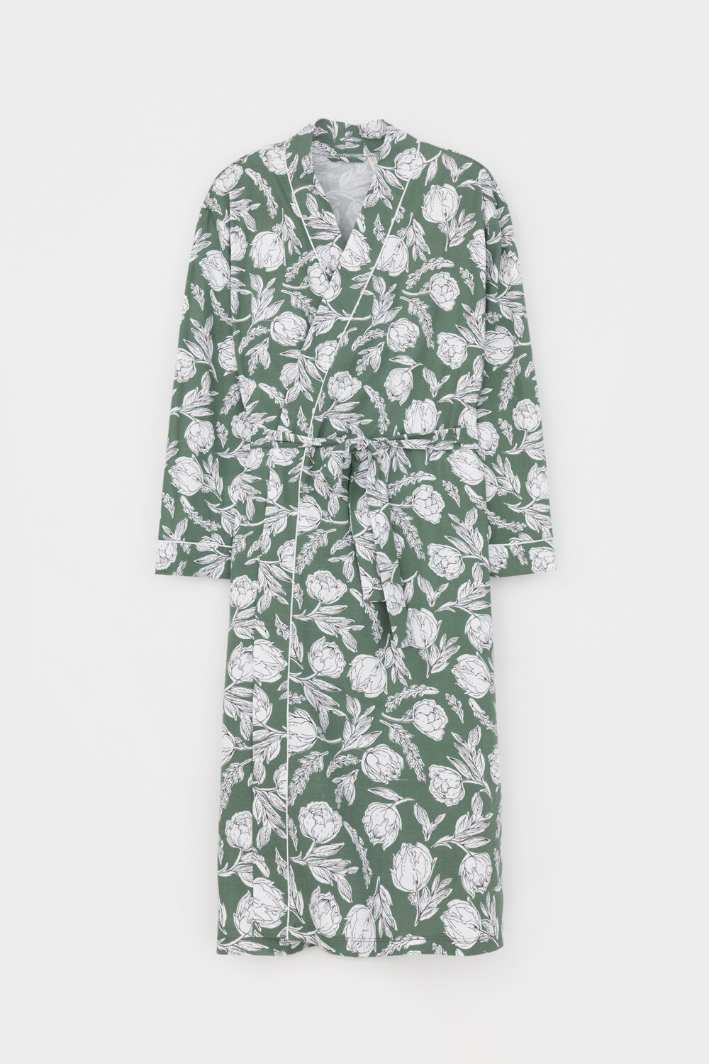 Уютный легкий халат из набивного трикотажа на запах с длинными рукавами. В боковых швах два удобных кармана. С помощью пояса можно регулировать посадку и силуэт. Гладкий материал приятен к телу и позволяет коже дышать.