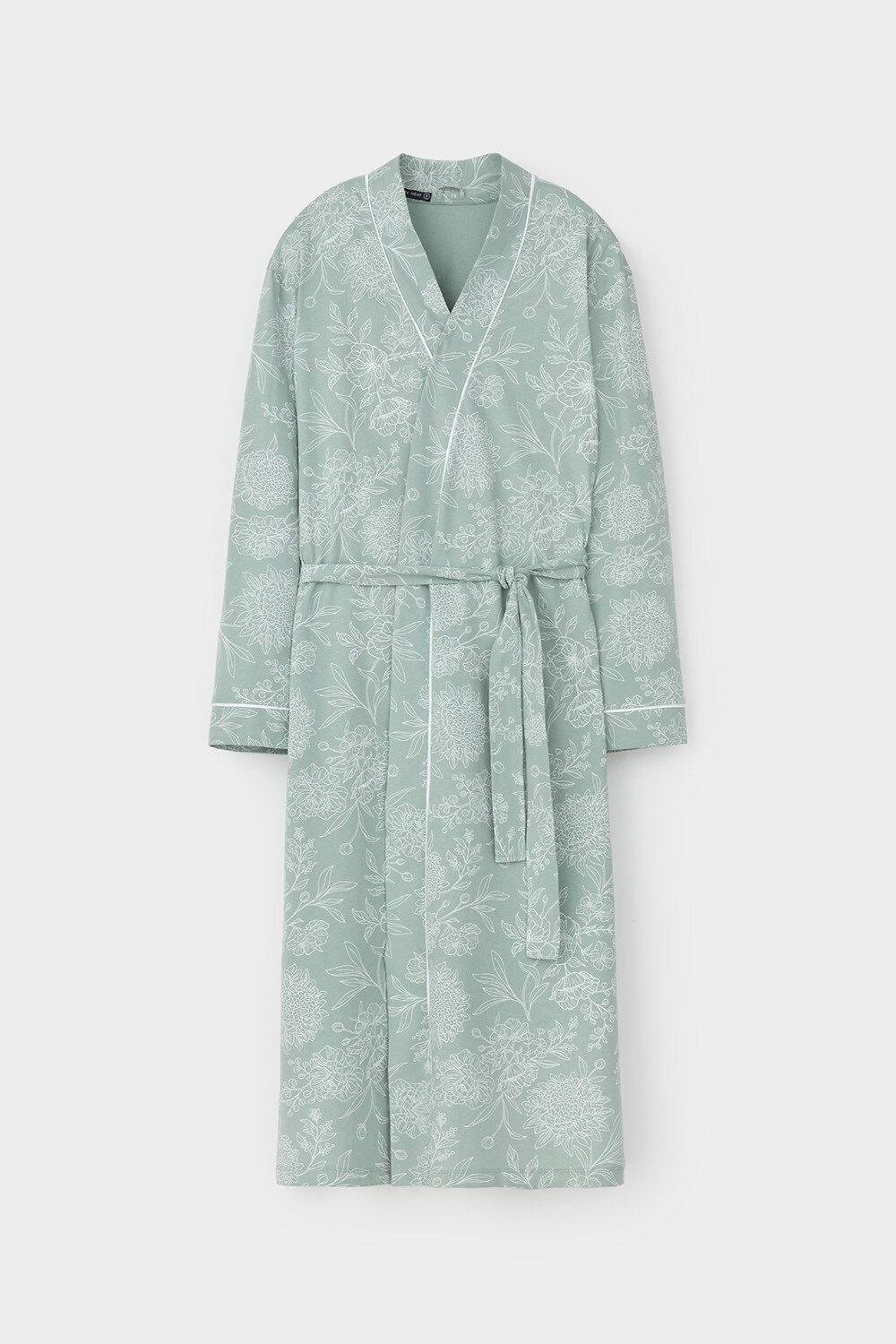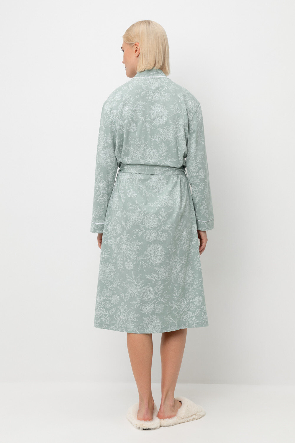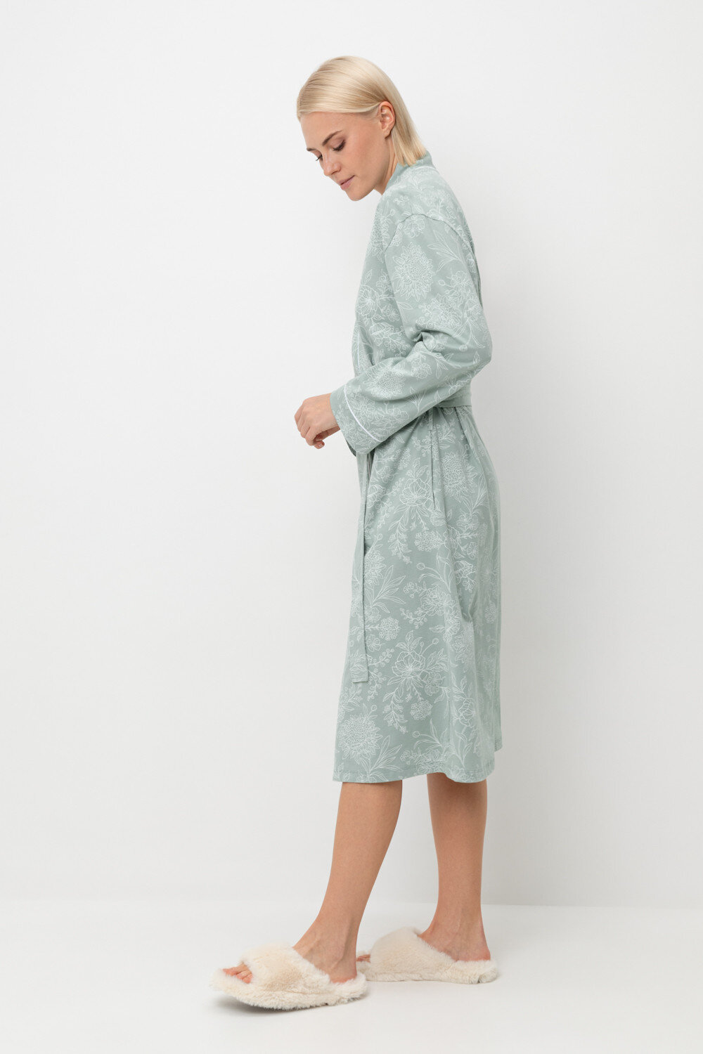 Уютный легкий халат из набивного трикотажа на запах с длинными рукавами. В боковых швах два удобных кармана. С помощью пояса можно регулировать посадку и силуэт. Гладкий материал приятен к телу и позволяет коже дышать.