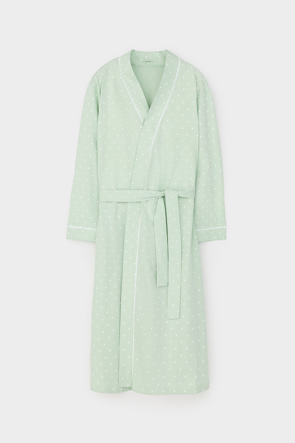 Уютный легкий халат из набивного трикотажа на запах с длинными рукавами. В боковых швах два удобных кармана. С помощью пояса можно регулировать посадку и силуэт. Гладкий материал приятен к телу и позволяет коже дышать.
