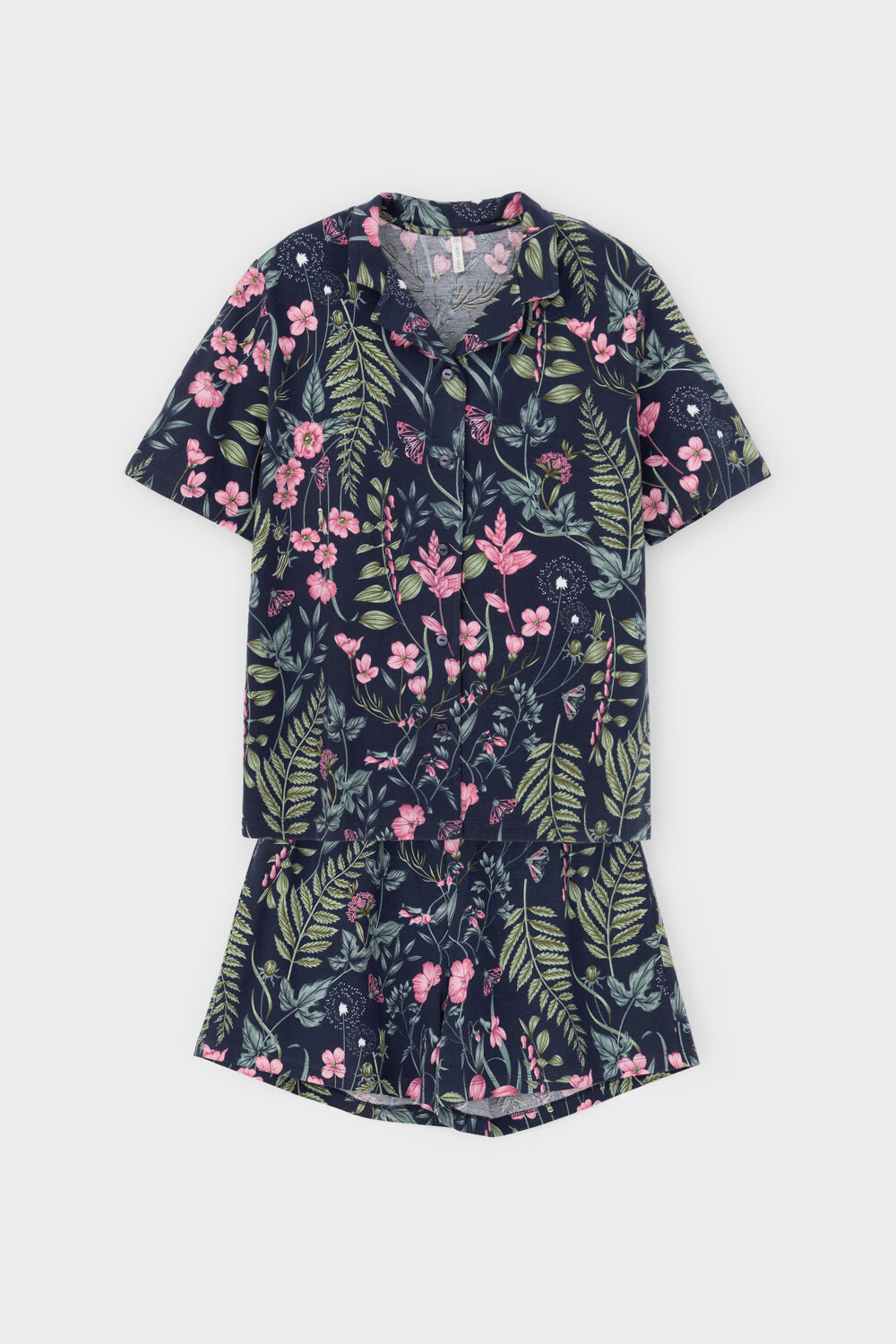 Комплект для комфортного сна из набивного трикотажа с нежным рисунком из 100% натурального хлопка. Рубашка с короткими рукавами на пуговицах. Шорты с мягким поясом на резинке. Гладкий материал приятен к телу, не теряет форму и позволяет коже дышать.