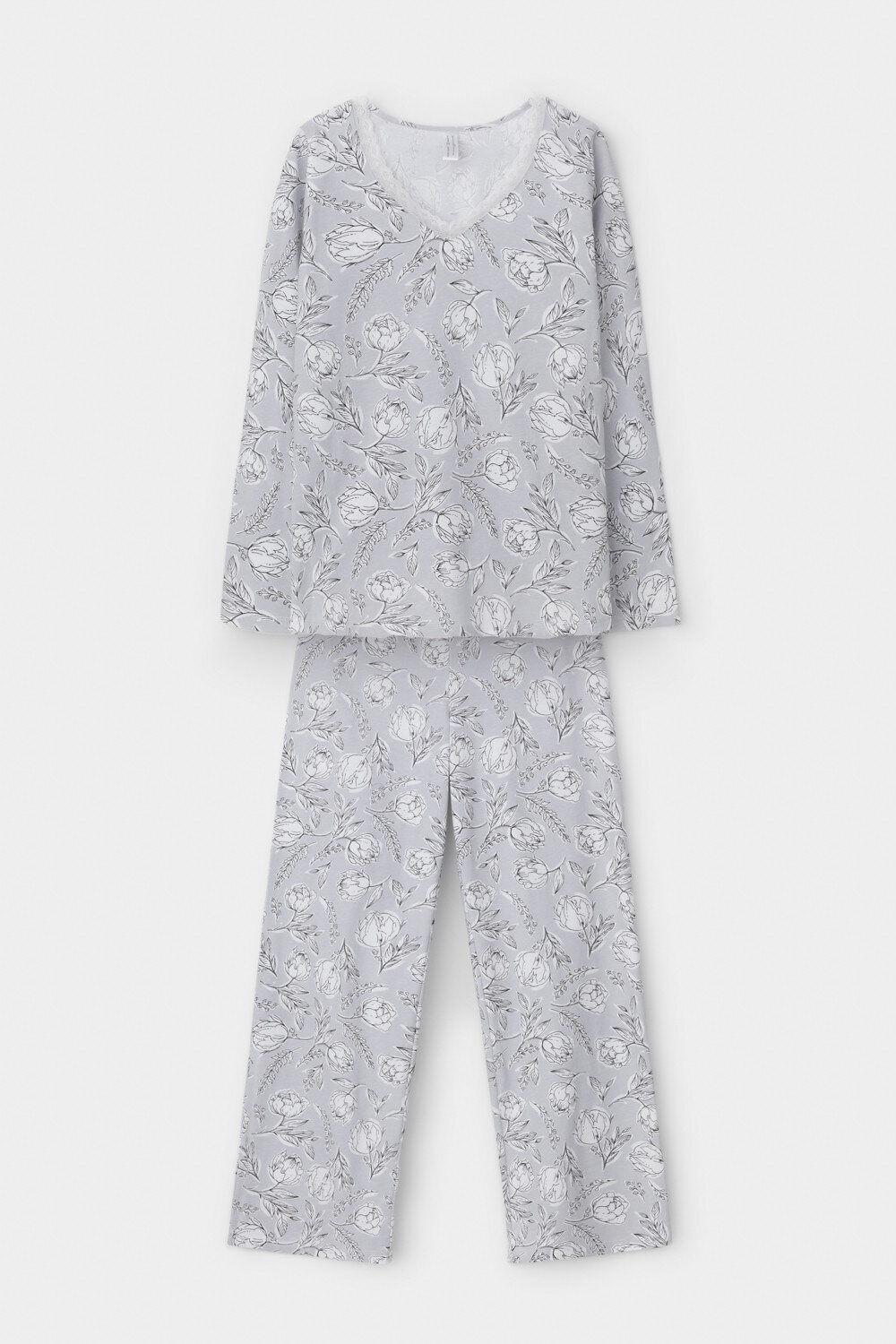 Легкий комплект для комфортного сна и отдыха набивного трикотажа с нежным рисунком из 100% натурального хлопка. Джемпер с V-образным вырезом, украшенный эластичным кружевом комфортно садится по фигуре. Брюки с поясом на резинке и атласной лентой. Гладкий материал приятен к телу и позволяет коже дышать.
