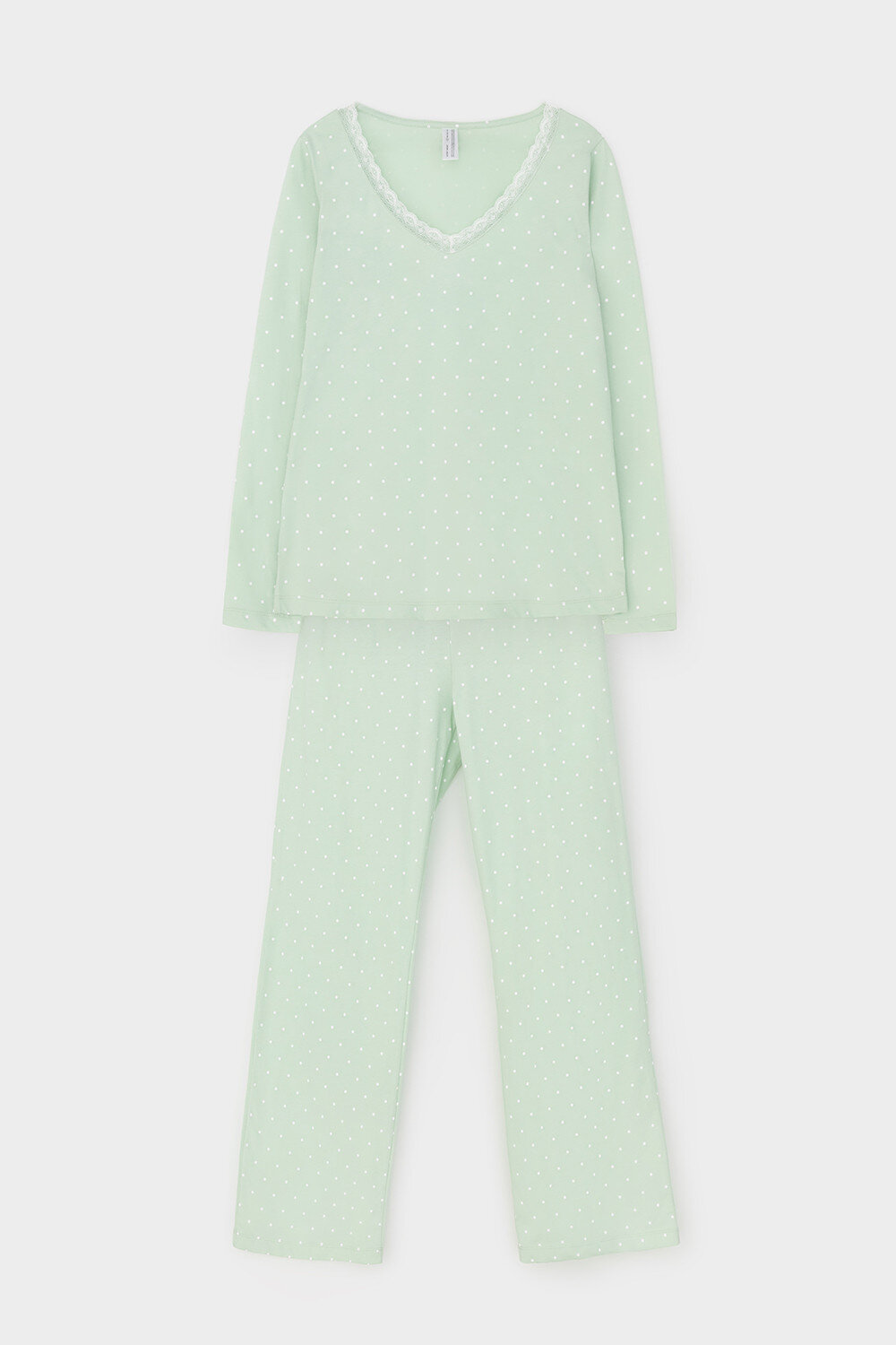 Легкий комплект для комфортного сна и отдыха набивного трикотажа с нежным рисунком из 100% натурального хлопка. Джемпер с V-образным вырезом, украшенный эластичным кружевом комфортно садится по фигуре. Брюки с поясом на резинке и атласной лентой. Гладкий материал приятен к телу и позволяет коже дышать.