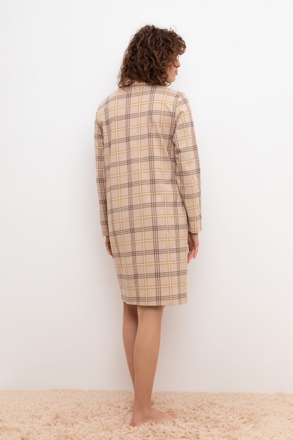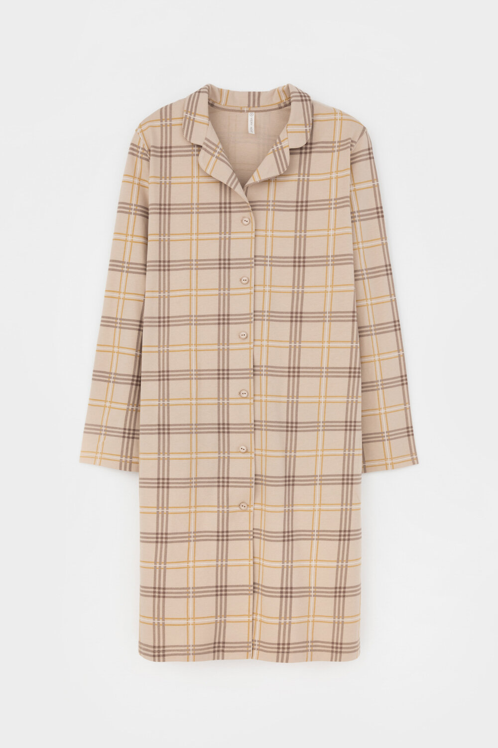 Рубашка-халат с длинными рукавами на пуговицах из набивного трикотажа. Гладкий материал приятен к телу и позволяет коже дышать.