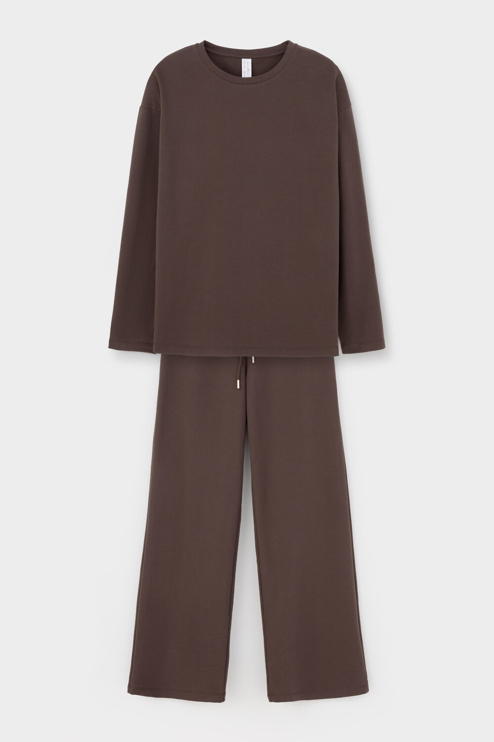 Комплект для комфортного отдыха из мягкого футера петли. Джемпер с длинными рукавами и спущенной линией плеча комфортно садится по фигуре. Брюки с карманами и мягким поясом на резинке. Свободный силуэт не сковывает движения.