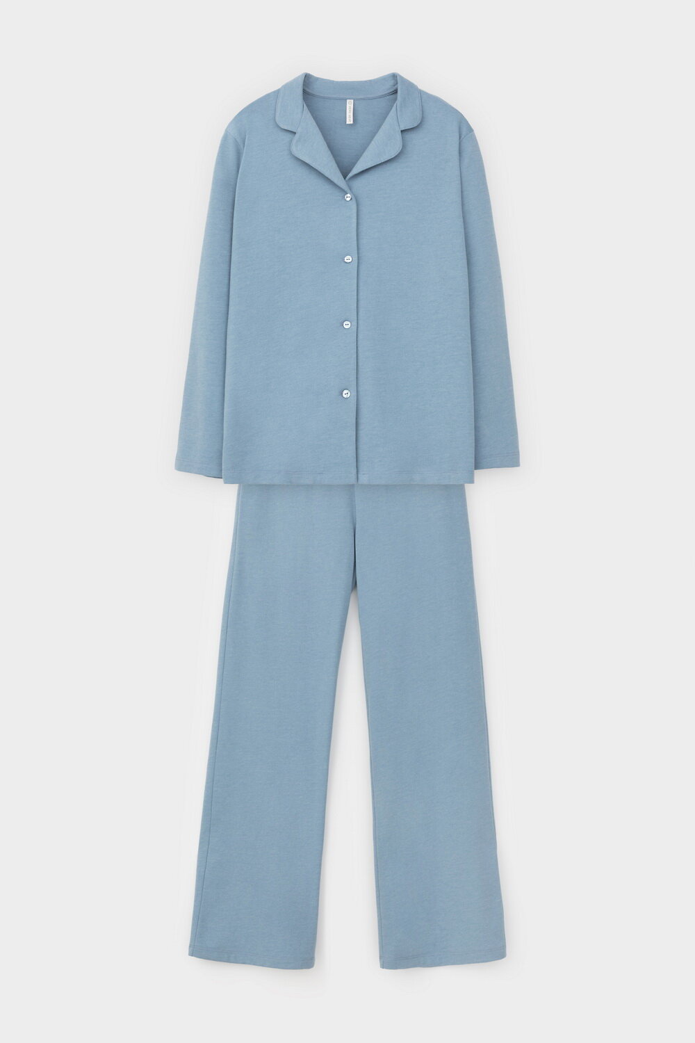 Комплект для комфортного сна и отдыха из однотонного трикотажа с содержанием полиэстера. Рубашка с длинными рукавами на пуговицах. Брюки с мягким поясом на резинке. Гладкий материал приятен к телу, не теряет форму и позволяет коже дышать.