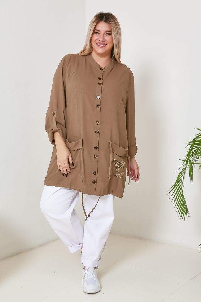 хаки Стильная туника прямого силуэта. Модель выполнена из льняной ткани приятной расцветки. Перед с вертикальными рельефами, на уровне бедер дополнен большими накладными карманами с отворотами и завязками на концах. Верхняя часть спинки оформлена кокеткой и диагональными вставками от горловины к пройме. Круглый вырез горловины оформлен воротником стойкой, застежка центральная, на петли и пуговицы. Рукав длинный втачной по центру дополнен патой с застежкой на петлю и пуговицу. По центру спинки внизу фигурный вырез, низ изделия с кулиской. Оригинальным дизайнерским решением является печатный рисунок на спинке и на левом кармане, а также контрастные пуговицы в тон рисунка.