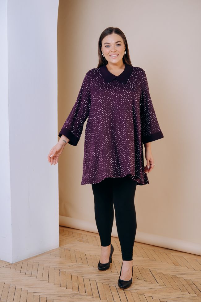 фиолетовый Туника свободного силуэта из тонкого мягкого трикотажа принт. Втачные рукава с манжетой, длиной 3/4. Круглый вырез горловины дополнен воротником. Манжеты и воротник выполнены в виде отделки из однотонного трикотажа в цвет Туника свободного силуэта из тонкого мягкого трикотажа принт. Втачные рукава с манжетой, длиной 3/4. Круглый вырез горловины дополнен воротником. Манжеты и воротник выполнены в виде отделки из однотонного трикотажа в цвет основого материала. Низ асимметричный, укорочен по переду.  материала. Низ асимметричный, укорочен по переду.