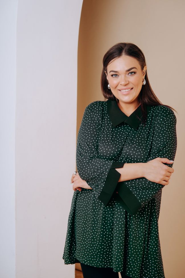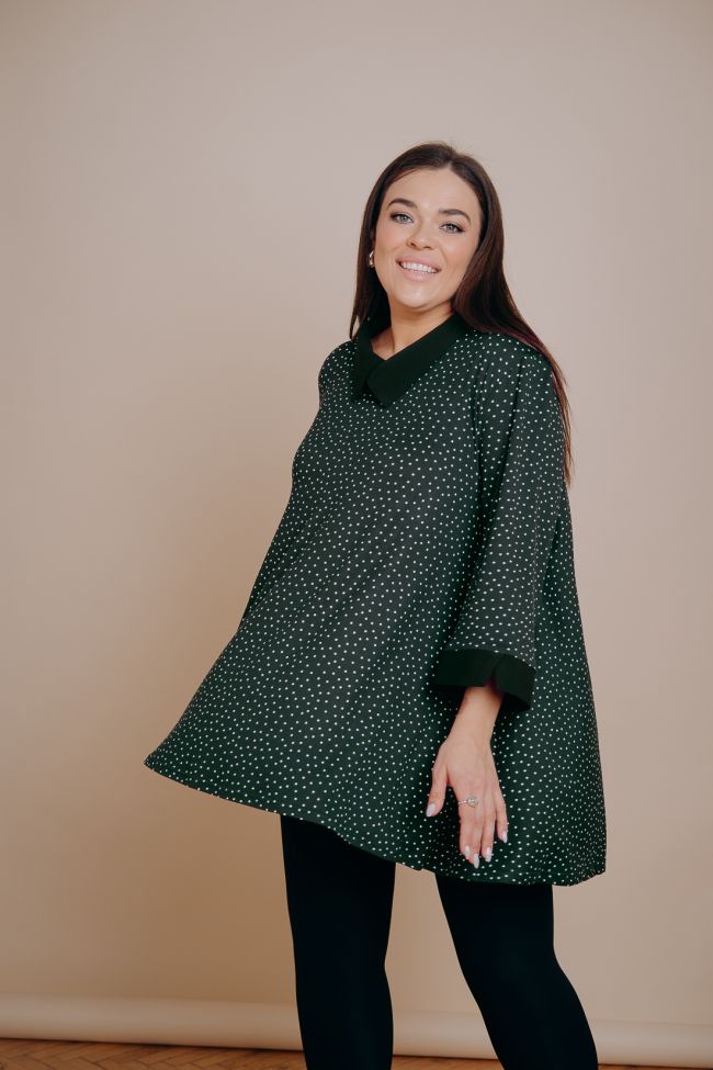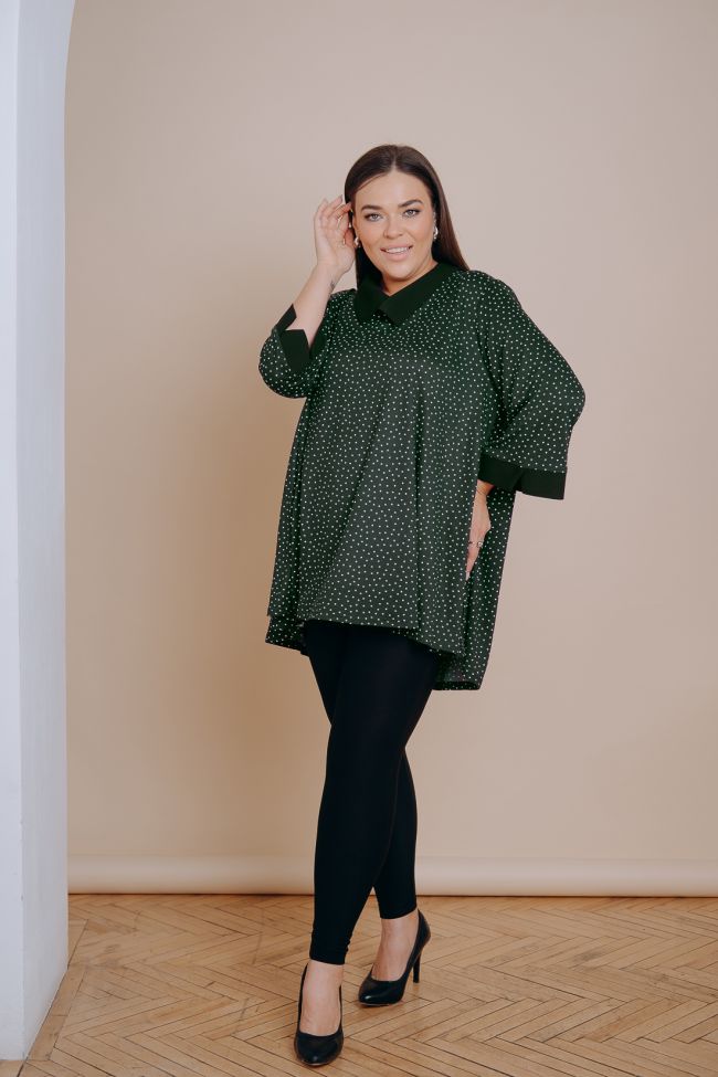 темно-зеленый Туника свободного силуэта из тонкого мягкого трикотажа принт. Втачные рукава с манжетой, длиной 3/4. Круглый вырез горловины дополнен воротником. Манжеты и воротник выполнены в виде отделки из однотонного трикотажа в цвет Туника свободного силуэта из тонкого мягкого трикотажа принт. Втачные рукава с манжетой, длиной 3/4. Круглый вырез горловины дополнен воротником. Манжеты и воротник выполнены в виде отделки из однотонного трикотажа в цвет основного материала. Низ асимметричный, укорочен по переду  материала. Низ асимметричный, укорочен по переду.