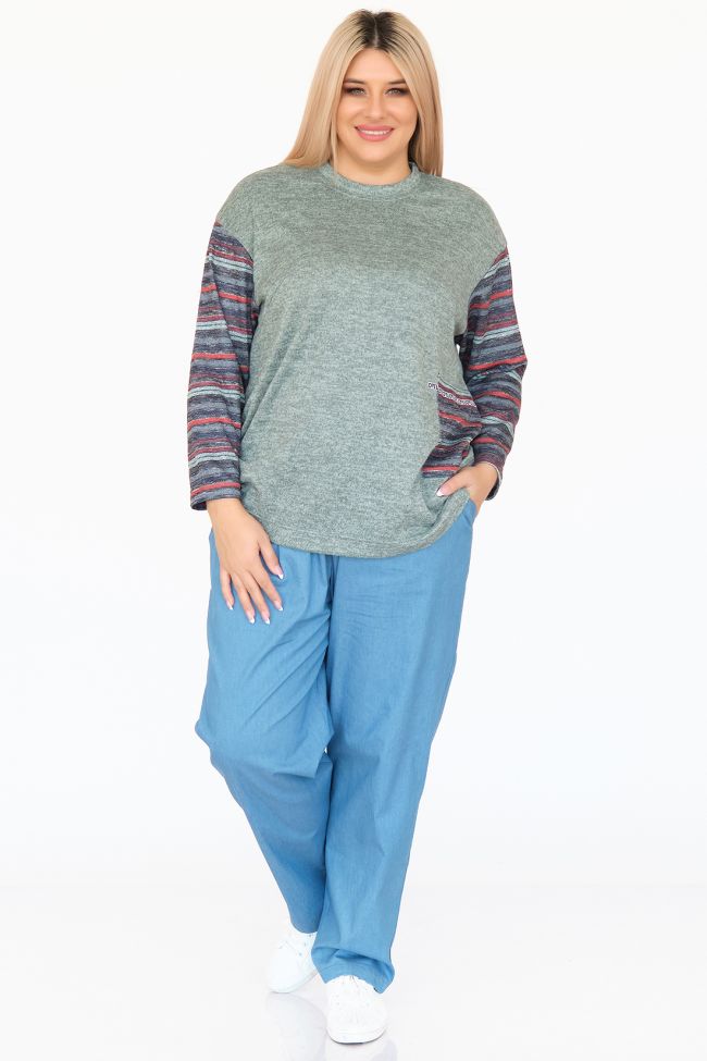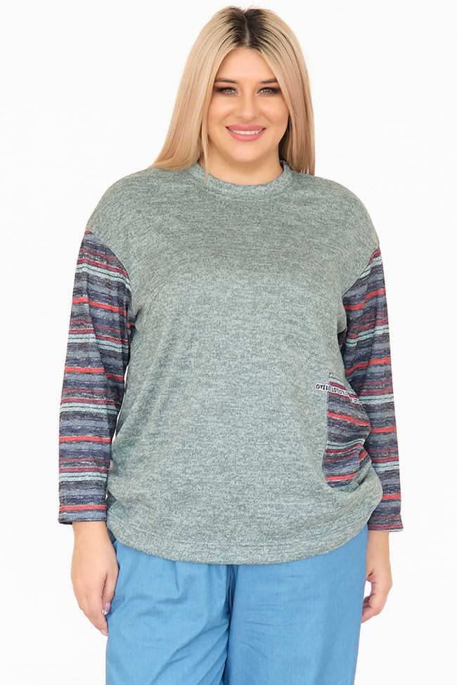 зеленый Оригинальная туника свободного силуэта из комбинированного трикотажа. Круглый вырез горловины оформлен бейкой. Длинные рукава из отделочного трикотажа "яркие полосы" на спущенной линии плеча. По переду слева настрочная деталь в тон рукавам, в качестве отделки дополнена декоративной тесьмой. Низ ровный. Модель подойдет ко всем типам фигур.