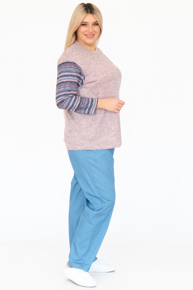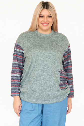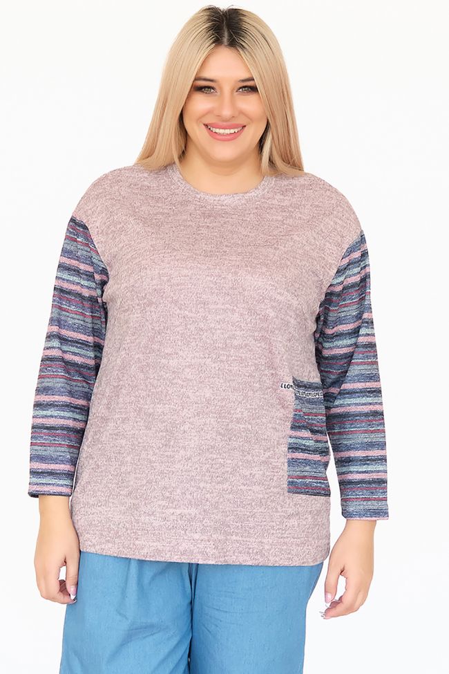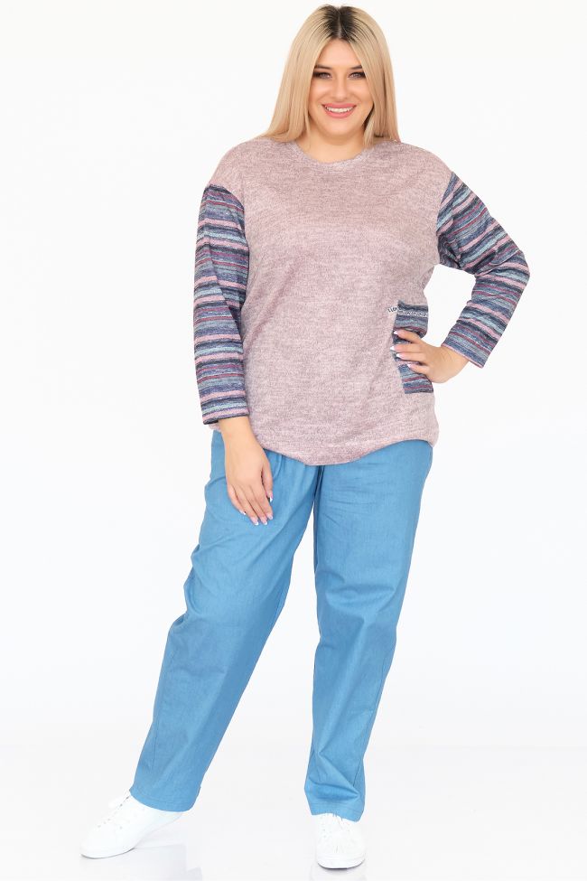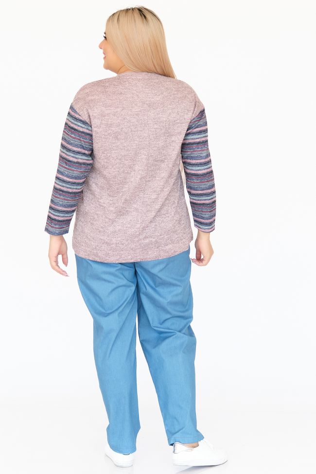 розовый Оригинальная туника свободного силуэта из комбинированного трикотажа. Круглый вырез горловины оформлен бейкой. Длинные рукава из отделочного трикотажа "яркие полосы" на спущенной линии плеча. По переду слева настрочная деталь в тон рукавам, в качестве отделки дополнена декоративной тесьмой. Низ ровный. Модель подойдет ко всем типам фигур.