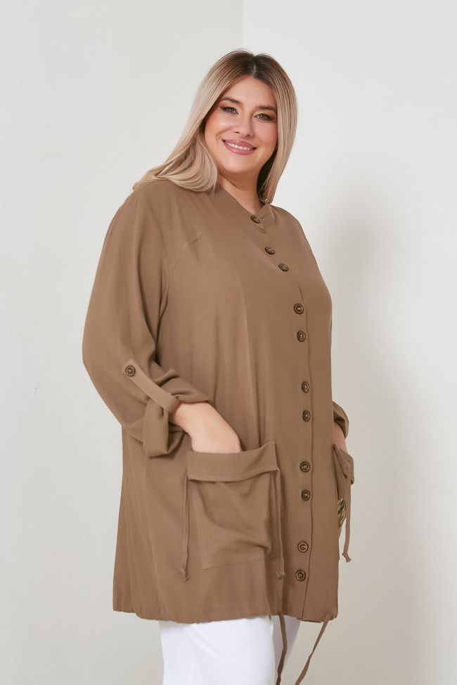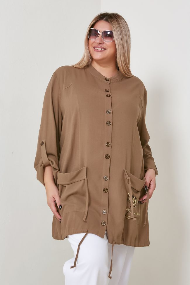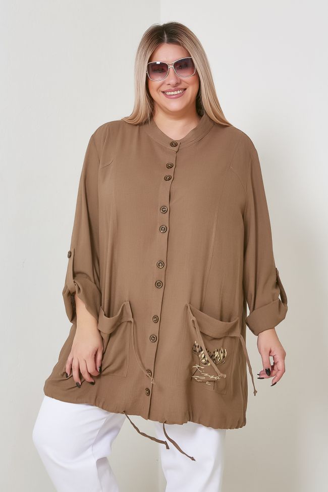 хаки Стильная туника прямого силуэта. Модель выполнена из льняной ткани приятной расцветки. Перед с вертикальными рельефами, на уровне бедер дополнен большими накладными карманами с отворотами и завязками на концах. Верхняя часть спинки оформлена кокеткой и диагональными вставками от горловины к пройме. Круглый вырез горловины оформлен воротником стойкой, застежка центральная, на петли и пуговицы. Рукав длинный втачной по центру дополнен патой с застежкой на петлю и пуговицу. По центру спинки внизу фигурный вырез, низ изделия с кулиской. Оригинальным дизайнерским решением является печатный рисунок на спинке и на левом кармане, а также контрастные пуговицы в тон рисунка.