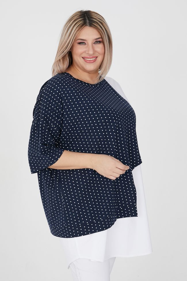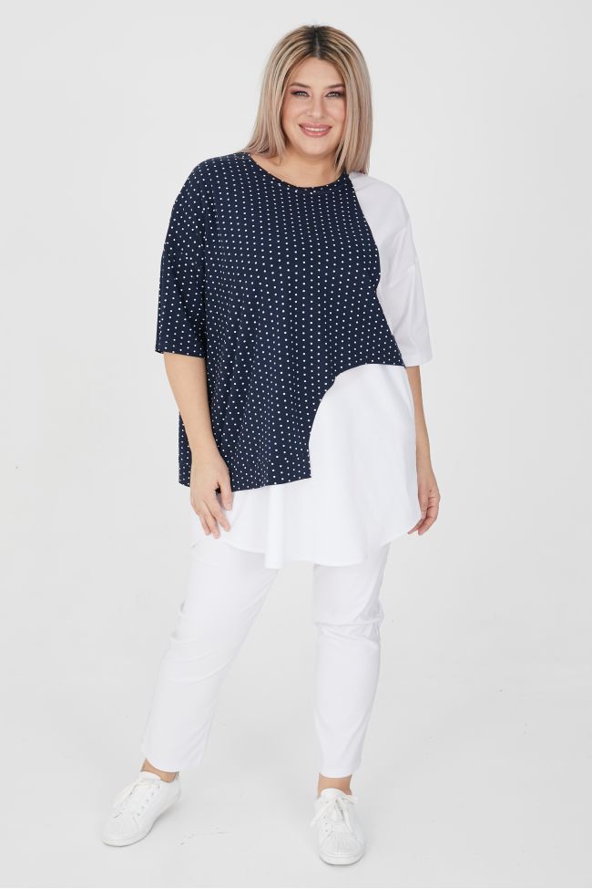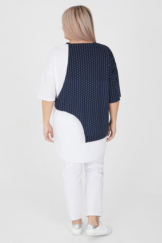 белый Оригинальная комбинированная туника прямого силуэта. Круглый вырез горловины оформлен бейкой. Перед и спинка нижнего слоя выполнены из сорочечной однотонной ткани. Верхний слой переда и спинки укороченный, выполнен из трикотажа принт «горох», слева имеет фигурный вырез интересно открывая левую часть изделия. Рукава втачные укороченные, правый рукав выполнен из трикотажа, левый из сорочечной ткани. Нижний слой с актуальным закруглением по низу. Модель составит гармоничный комплект узким брюкам.