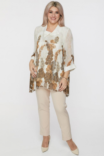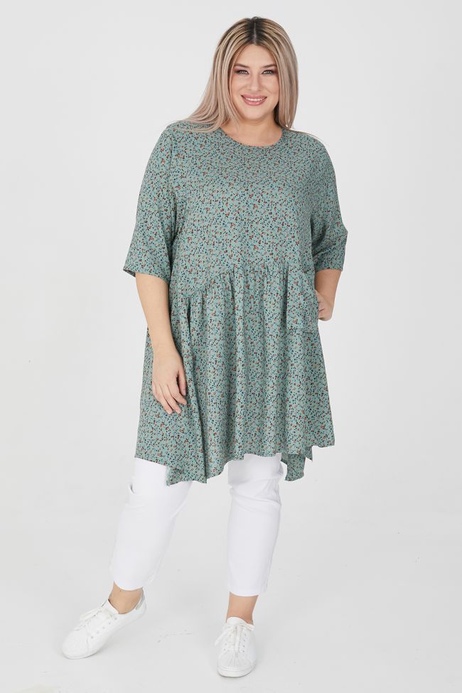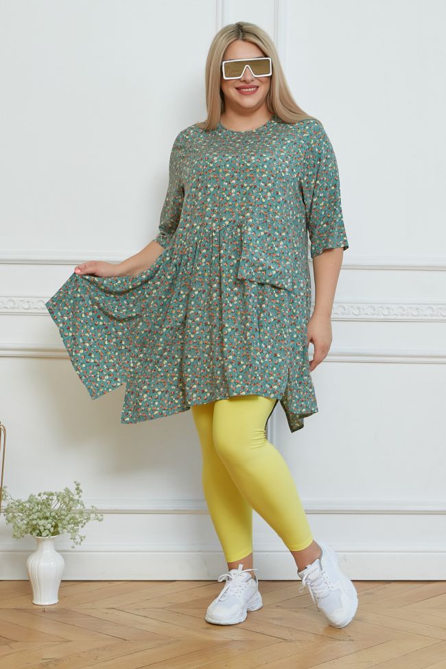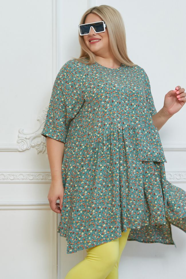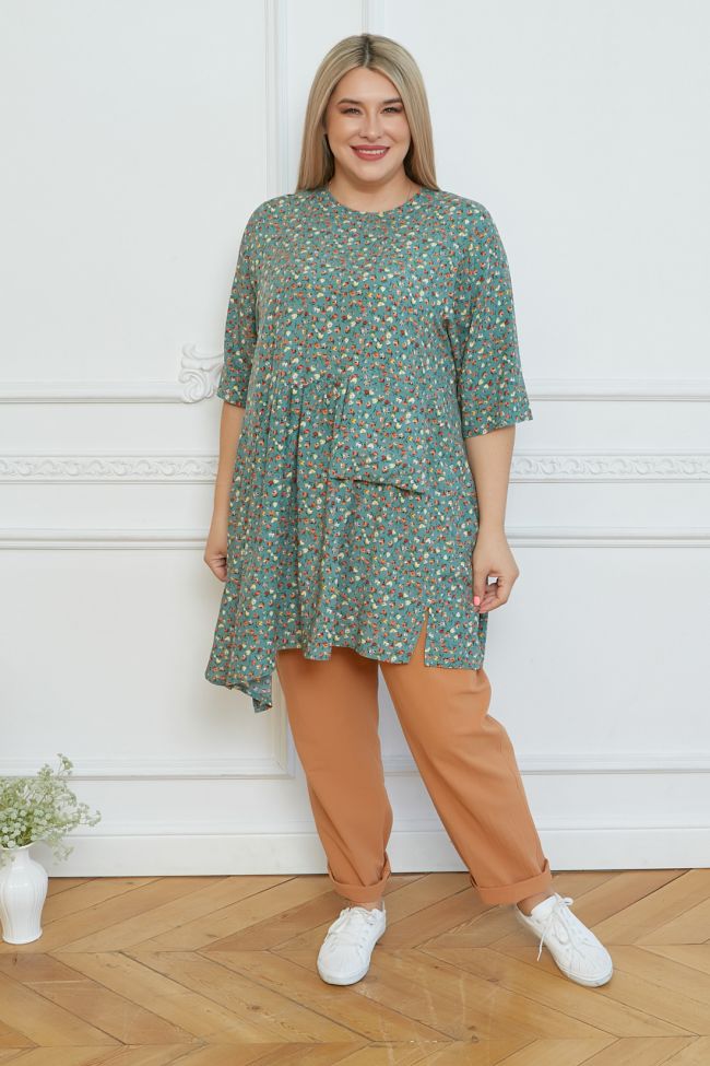 зеленый Туника свободного силуэта из штапеля в мелкий принт. Перед и спинка с диагональным подрезом, дополненным сборкой и вертикальными вставками с расширением к низу. По переду, слева в шве подреза, подвесной карман. Круглый вырез горловины обработан окантовкой. Рукав втачной укороченной длины, с заниженной проймой. Низ асимметричный, с разрезами в швах вставок.