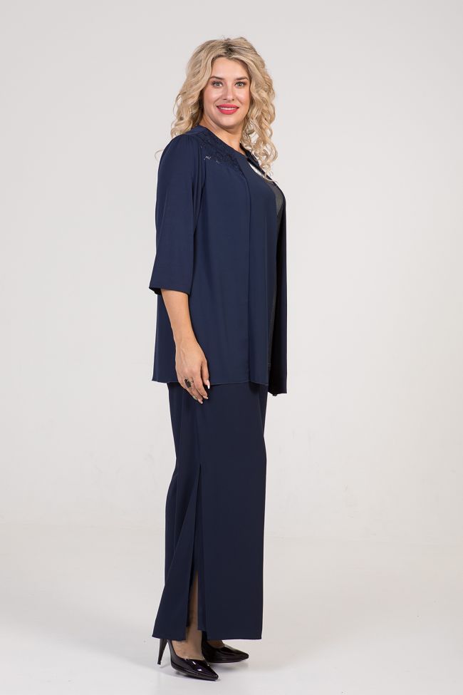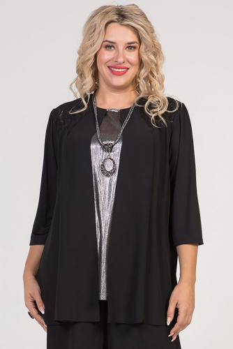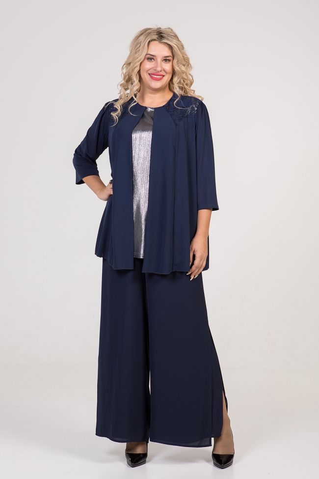 темно-синий Стильная комбинированная туника прямого силуэта. Перед двойной, с иммитацией топа и жакета: нижний слой  выполнен из люрексного трикотажного полотна, верхний слой шифон с кружевной кокеткой. Спинка свободная выполнена из шифона, с центральным швом и застежкой на петлю и пуговицу. Втачные рукава из пластичного трикотажа "масло" удобной длины, чуть за локоть.  Круглый вырез горловины обработан внутренней обтачкой.  Низ ровный, обработан закруткой. Отличный вариант для торжественных встреч.